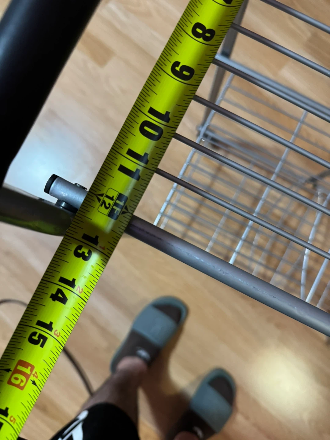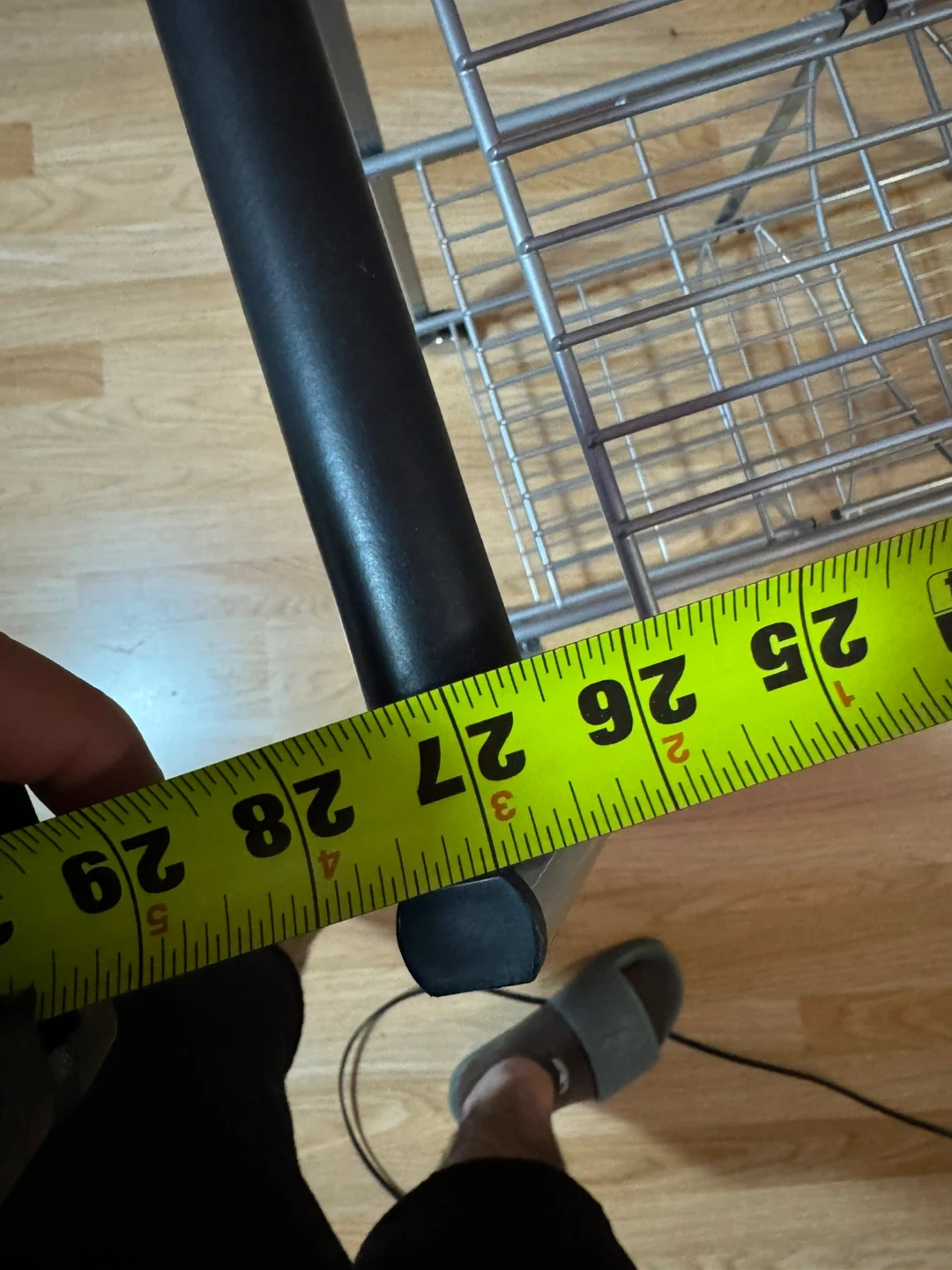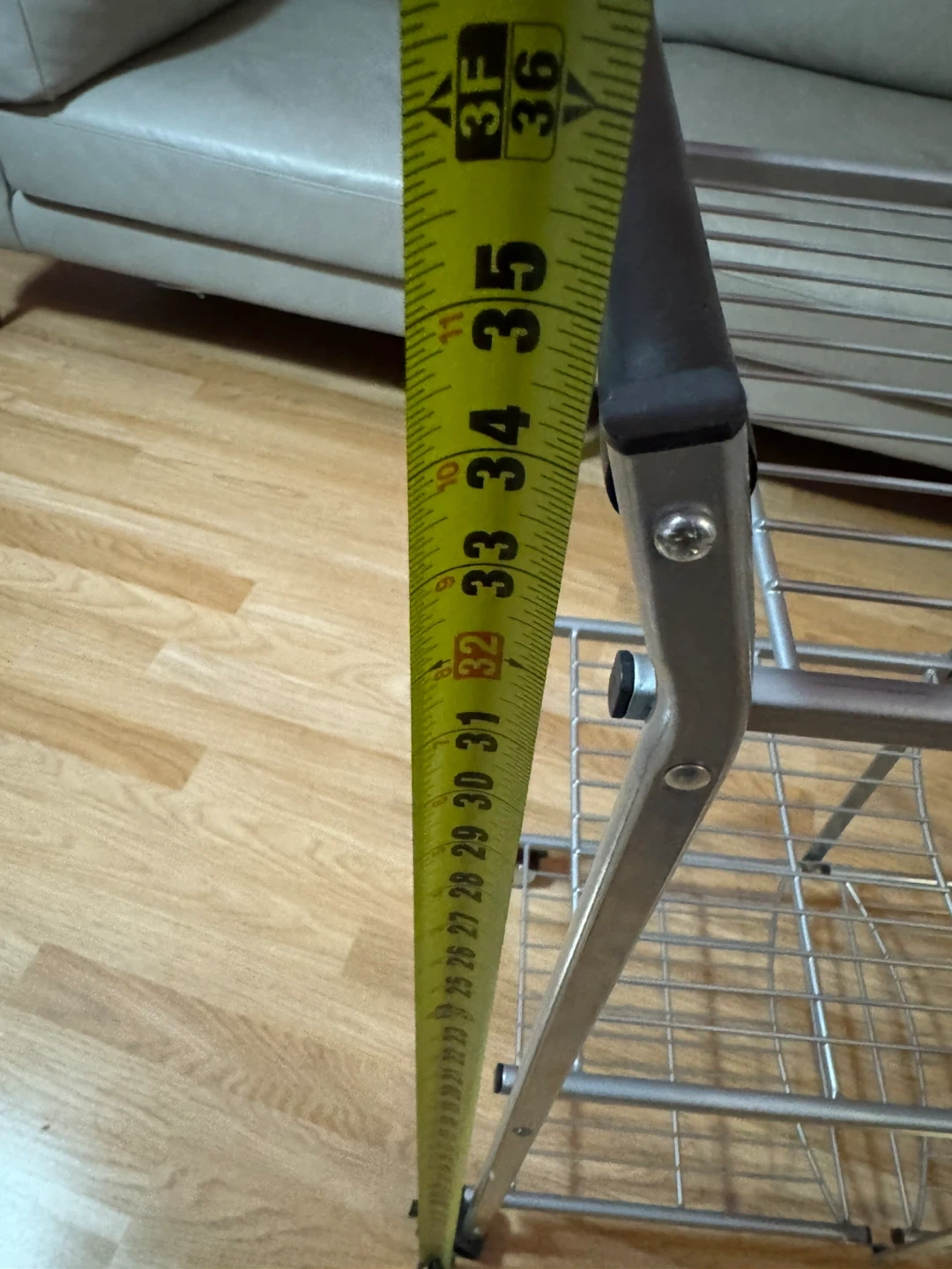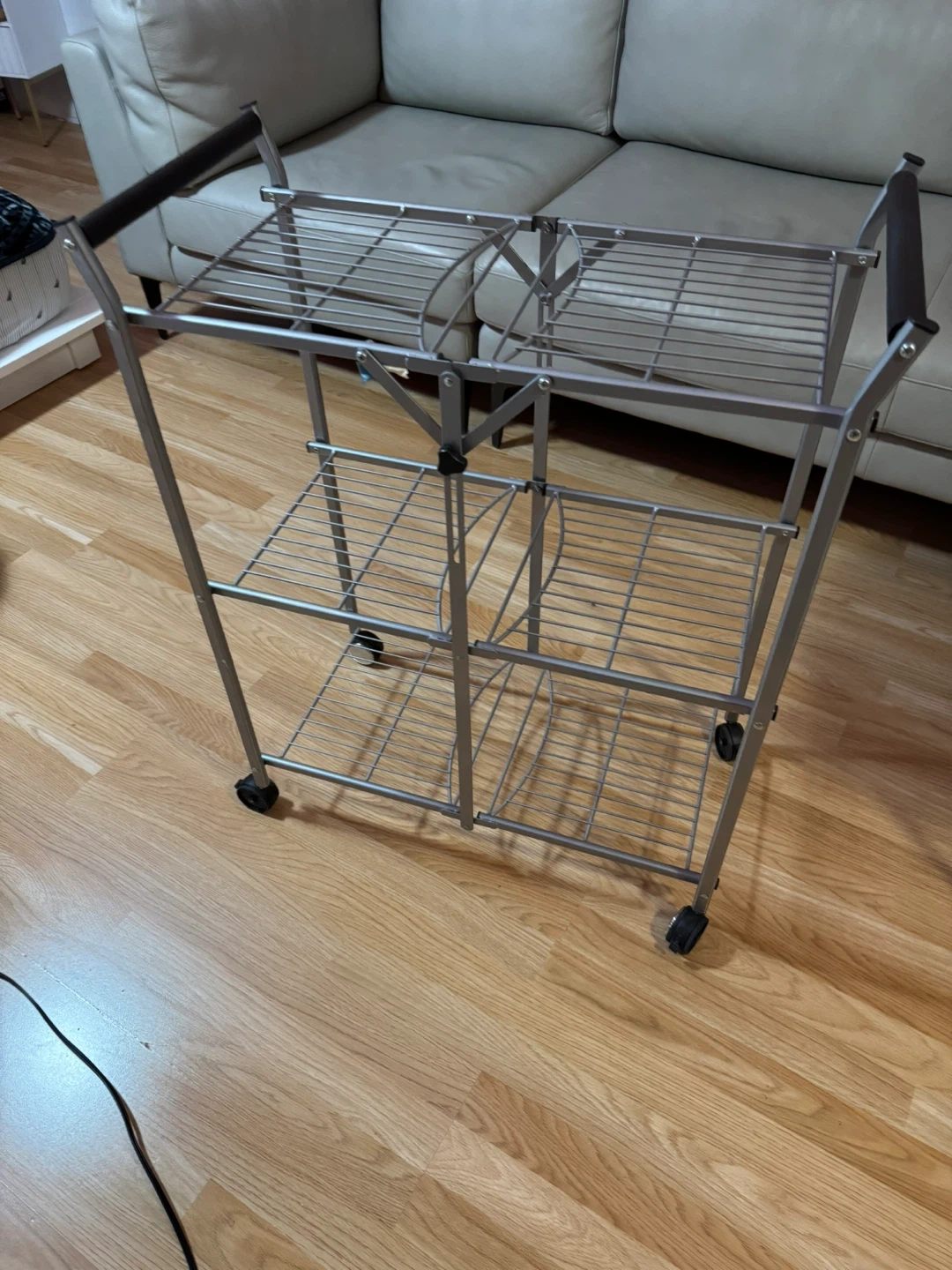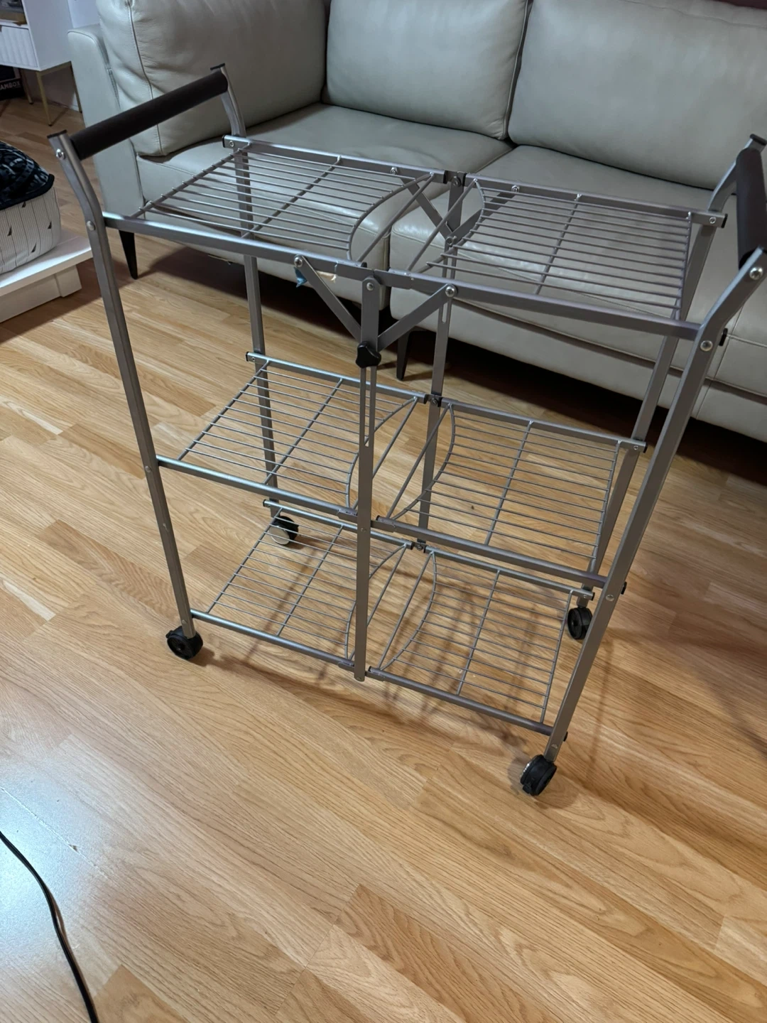 This silver rolling cart features three wire shelves for storage. It has black handles on top and casters for easy mobility. Dimensions are approximately 27 inches long, 16 inches wide, and 35 inches high.
