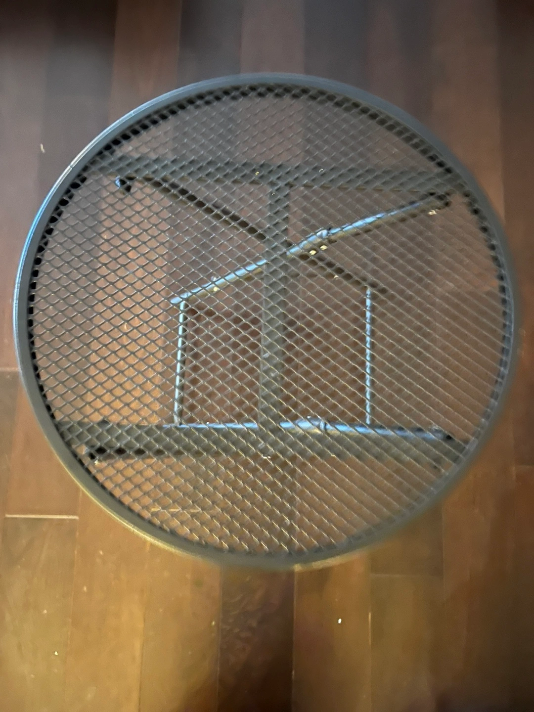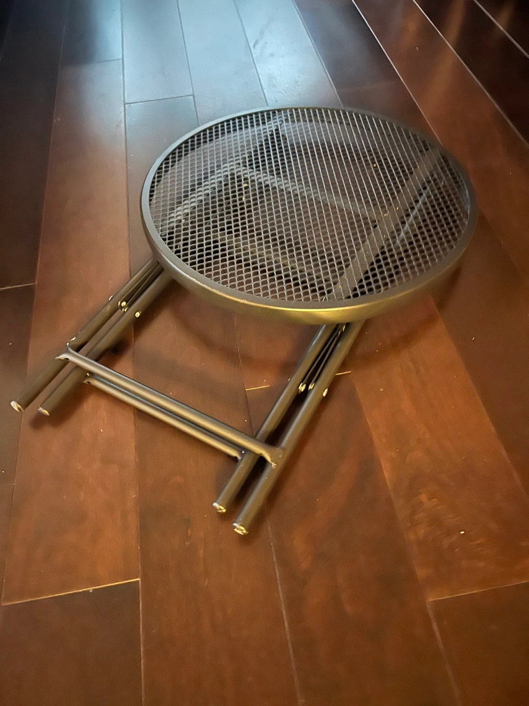 Small round metal side table. Black metal frame and mesh top. Folds flat for easy storage. Perfect for small spaces.