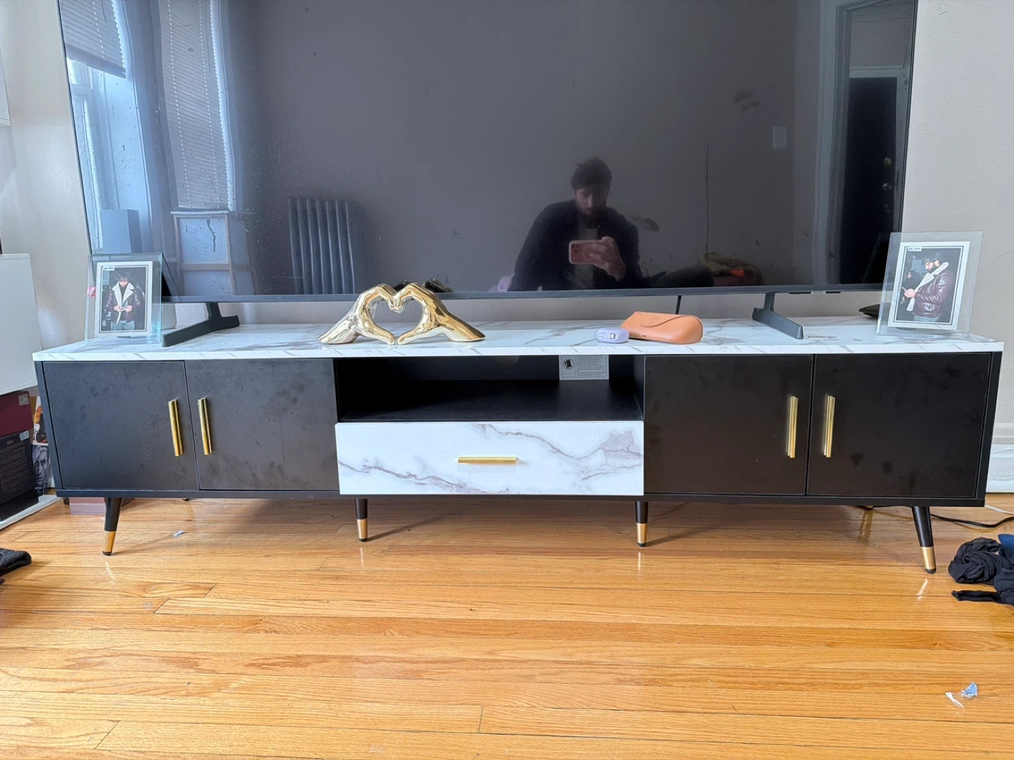 Stylish media console featuring a white marble-patterned top and black cabinetry with gold accents. It has two doors and a central drawer for storage. The angled legs add a retro touch. This stand is 75 inches wide and perfect for living rooms.