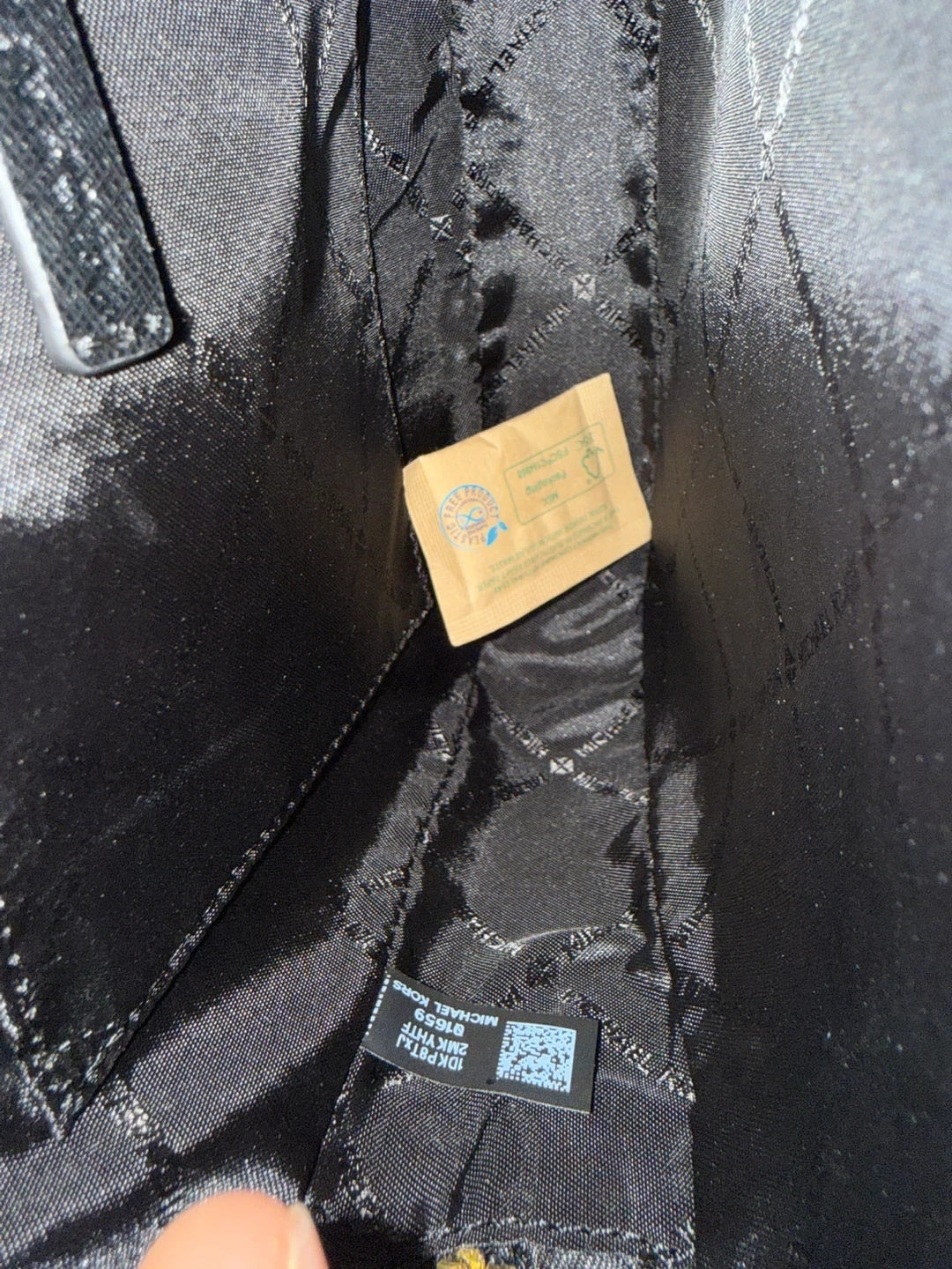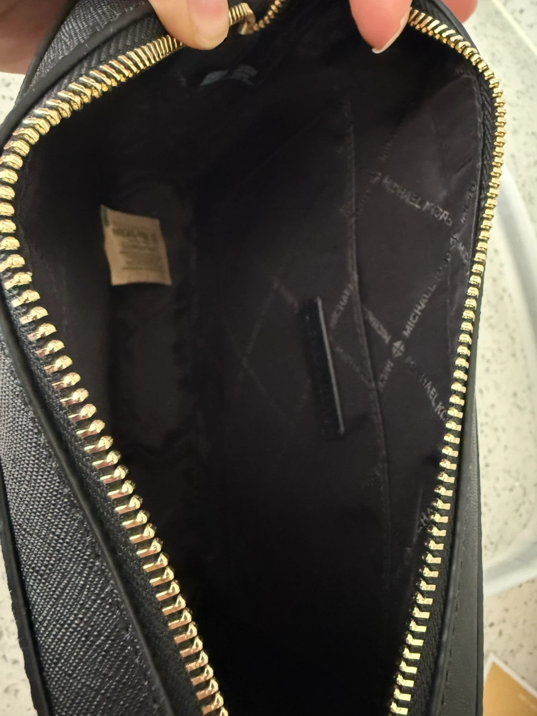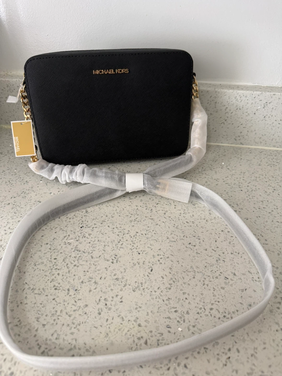 Black leather crossbody bag by Michael Kors. It's a compact size, perfect for essentials. Features a zip-top closure and adjustable strap. Comes with original tags.