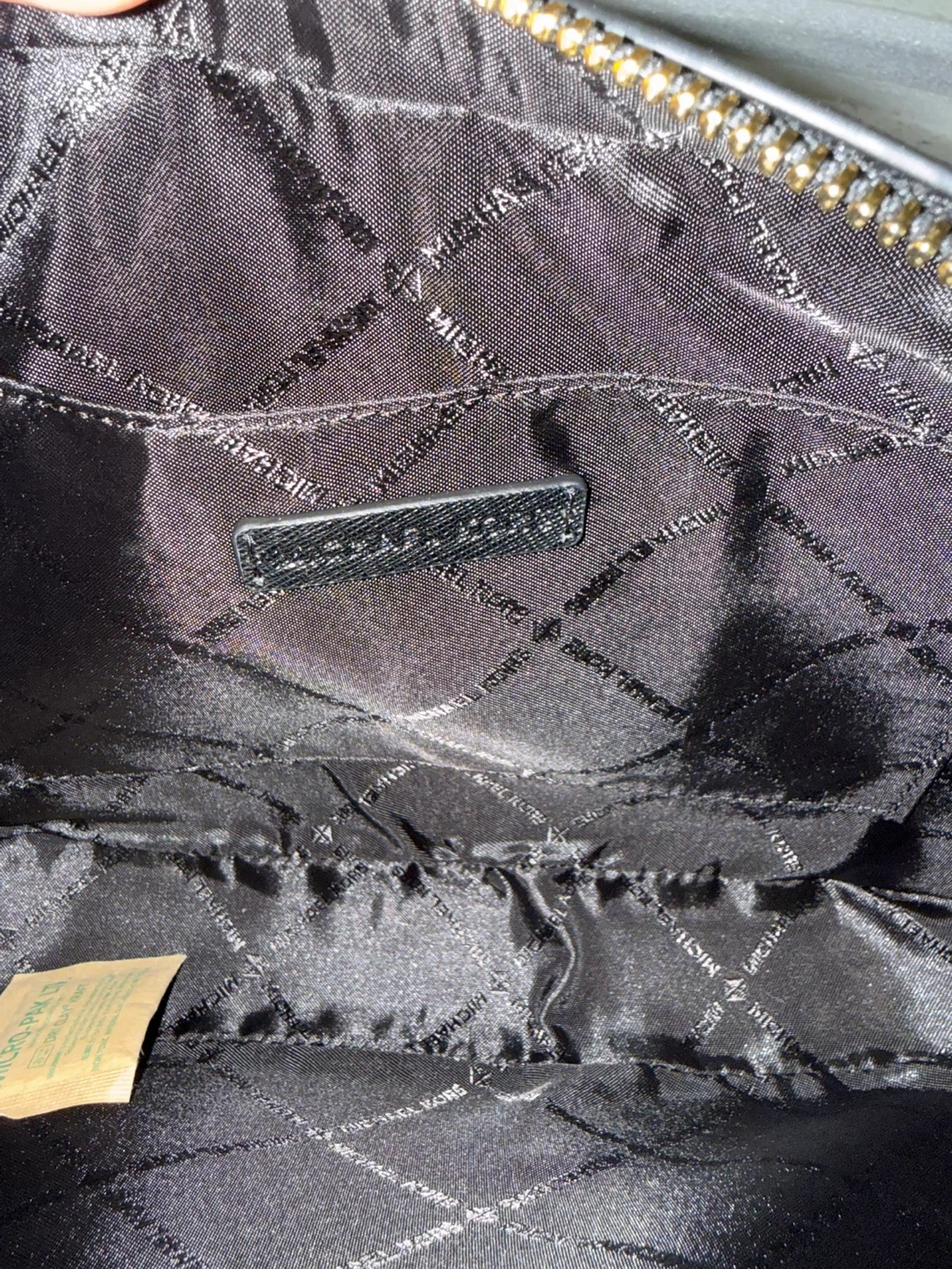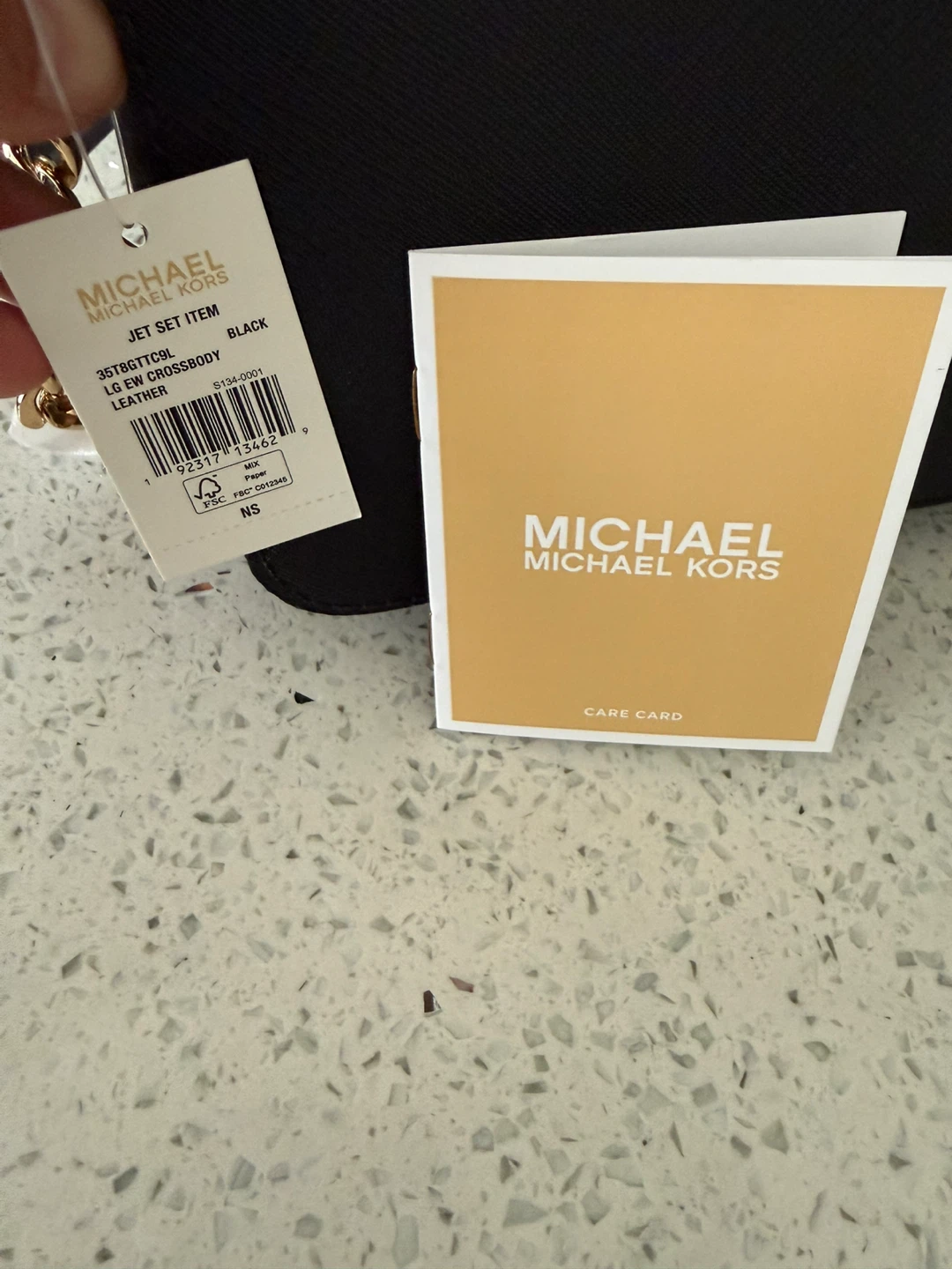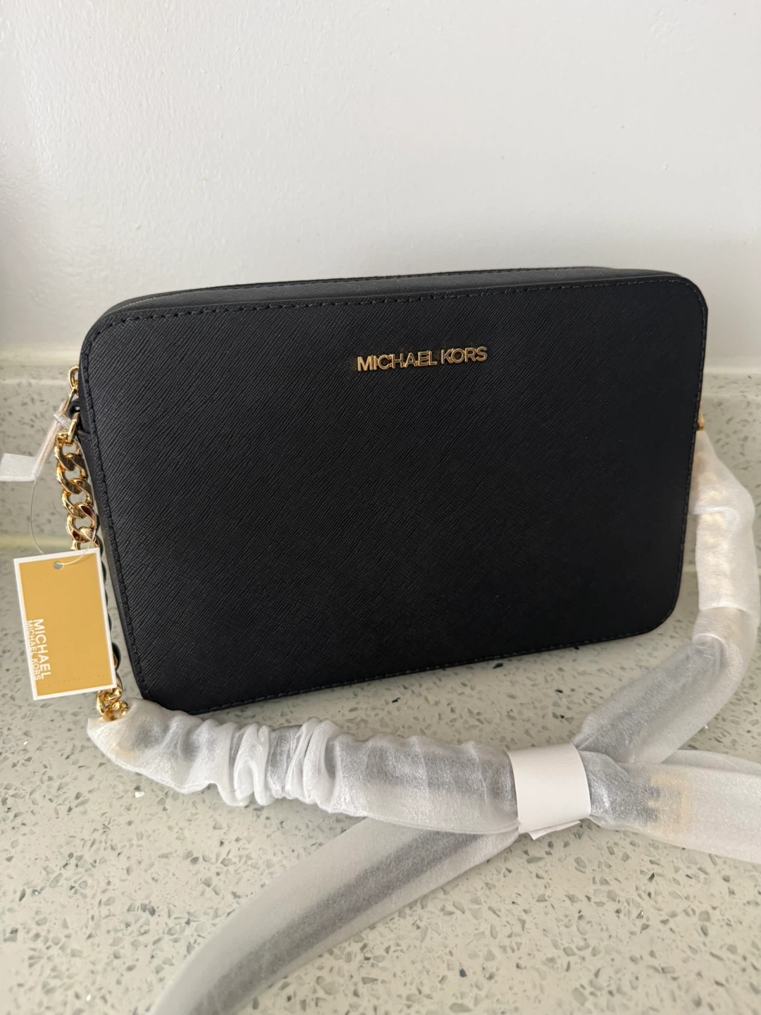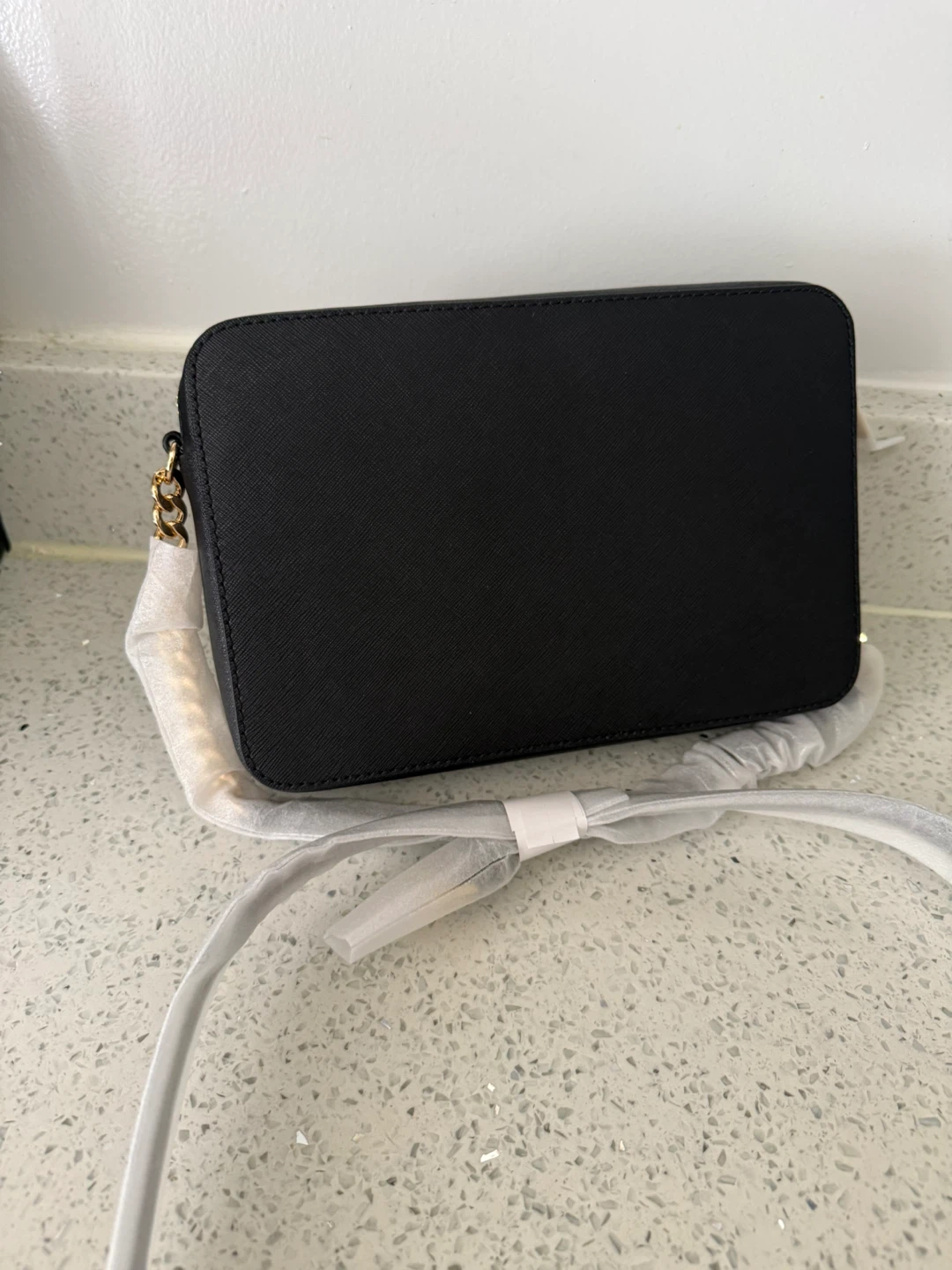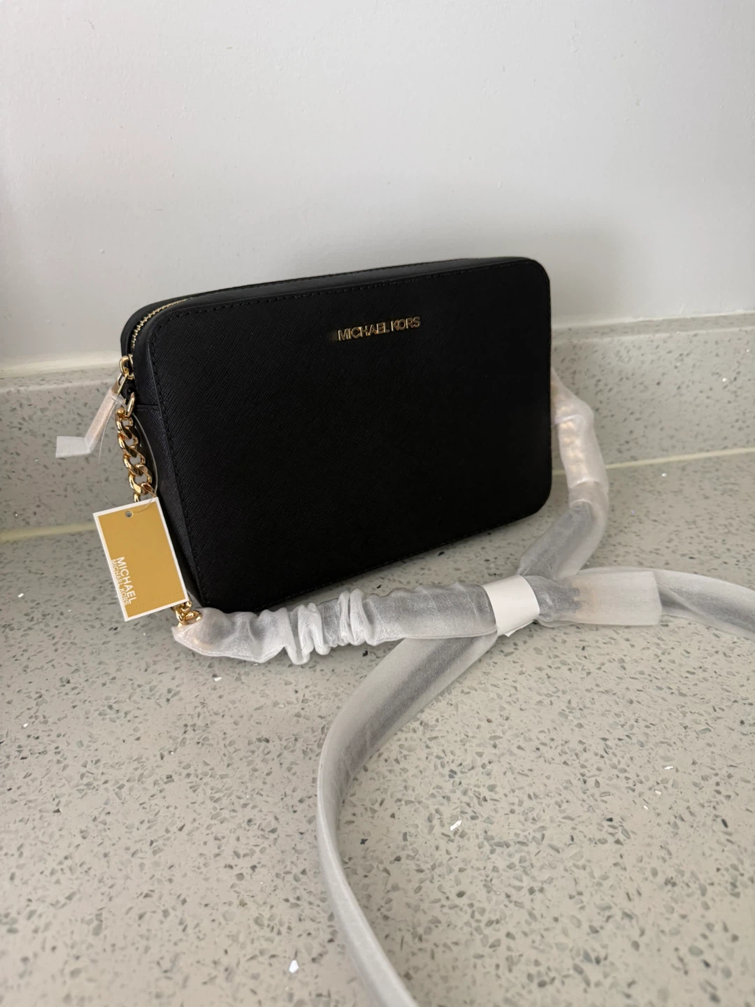 Black leather crossbody bag by Michael Kors. It's a compact size, perfect for essentials. Features a zip-top closure and adjustable strap. Comes with original tags.