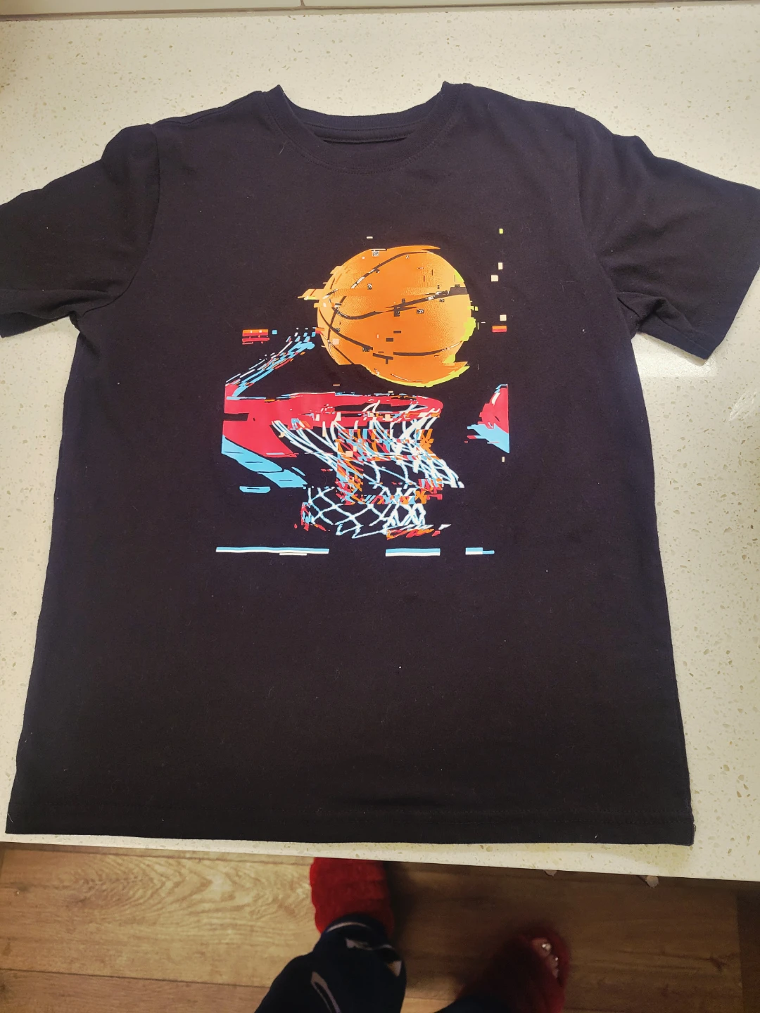 This Xersion t-shirt is made with 60% Cotton and 40% REPREVE Recycled Polyester. It's a Quick-Dry shirt. The graphic features a basketball going through a net. Great for active kids!