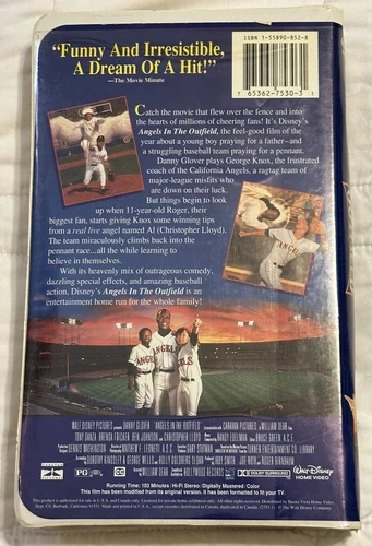 Catch the movie that flew over the fence and into the hearts of millions of cheering fans! It's Disney's Angels In The Outfield, the feel-good film of the year about a young boy praying for a father and a struggling baseball team praying for a pennant. Danny Glover plays George Knox, the frustrated coach of the California Angels, a ragtag team of major-league misfits who are down on their luck. But things begin to look up when 11-year-old Roger, their biggest fan, starts giving Knox some winning tips from a real live angel named Al (Christopher Lloyd). The team miraculously climbs back into the pennant race... all the while learning to believe in themselves. With its heavenly mix of outrageous comedy, dazzling special effects, and amazing baseball action, Disney's Angels In The Outfield is an entertainment home run for the whole family!