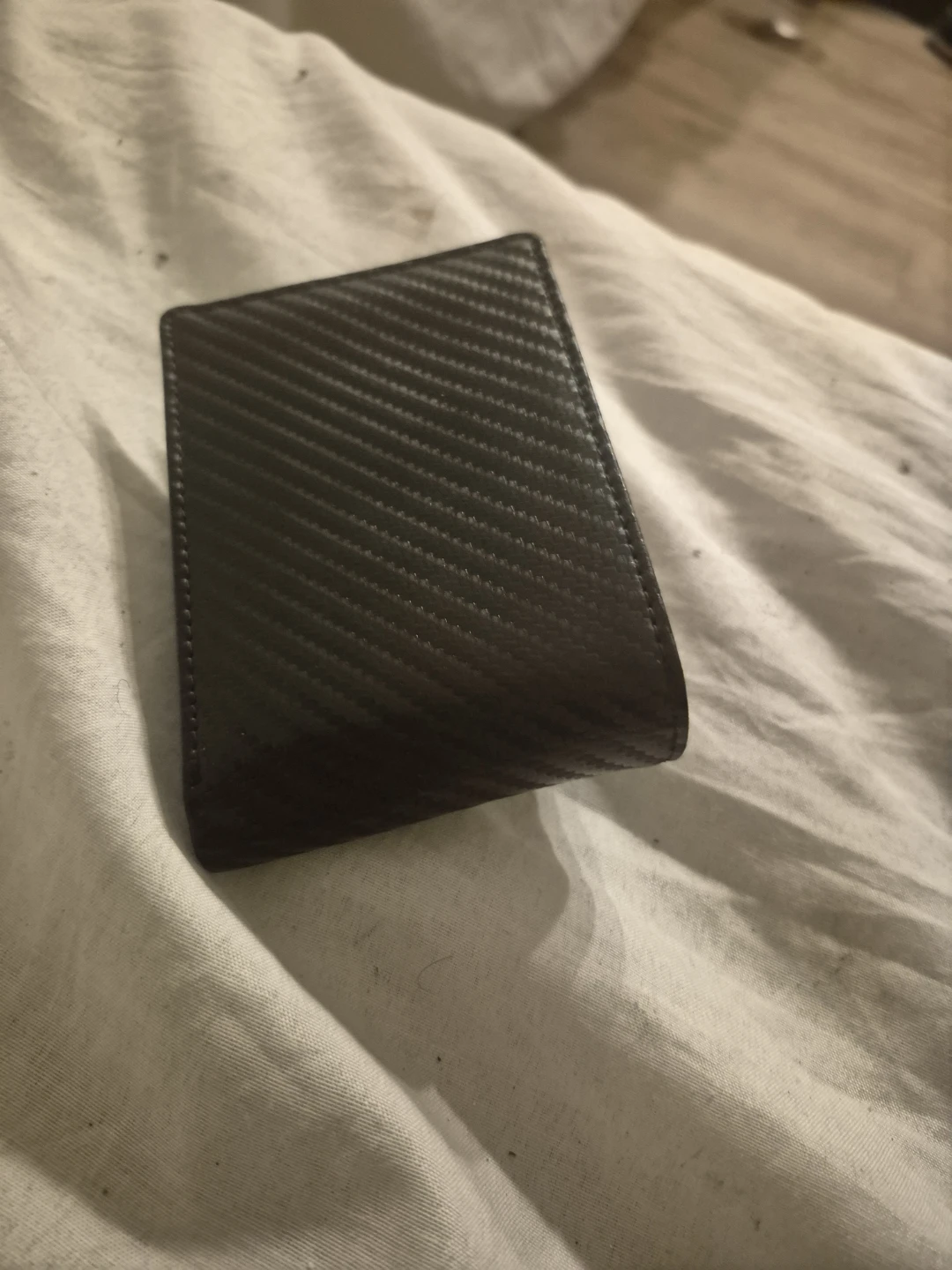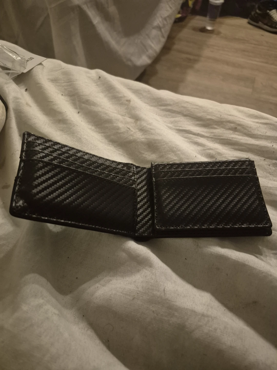 Selling a black carbon fiber wallet. It's in good condition and ready for a new owner! It has a sleek design and is perfect for everyday use