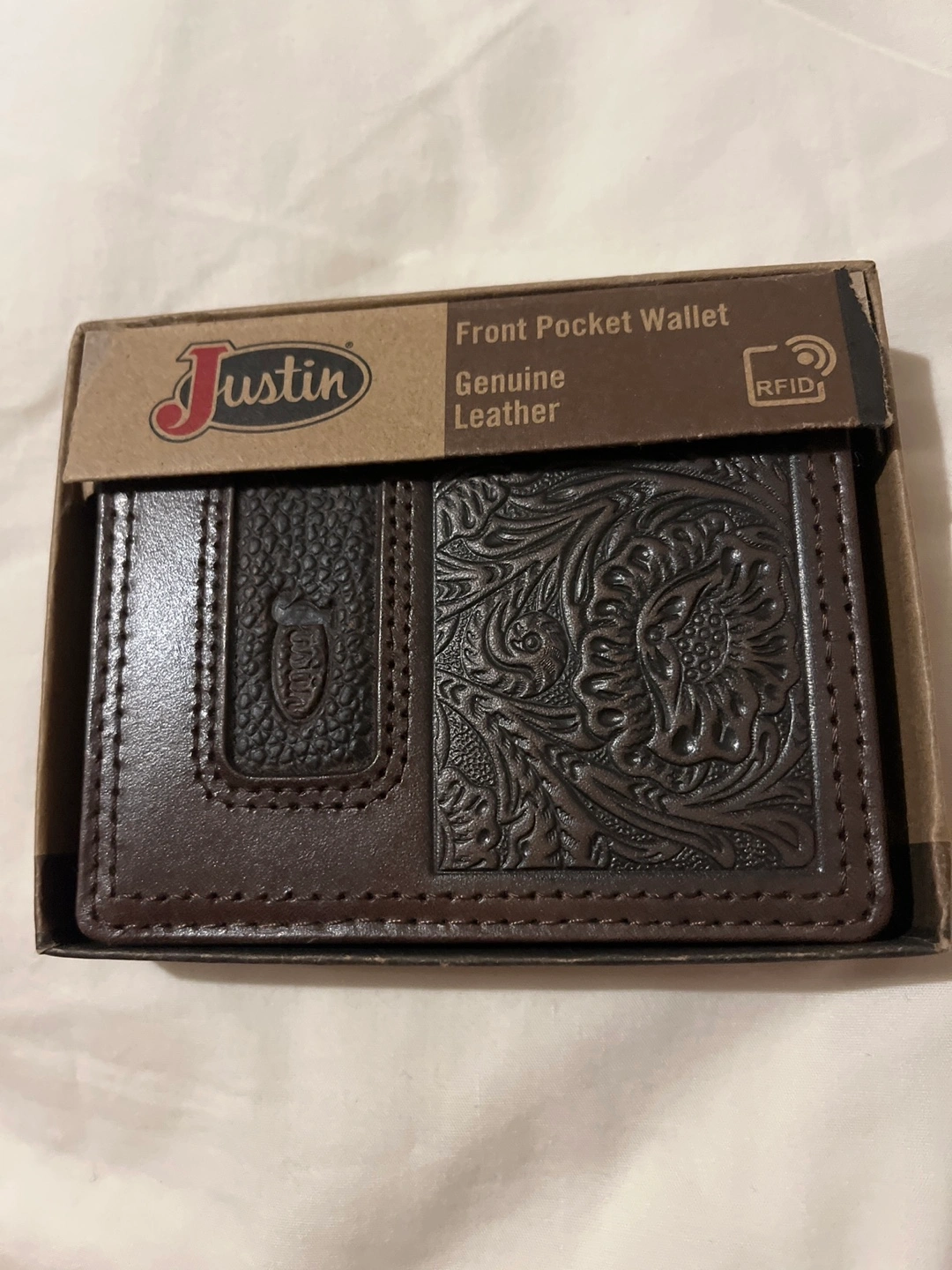 New Justin brand wallet. Genuine leather. Front pocket design. RFID blocking. Brown color. Embossed floral details. Slim design.