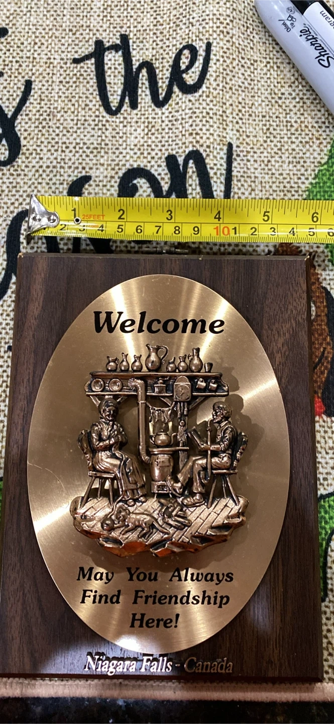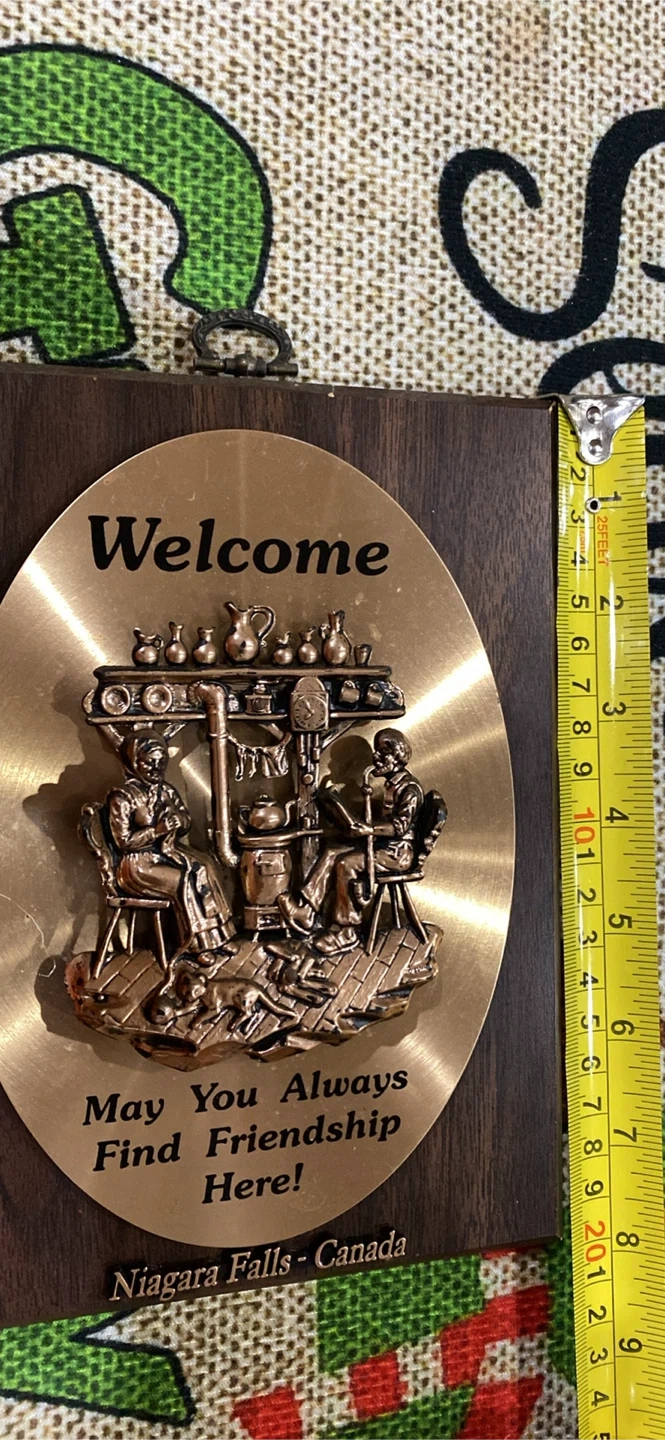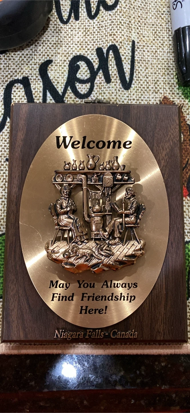 20This is a decorative plaque from Niagara Falls, Canada. It features a welcome message and a detailed scene. May you always find friendship here!