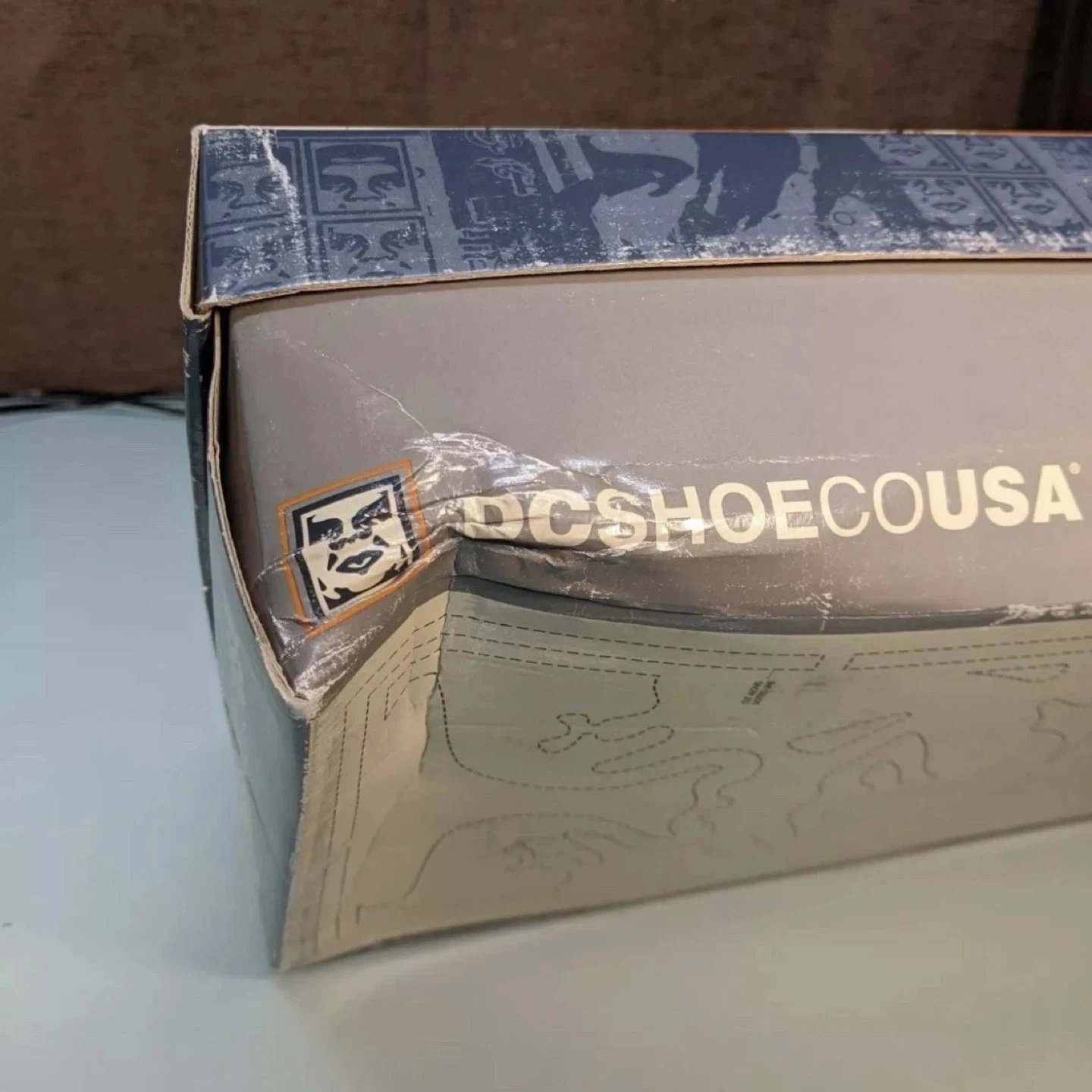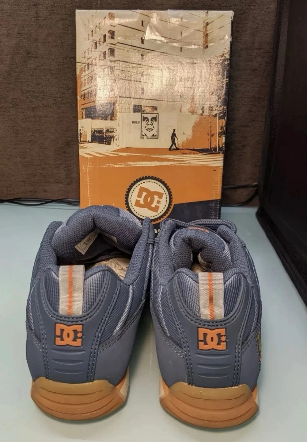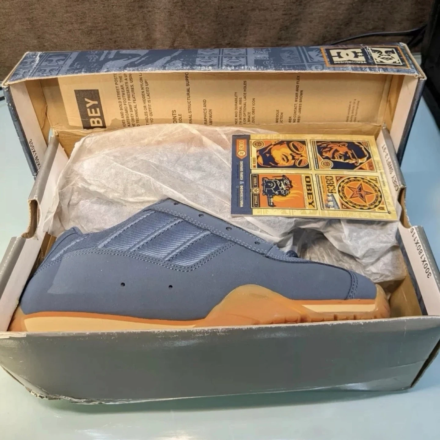 BRAND NEW NEVER WORN IN BOX DC Shoes Swift X Obey Slate Blue Size 7.5 2001. Slight markings on outside of left sneaker shown in picture # 9. Could be from factory or movement of sneakers inside box. Box has damage and creasing as shown in picture # 10. Purchased from another seller, and they really are in brand new never worn AMAZING condition! Has original tags, laces, and insoles along with promotion paperwork. Unfortunately they’re a half size too small for my women’s sized feet which I thought might happen. So sad! Great sneaker for any street art or Shepard Fairey fan, features the classic OBEY face that evolved from the original Andre the Giant Has a Posse stickers of Shep’s youth.