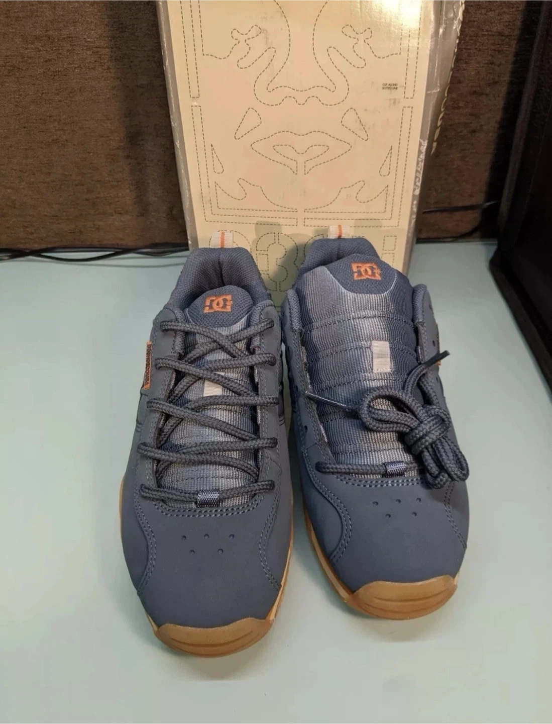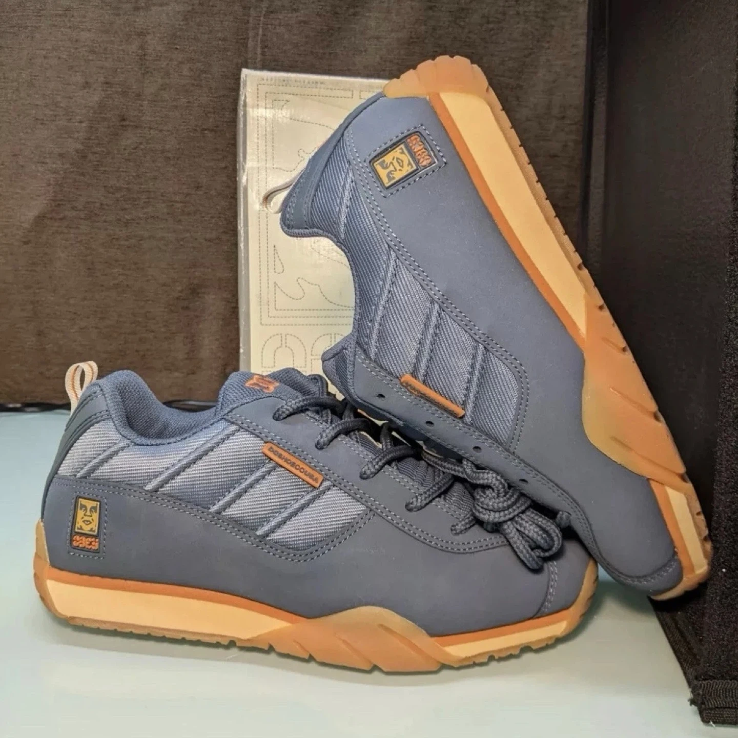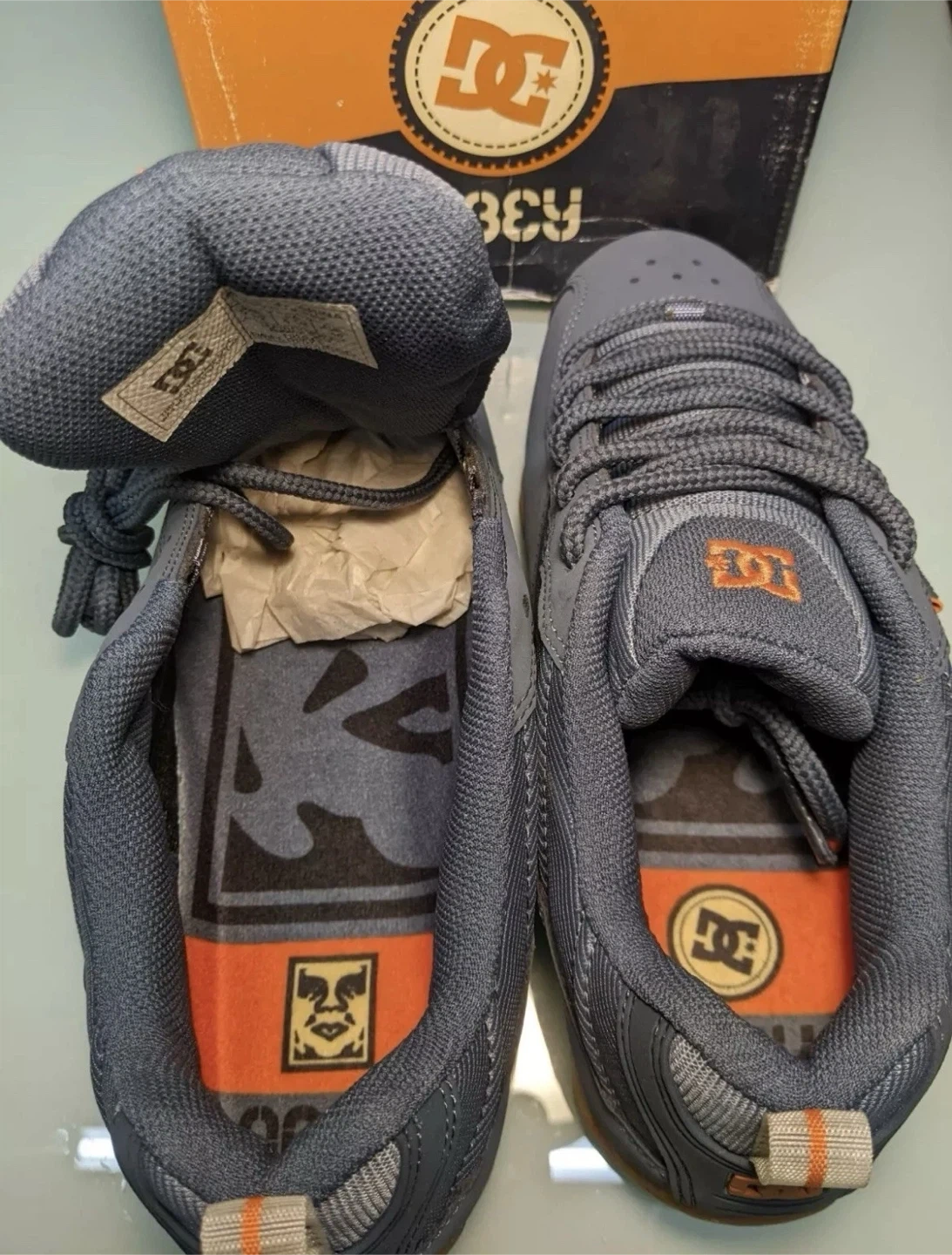 BRAND NEW NEVER WORN IN BOX DC Shoes Swift X Obey Slate Blue Size 7.5 2001. Slight markings on outside of left sneaker shown in picture # 9. Could be from factory or movement of sneakers inside box. Box has damage and creasing as shown in picture # 10. Purchased from another seller, and they really are in brand new never worn AMAZING condition! Has original tags, laces, and insoles along with promotion paperwork. Unfortunately they’re a half size too small for my women’s sized feet which I thought might happen. So sad! Great sneaker for any street art or Shepard Fairey fan, features the classic OBEY face that evolved from the original Andre the Giant Has a Posse stickers of Shep’s youth.