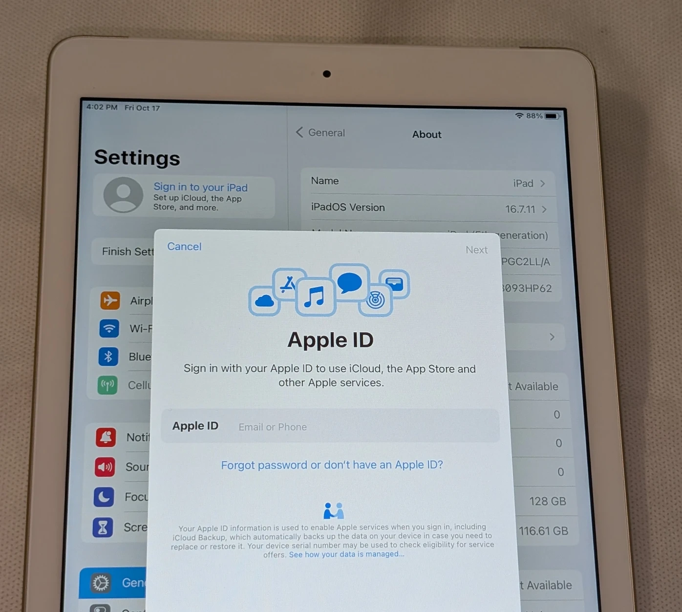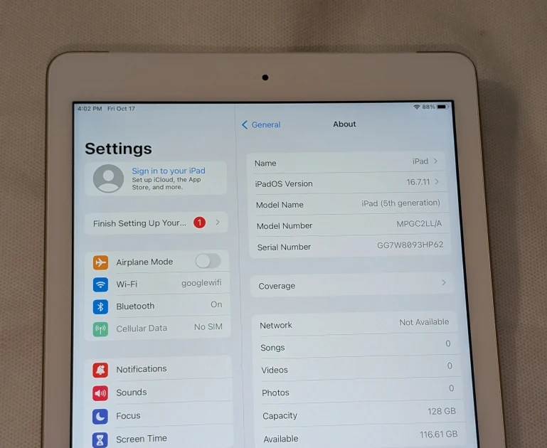 72Nice APPLE iPad 5 128GB WIFI PLUS 4G CELLULAR UNLOCKED iOS16 iPad works on WIFI AND 4G CELLULAR is UNLOCKED for all networks RUNNING iOS16 128GB STORAGE Everything works great, fully reset and ready for new user. Very Good condition Pickup in Maspeth Queens, public location. CASH SALE $115