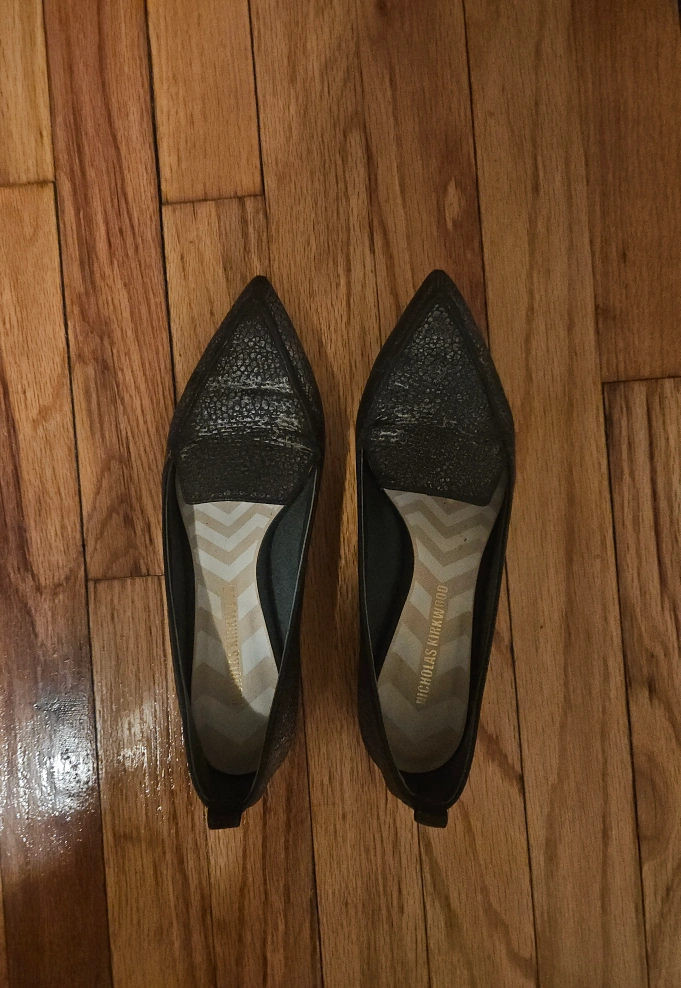 These are a pair of black flats from Nicholas Kirkwood. Color -Gun Metal Size -37. Used but in good condition.