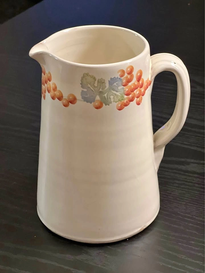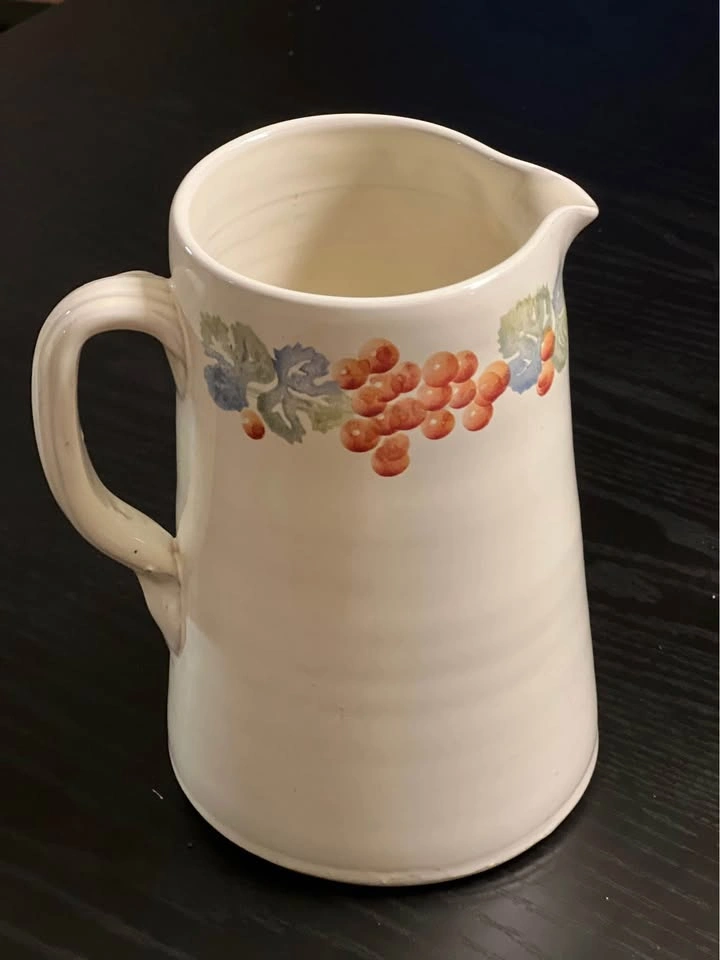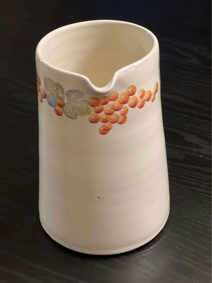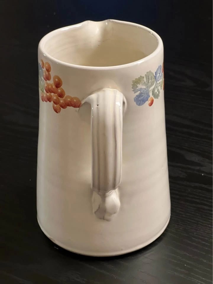 98This is a ceramic pitcher by Nicola Fasano. The company, Ceramiche Nicola Fasano, has been producing ceramics in Grottaglie, Italy, since 1968, and the family's ceramic tradition dates back to the 19th century. The pitcher features a fruit and leaf design, with some sources specifying it as a "berries and leaves" or "fruit trim" pattern. This particular style of pitcher was also sold by Williams Sonoma.