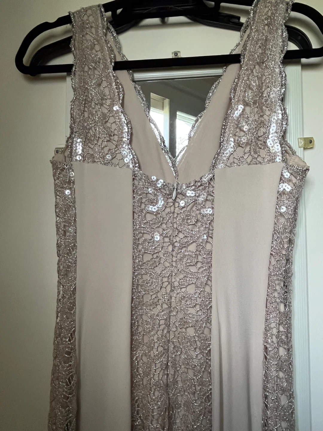 10Selling a beautiful Nicole Bakti dress in size M! The dress is made of 30% poly lace and 50% rayon. It features a lovely lace design with sequins. Perfect for a special occasion!