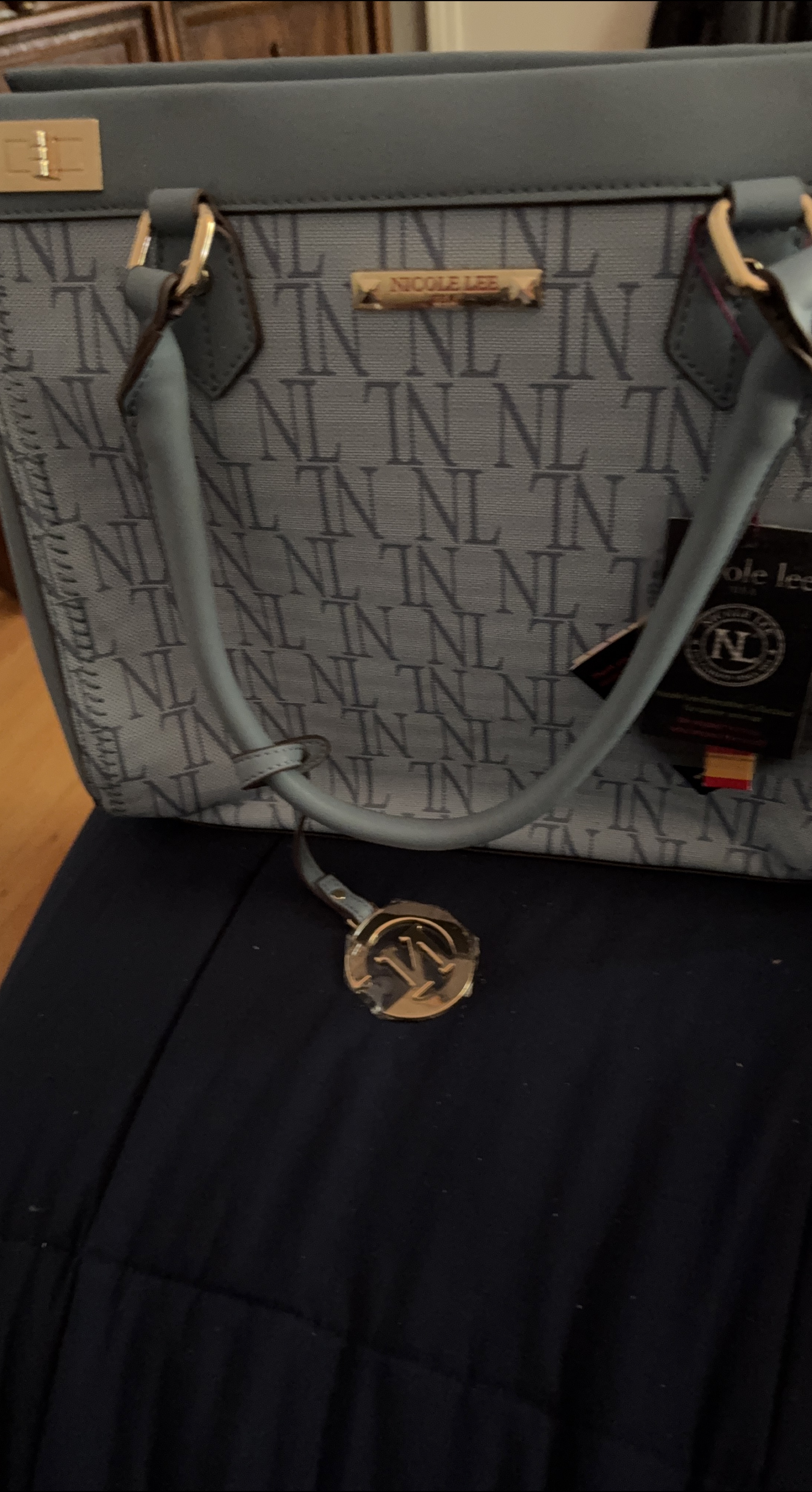 Light blue handbag with a repeating NL pattern. Features two handles and a charm with the logo. Great to have on your shoulder while enjoying a peaceful day out.