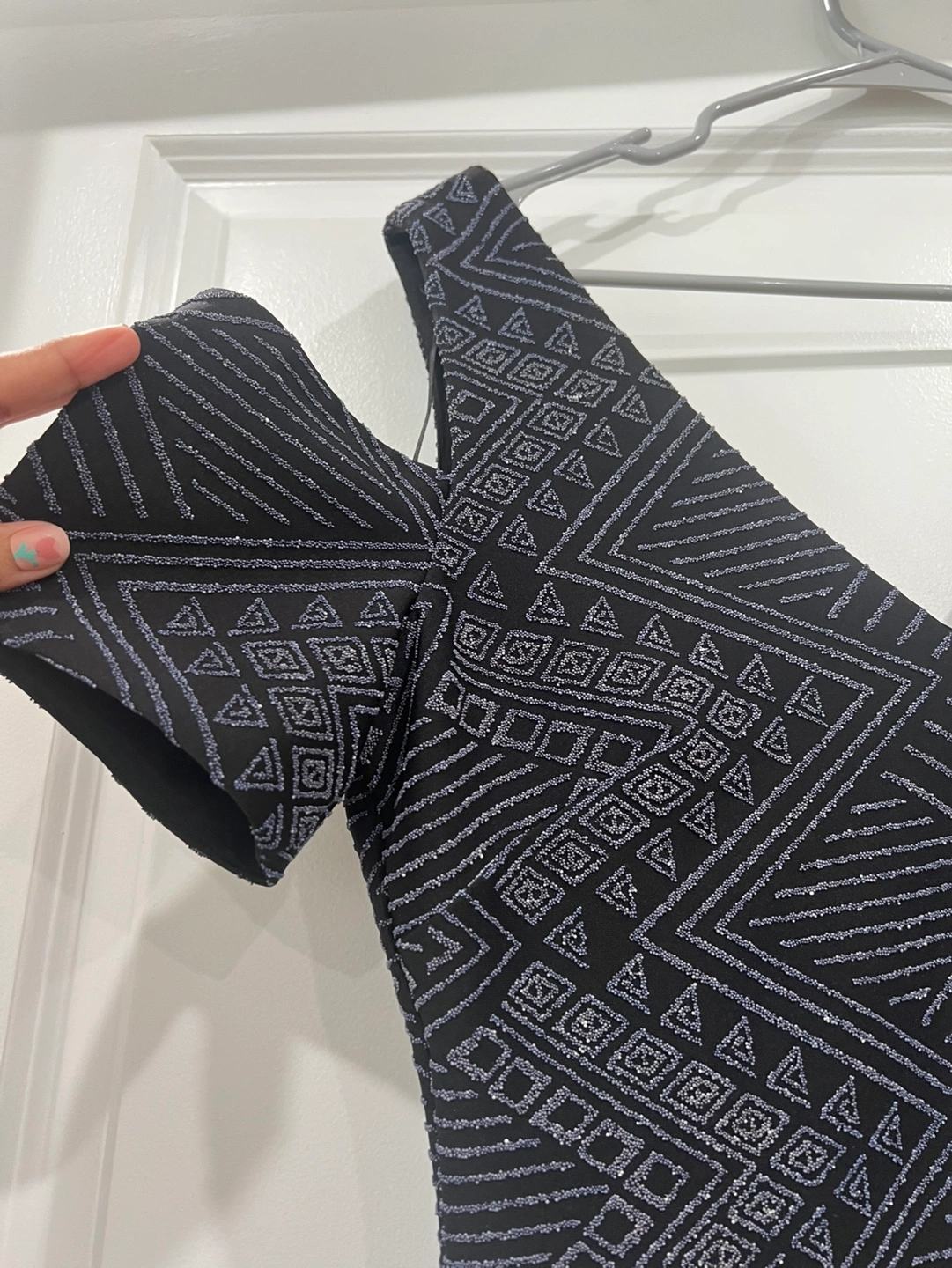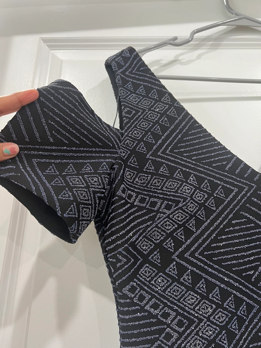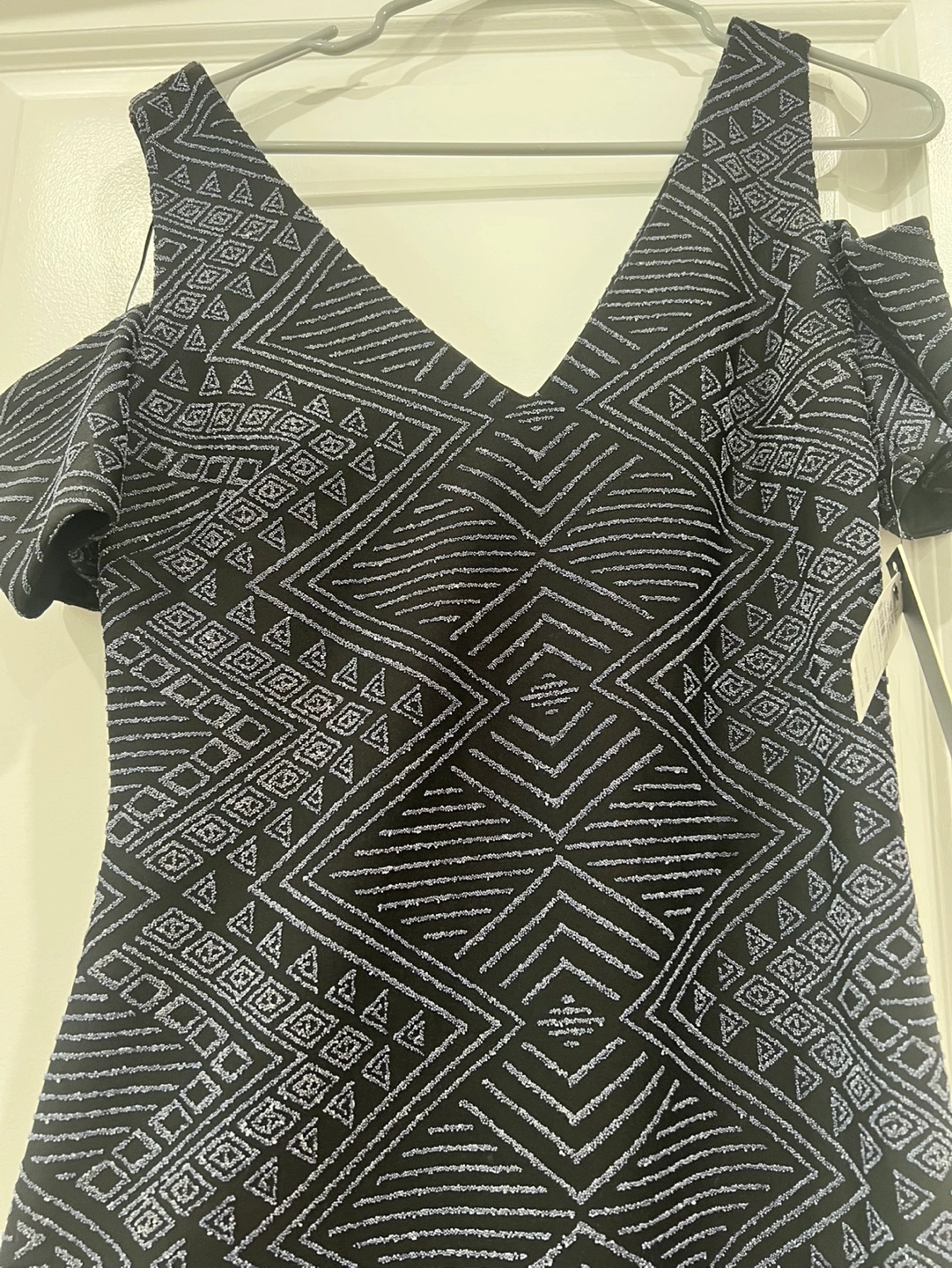 Black dress with silver geometric pattern work. Cold shoulder style, short sleeves, and a v-neckline.