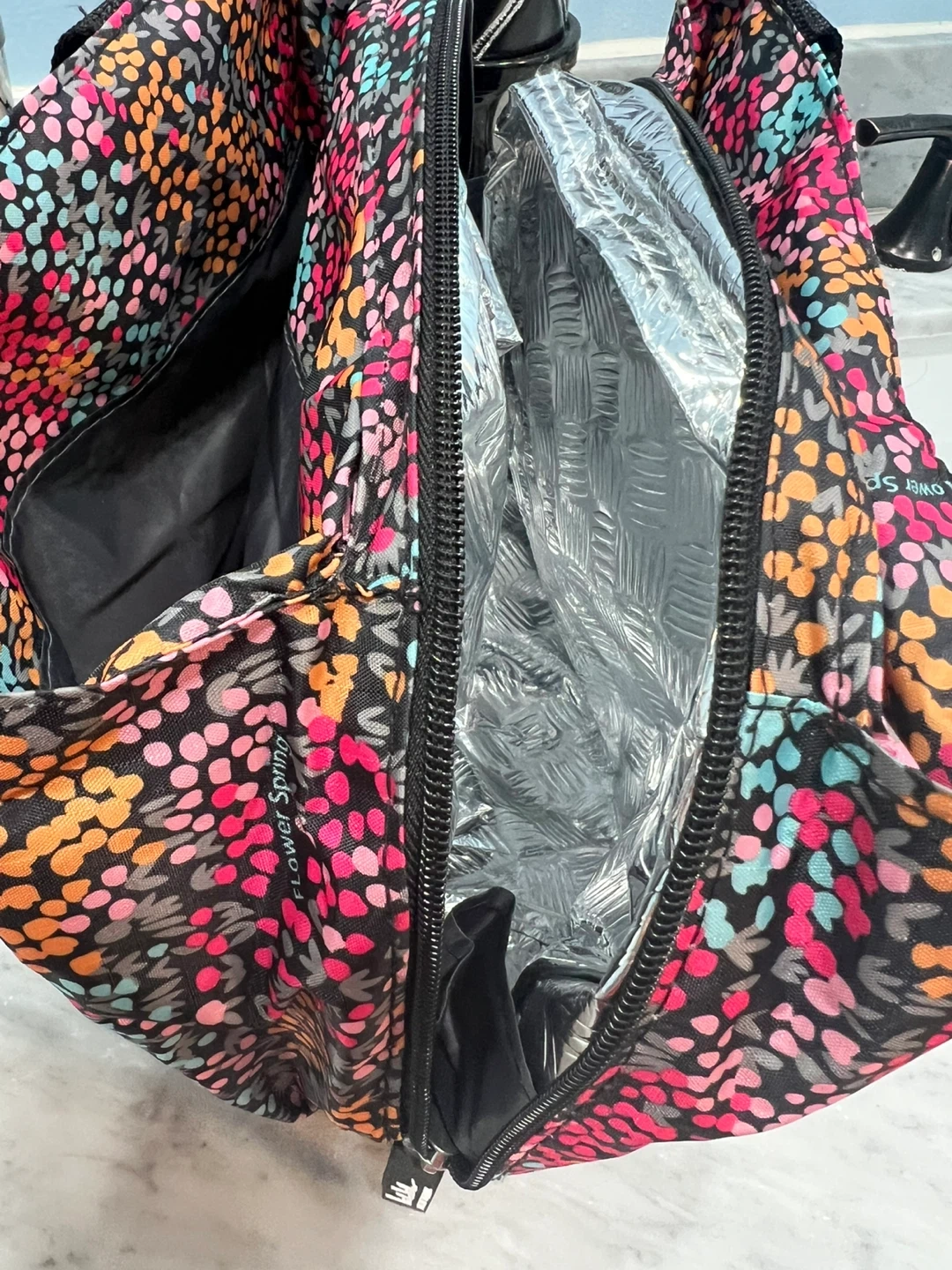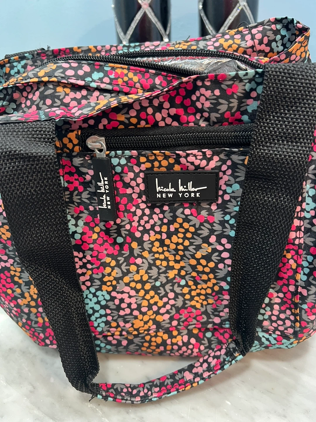 60This is a cute insulated lunch bag by nicole Miller New York. It has a floral pattern and black straps. Perfect for carrying your lunch!