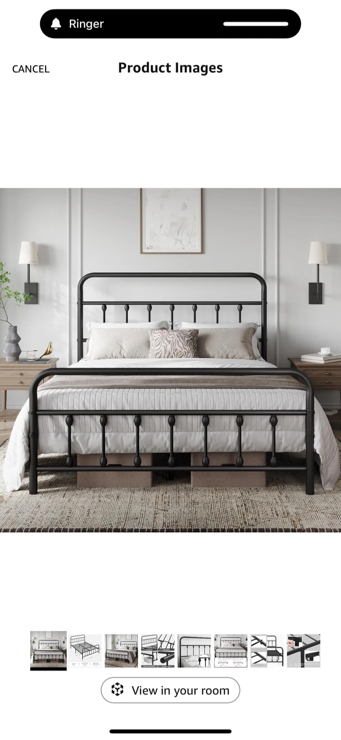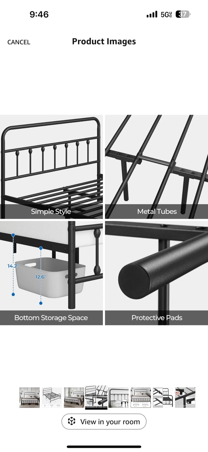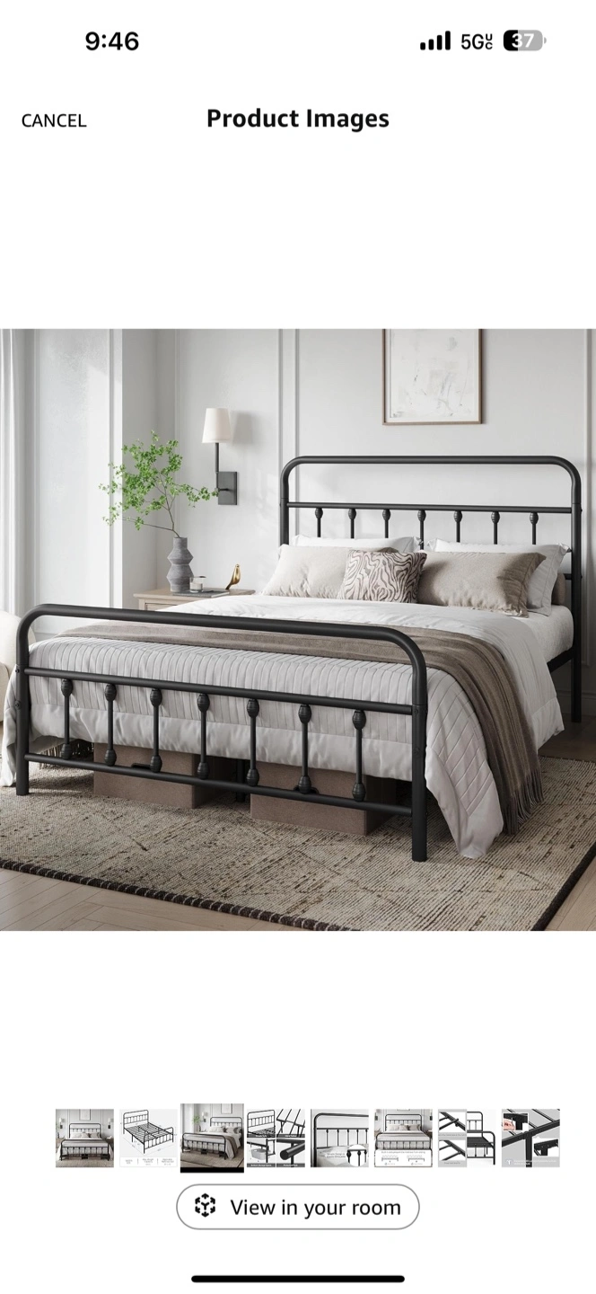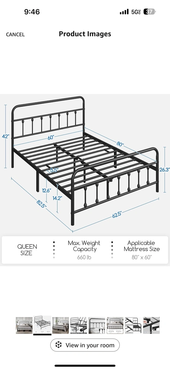 Sturdy metal bed frame. Queen size. Black finish. Simple design. Includes bottom storage space. Supports up to 660 lbs. Protective pads on feet.
