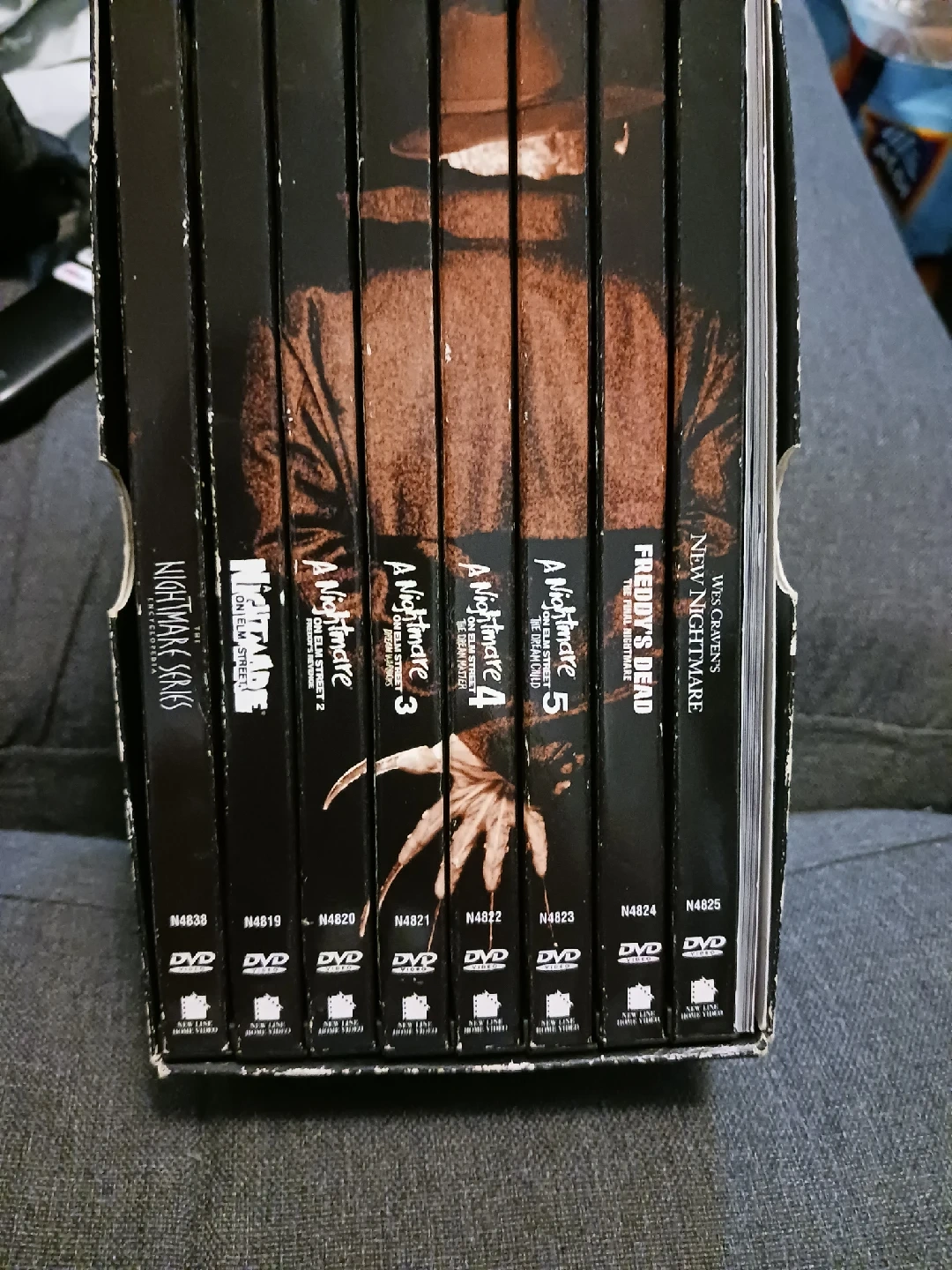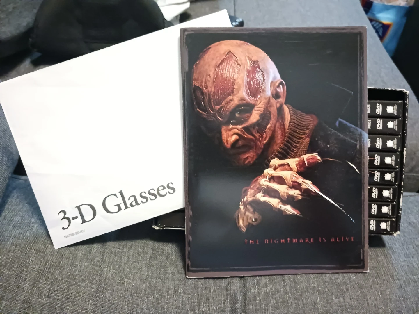 31Selling the Nightmare on Elm Street Collection on DVD! This set includes all the classics. It's the New Line Platinum Series, complete with the original box and even the 3-D glasses. Perfect for any horror movie fan!