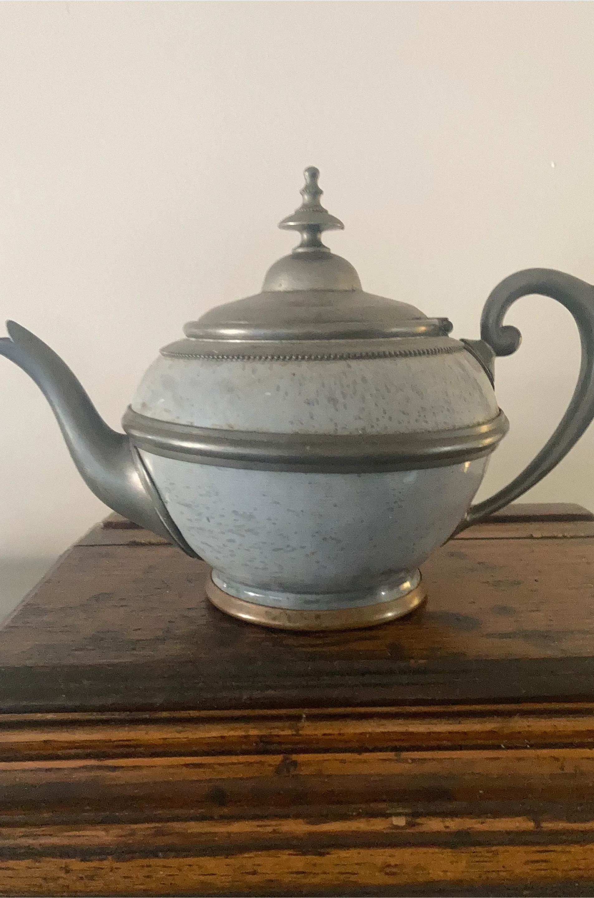 A charming vintage teapot featuring a light blue speckled enamel body with pewter accents and handle. It has a decorative lid and a brass-toned base. This teapot's classic design makes it a lovely decorative piece for any kitchen or dining room.