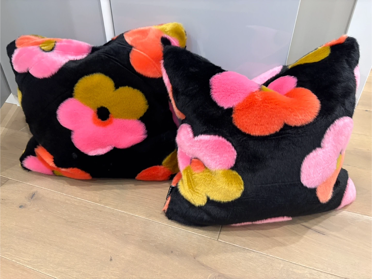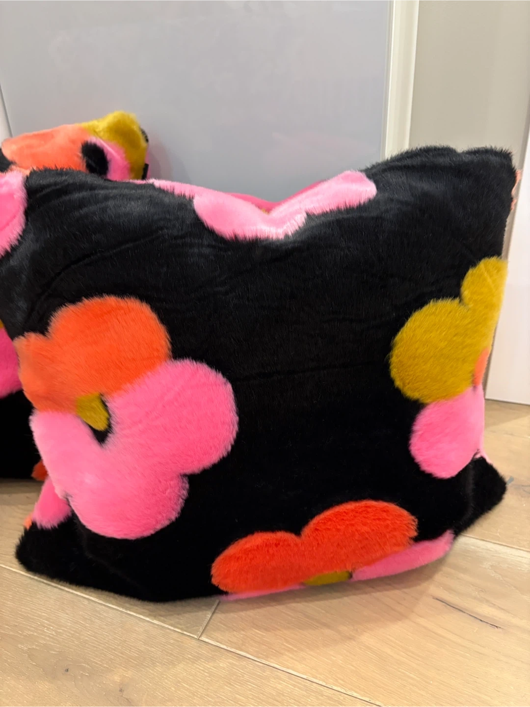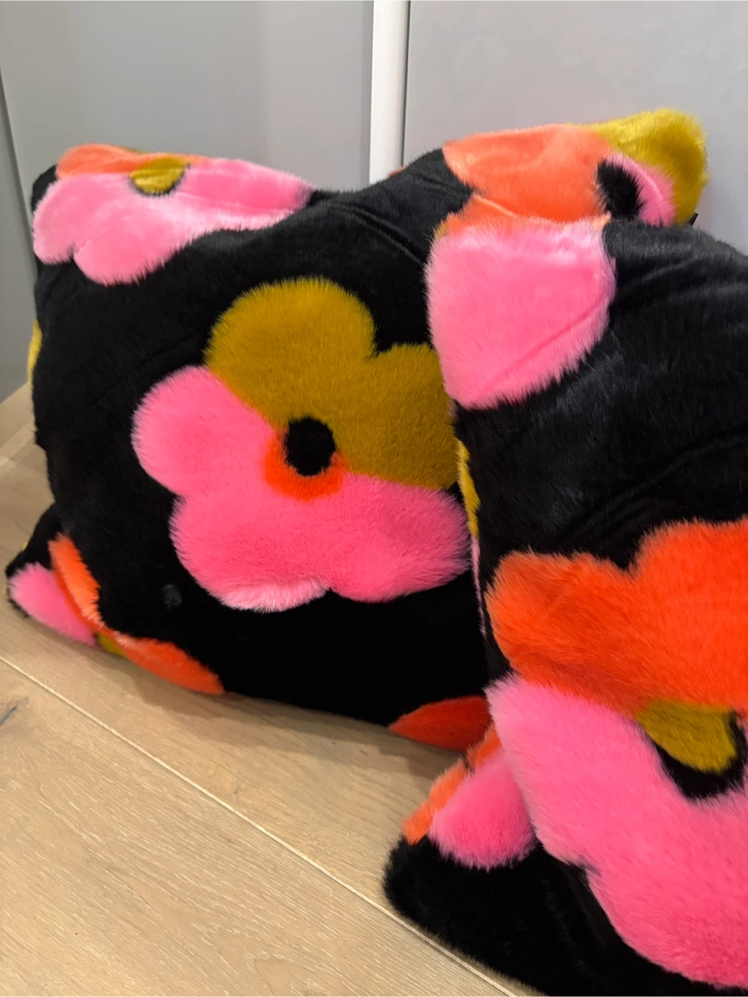 Set of two faux fur throw pillows with a bold floral print. Black base with pink, orange, and yellow flowers. Soft and plush texture. Measures approximately 18x18 inches.