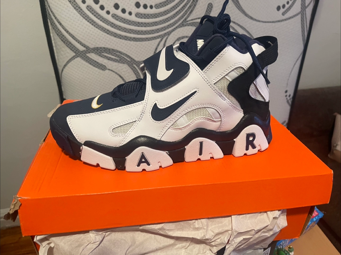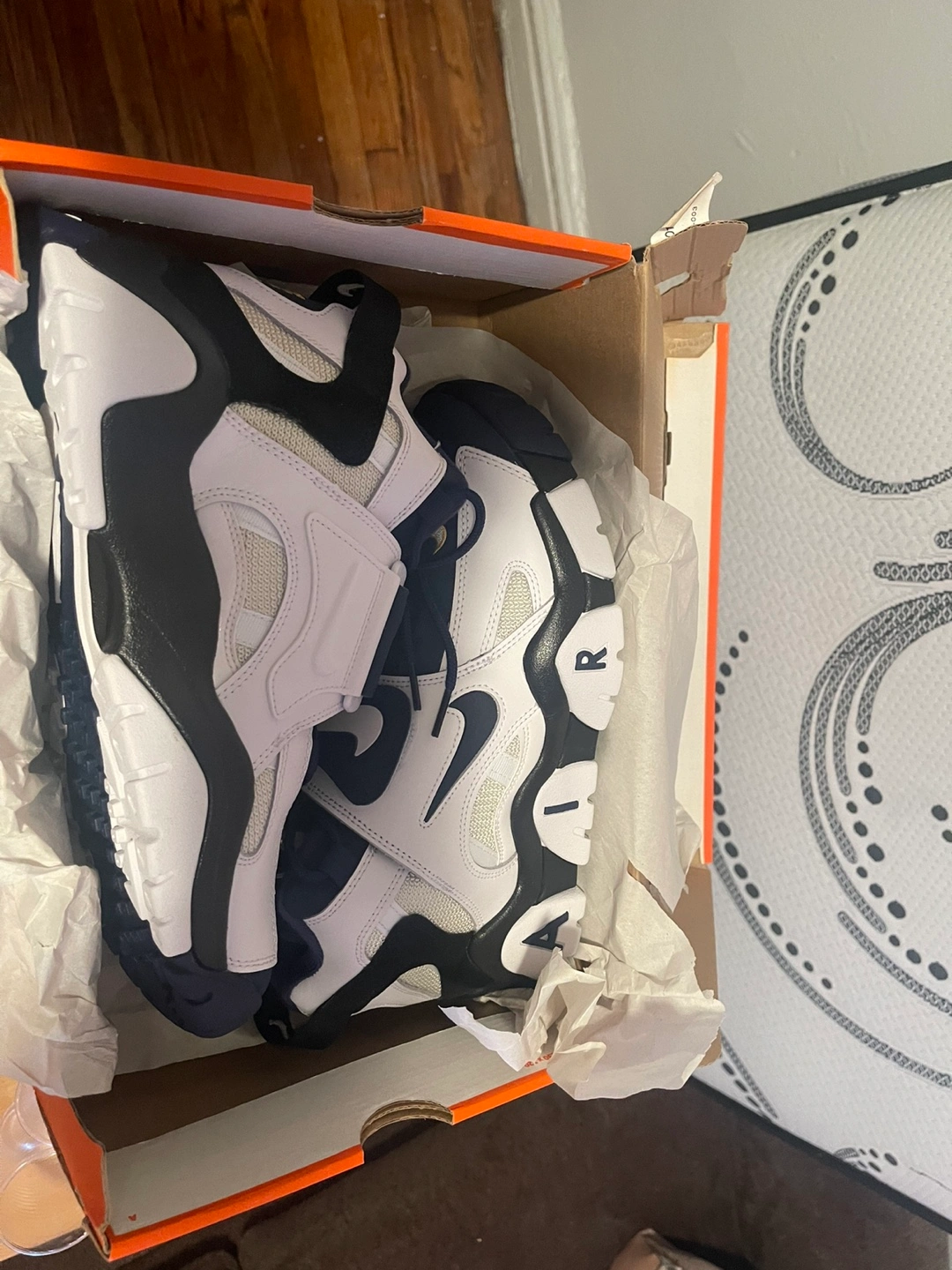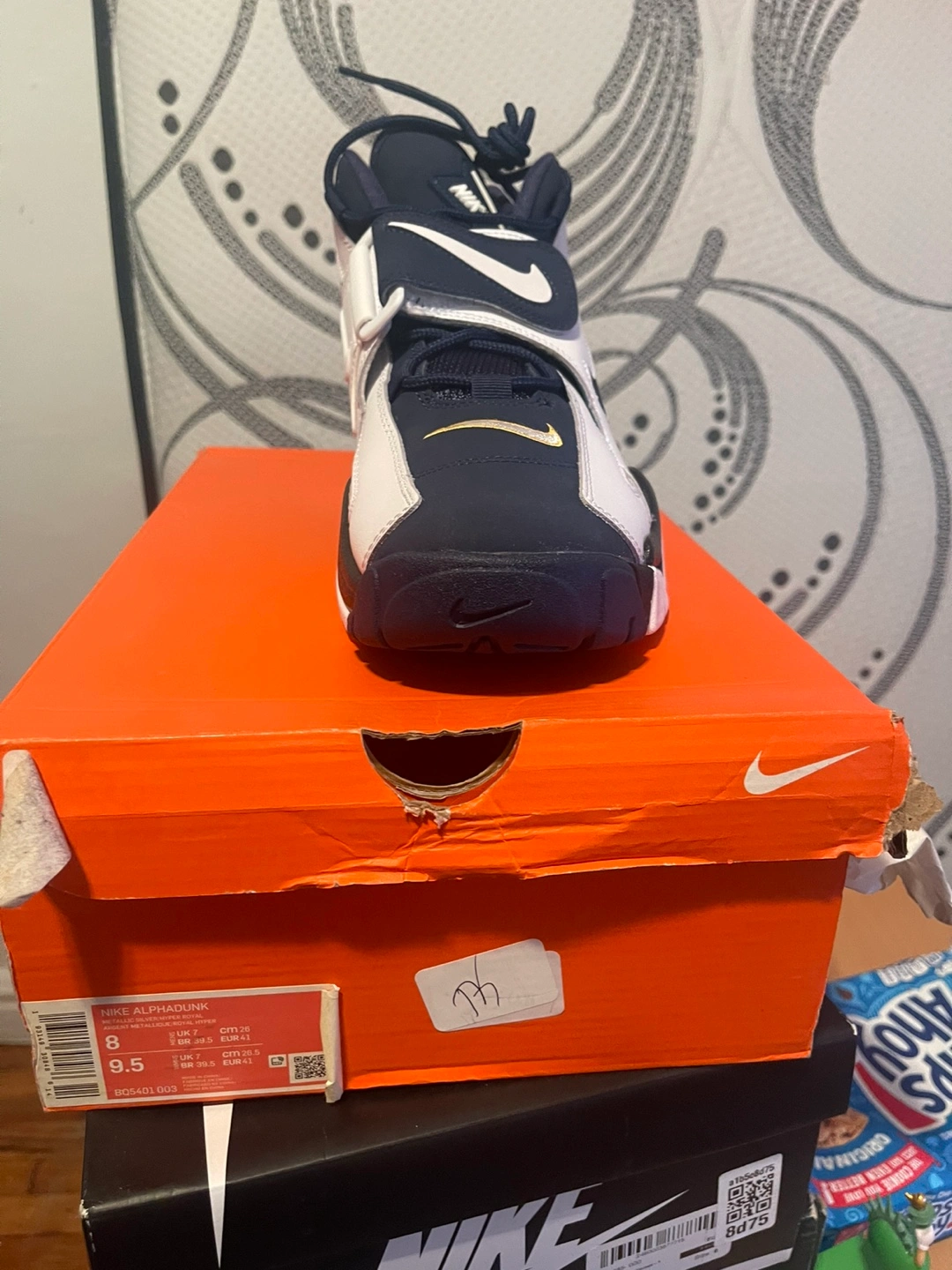 Men's Nike Air Alphadunk sneakers. Size 9.5. White, navy blue, and black color scheme. Comes in original box. Strap closure.