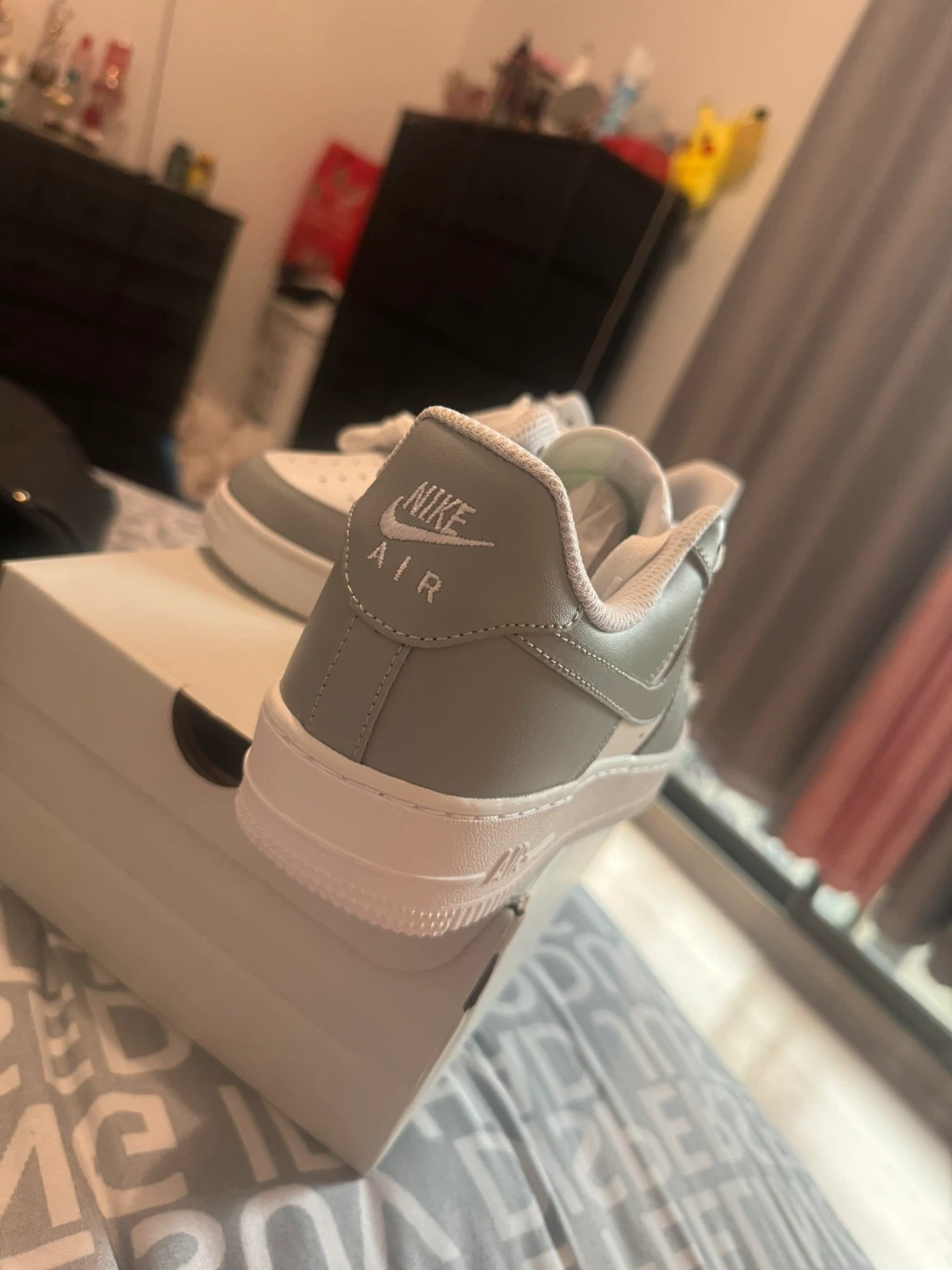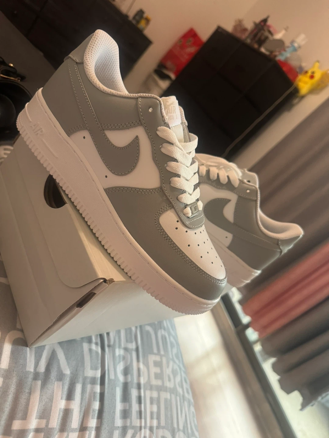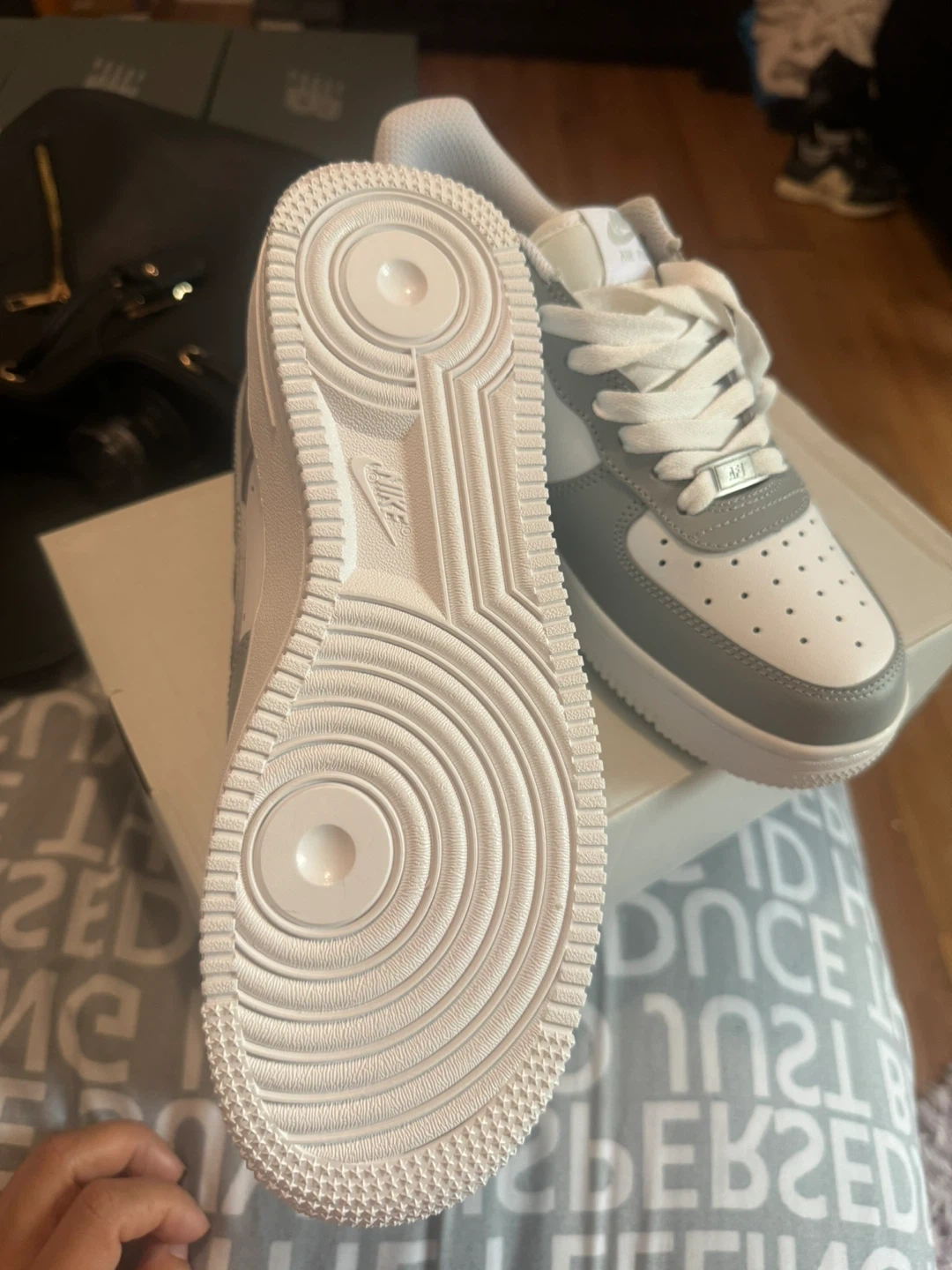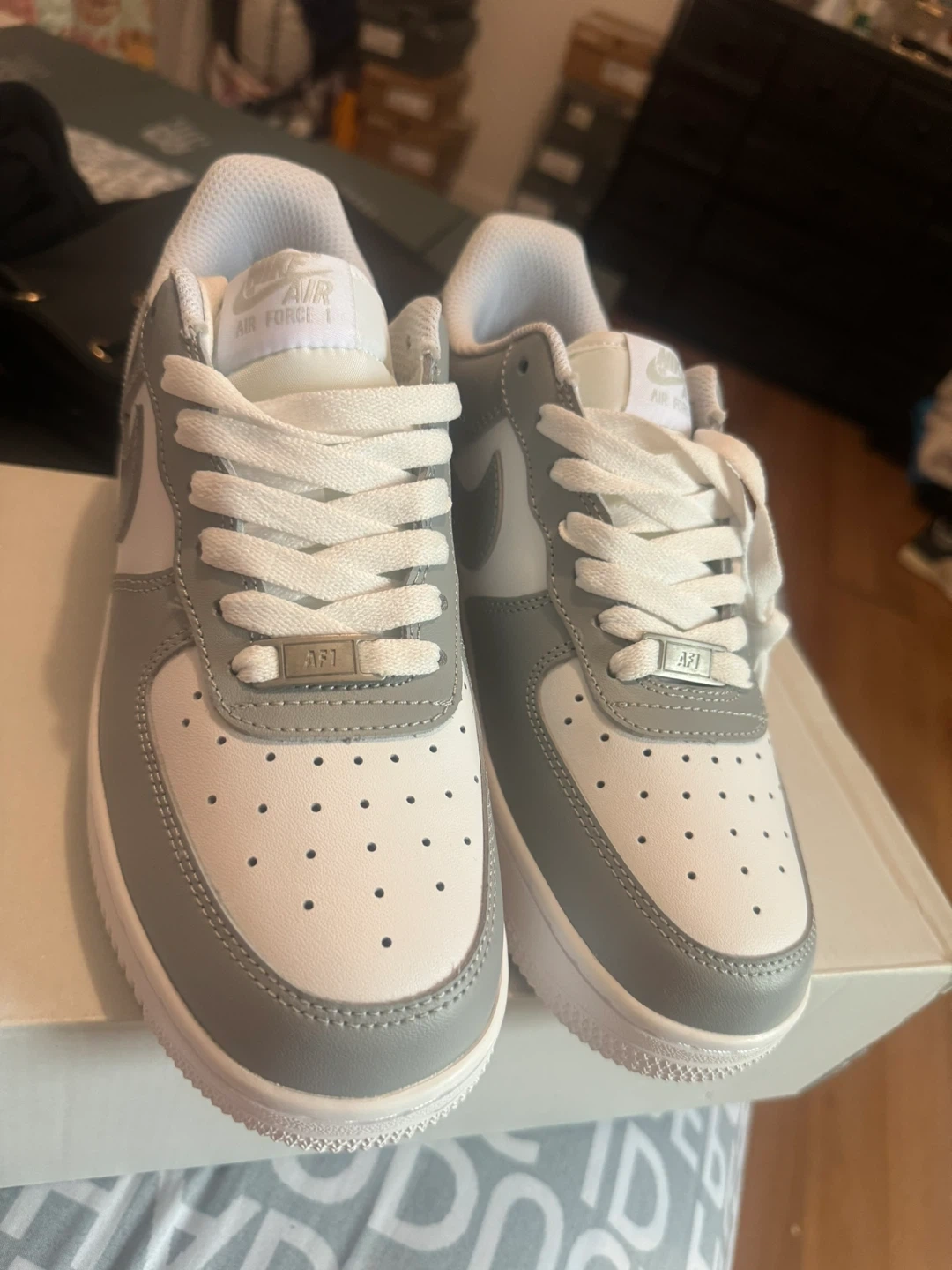 Selling a pair of Nike Air Force 1s in a stylish grey and white colorway! These shoes are in like-new condition and come with the original box. They're a classic and versatile sneaker that goes with just about anything