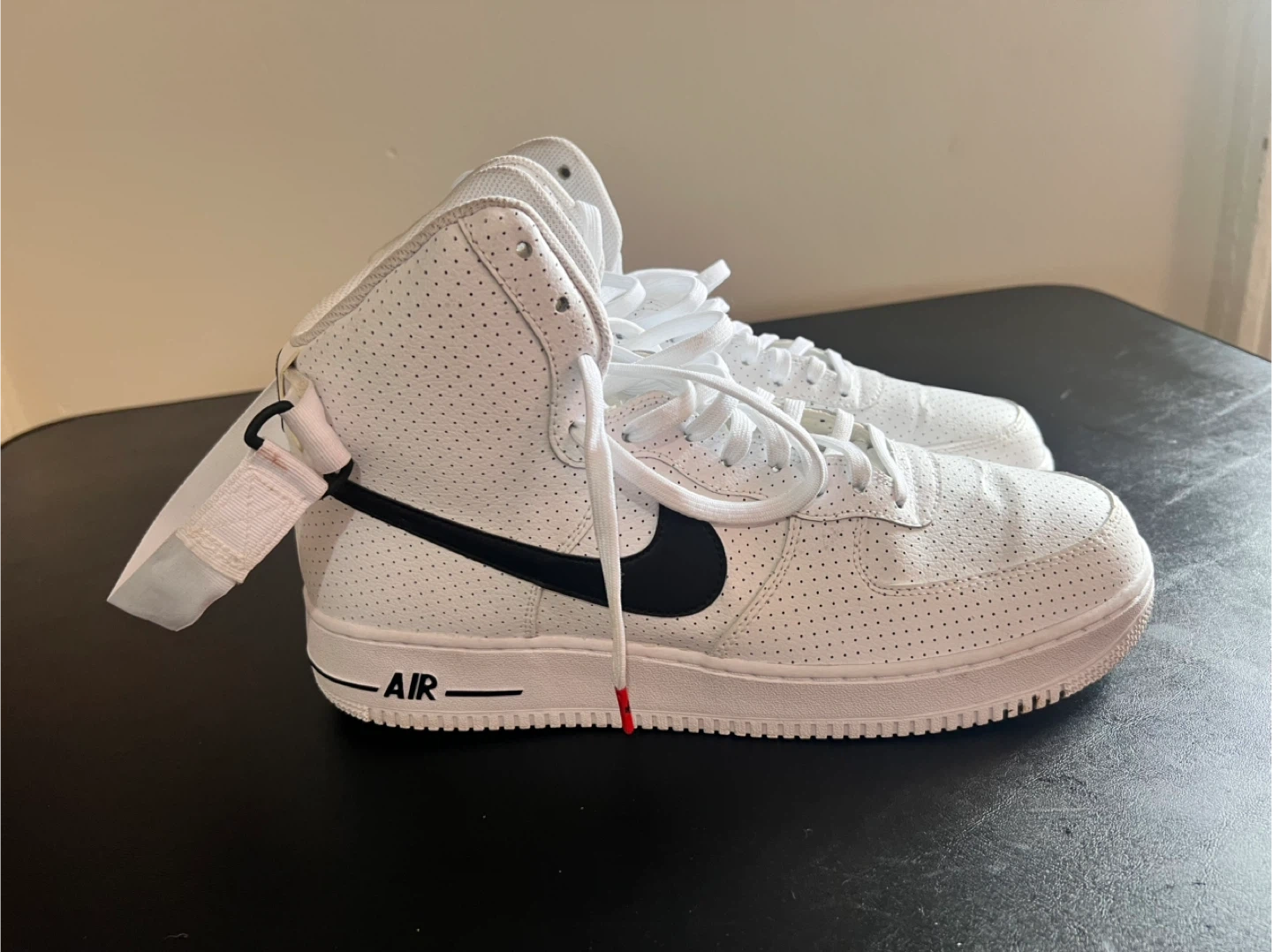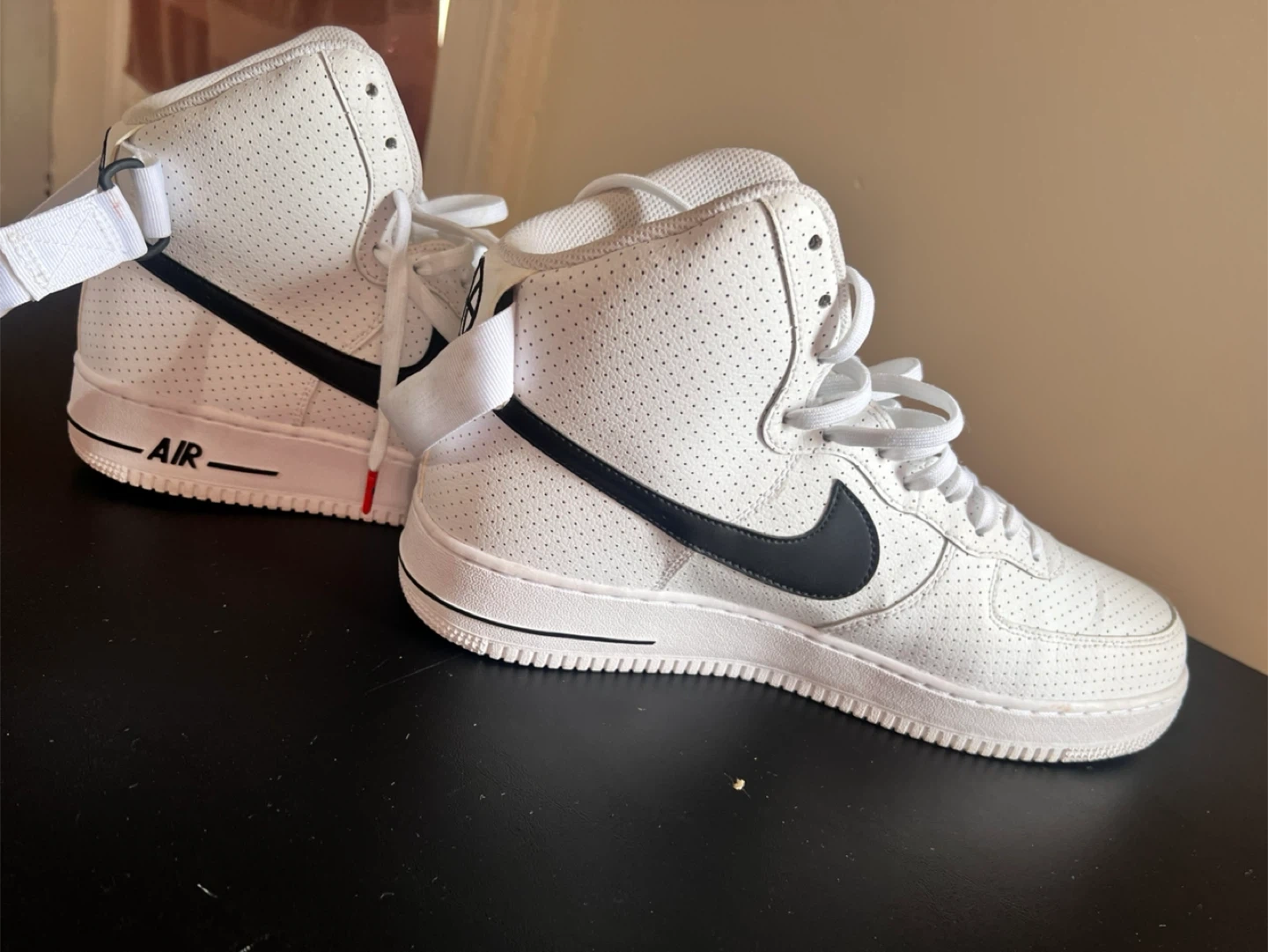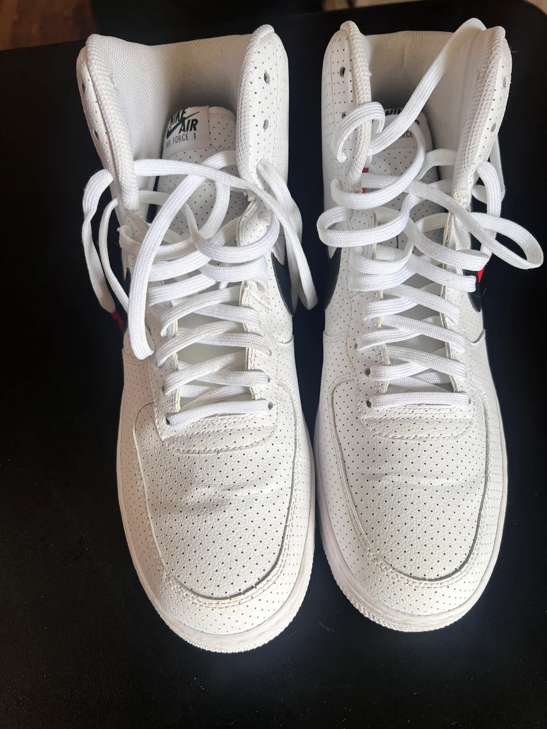 Selling a pair of Nike Air Force 1 high tops in white! They're in great shape and ready for a new home. These classic sneakers feature the iconic swoosh and comfortable fit, perfect for everyday wear.