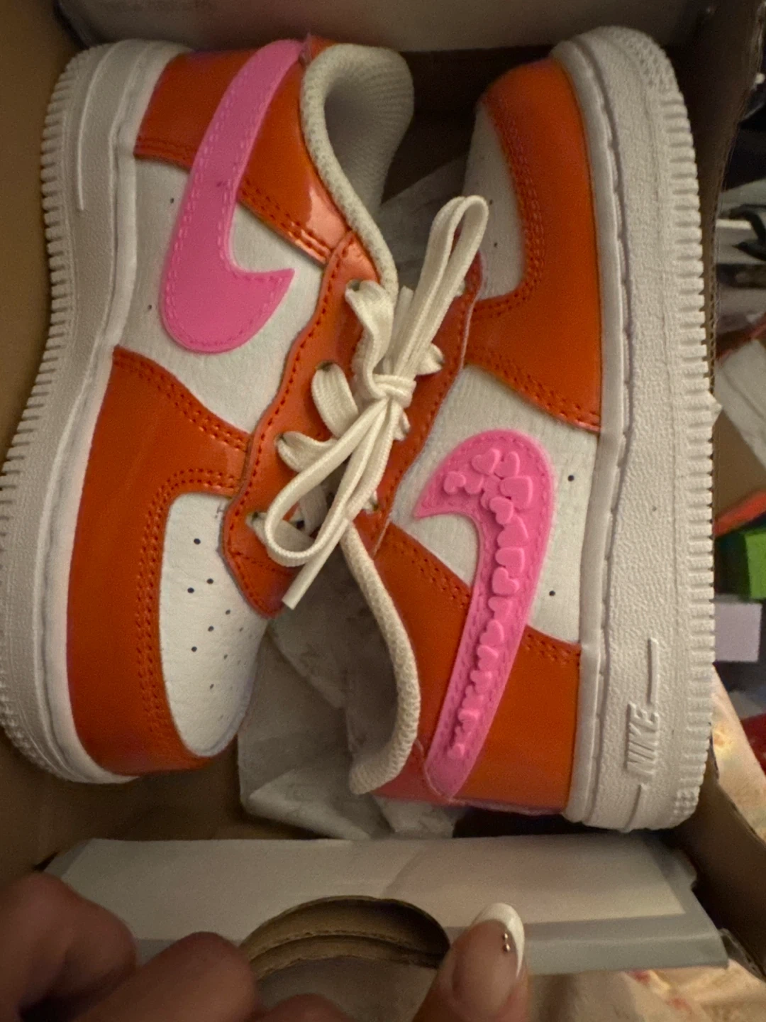 65Cute pair of Nike Air Force 1 kids shoes in orange and pink! They come with the original box.