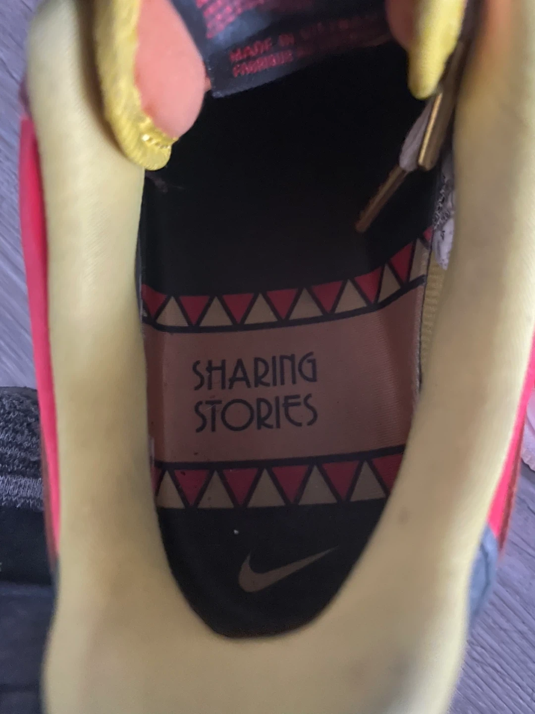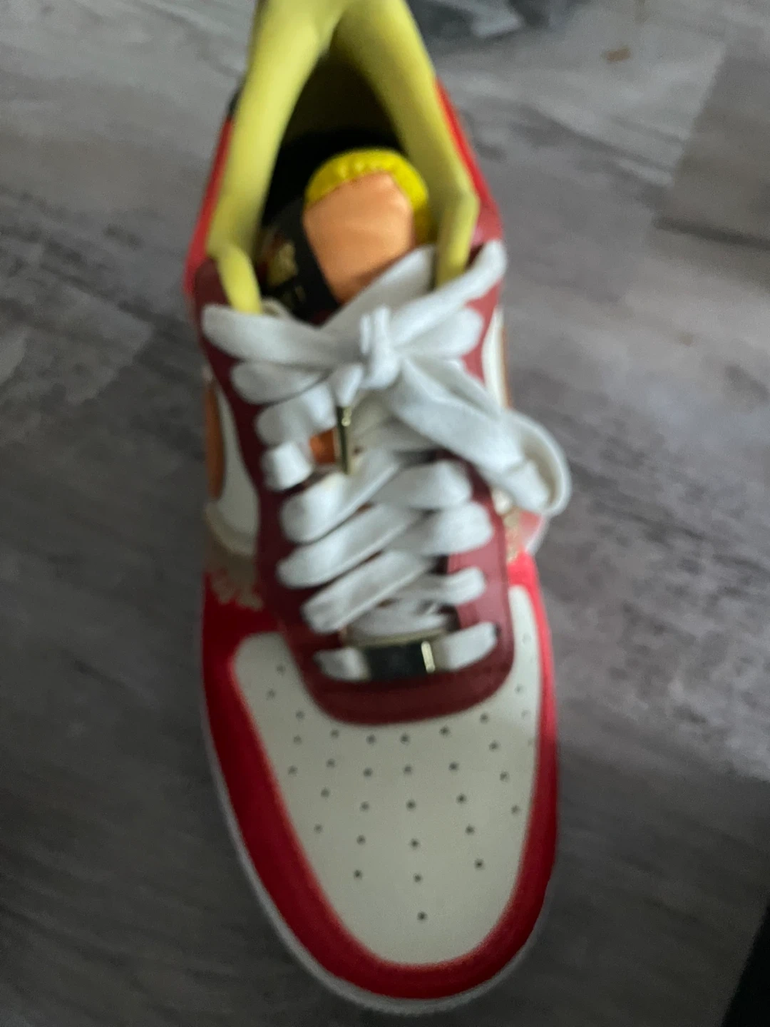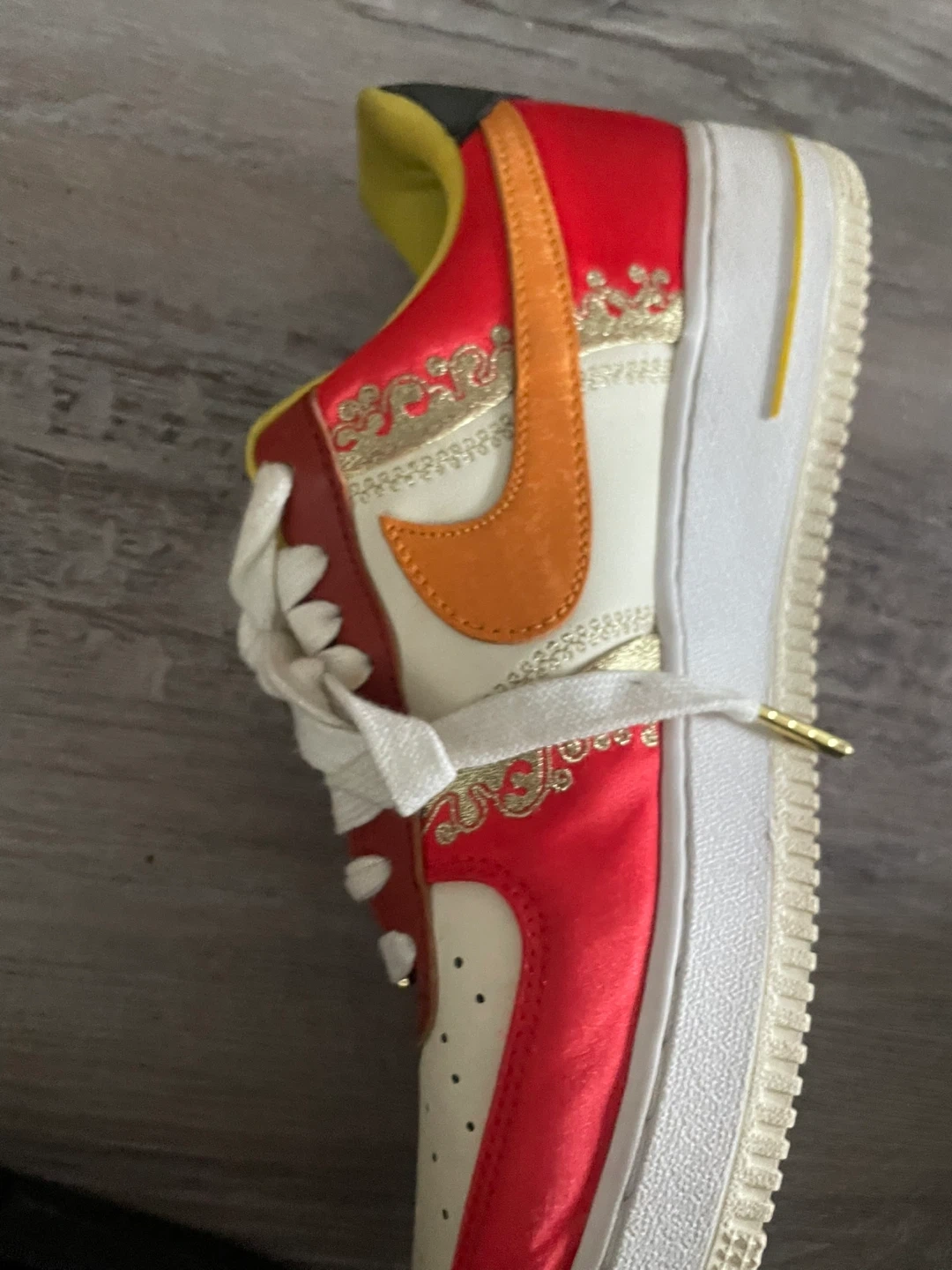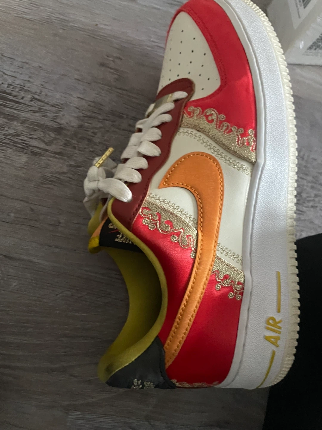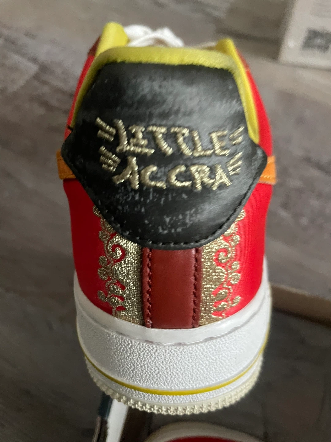 83Selling a pair of Nike Air Force 1 "Little Accra" sneakers. These shoes feature a unique design with red, white, and gold accents and the words "LITTLE ACCRA" on the back. They are in good condition and ready for a new home!