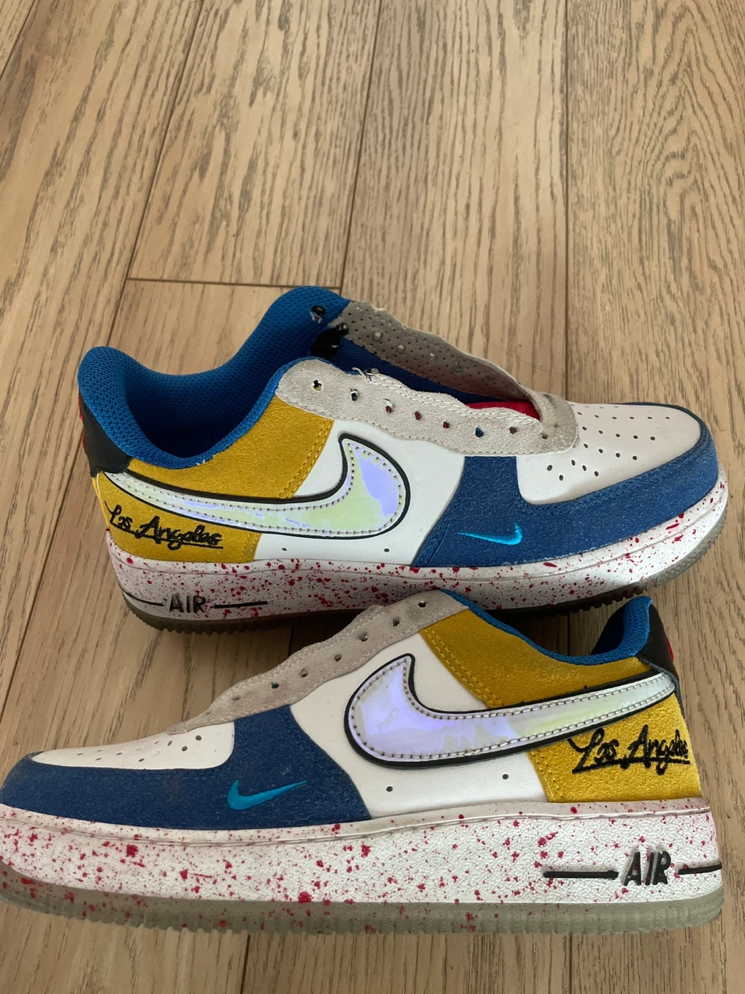 60Selling a pair of Nike Air Force 1 shoes with a unique Los Angeles design! These shoes feature a mix of blue, yellow, and white colors with a speckled sole. They have the word "AIR" on the side and a small blue Nike swoosh near the toe. Perfect for adding a pop of style to your wardrobe