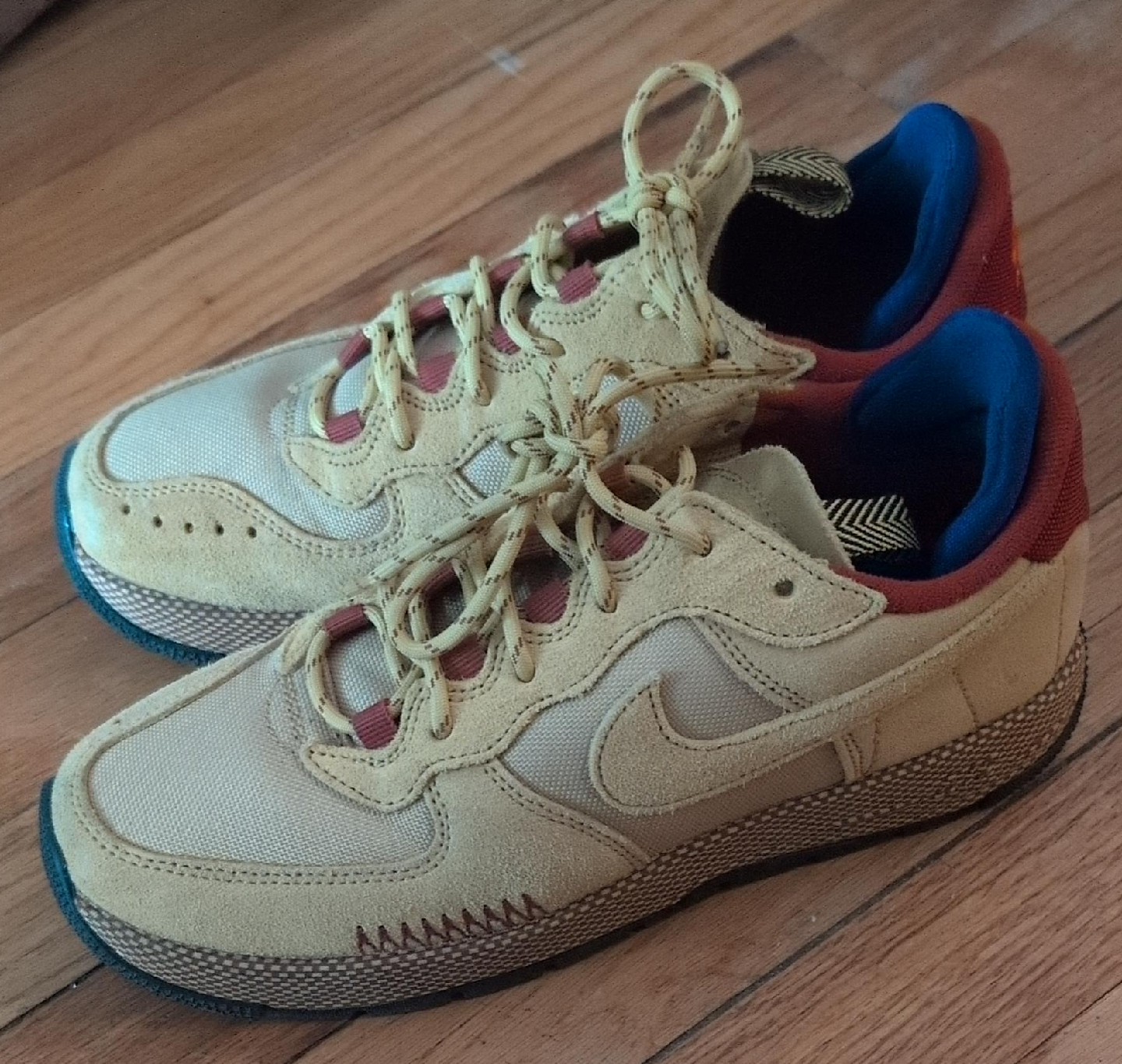 selling women's Air Force 1 Wild Wheat Gold The outdoors are for everyone. So is this AF-1. The icon gets an adventurous refresh with utility lacing, durable materials and stitching for extra-tough construction. The textile-wrapped midsole is light and flexible, and an added heel pillow brings the comfort. Embroidered accents contrast with boot-craft details and breathable mesh for a look that's as versatile as you are