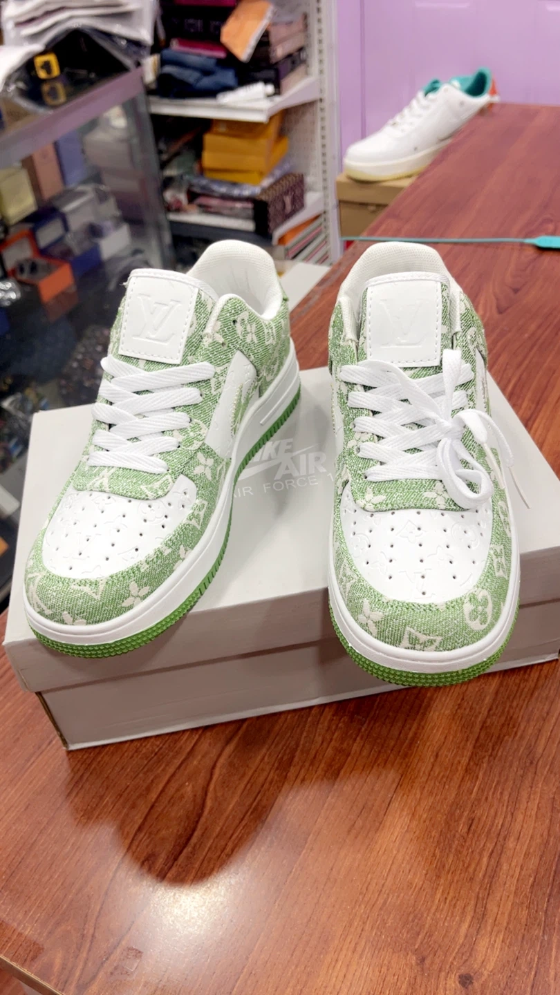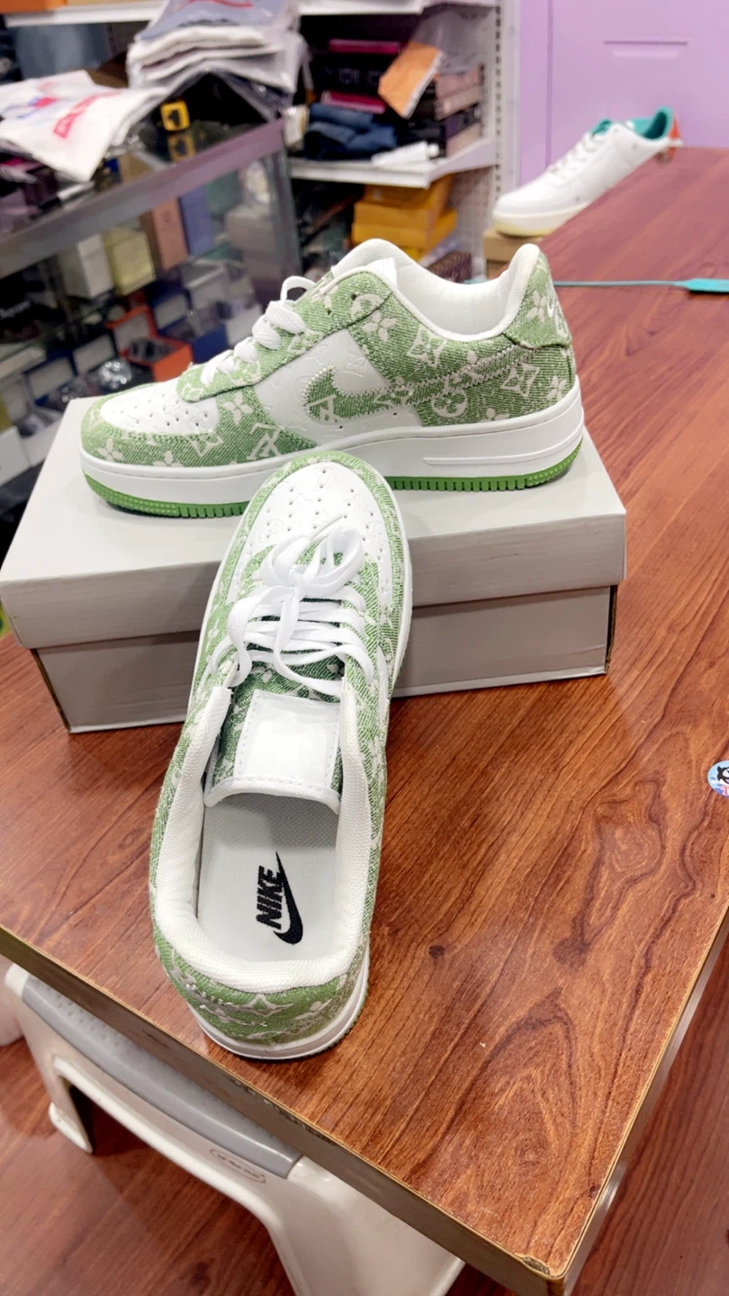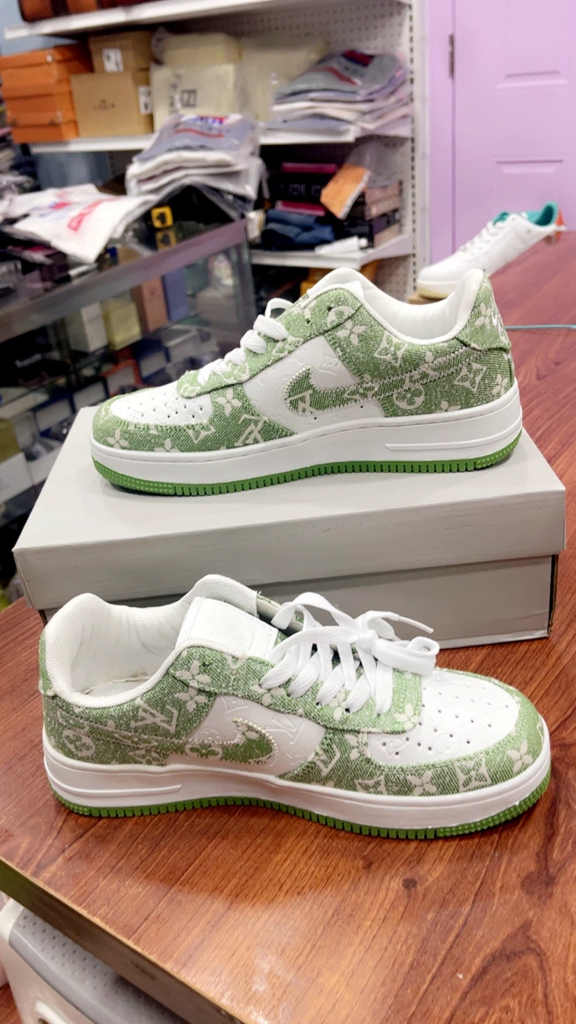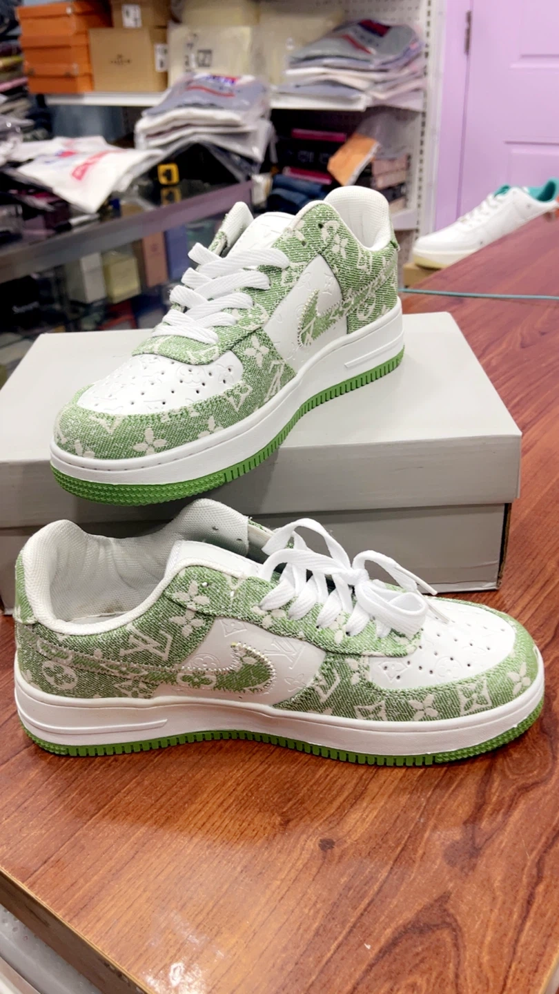 82Selling a pair of Nike Air Force 1 Low sneakers with a custom green design! These shoes come with the original box and size 7 and 9.5