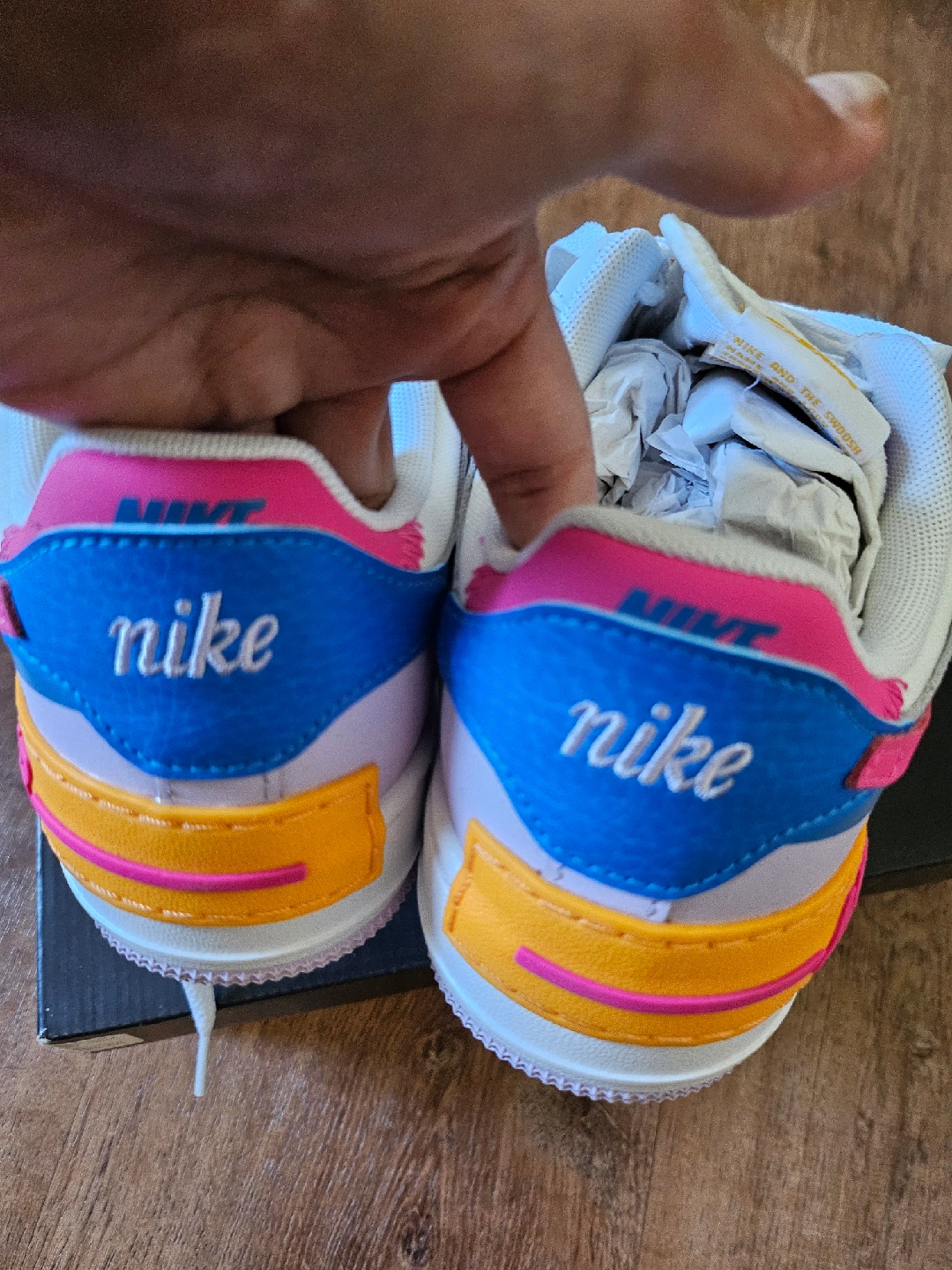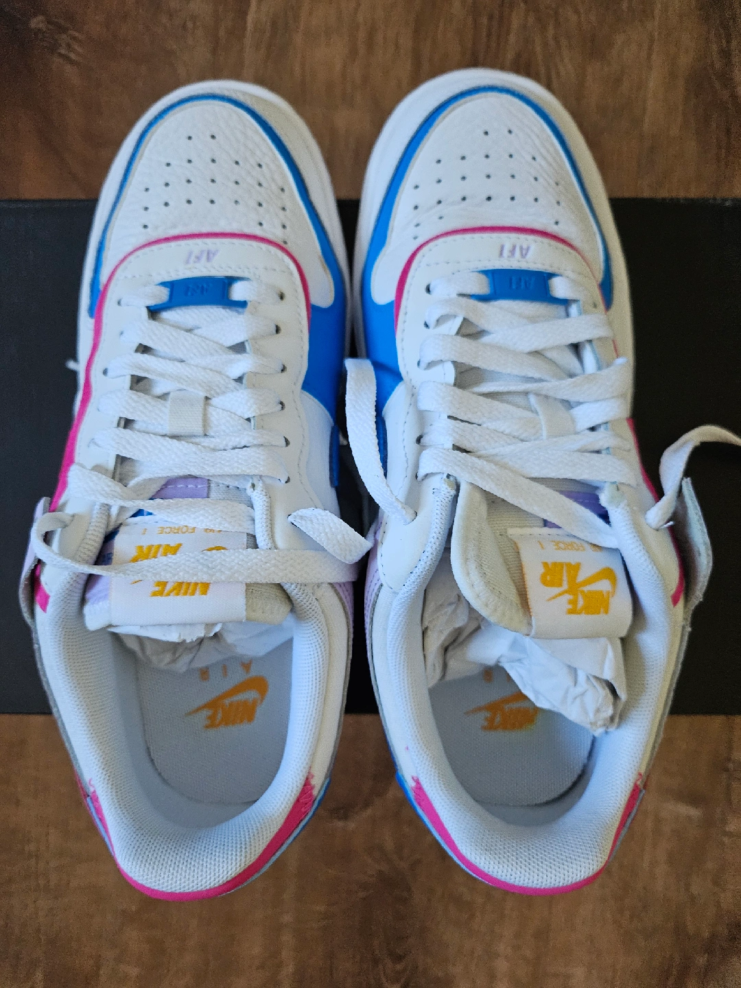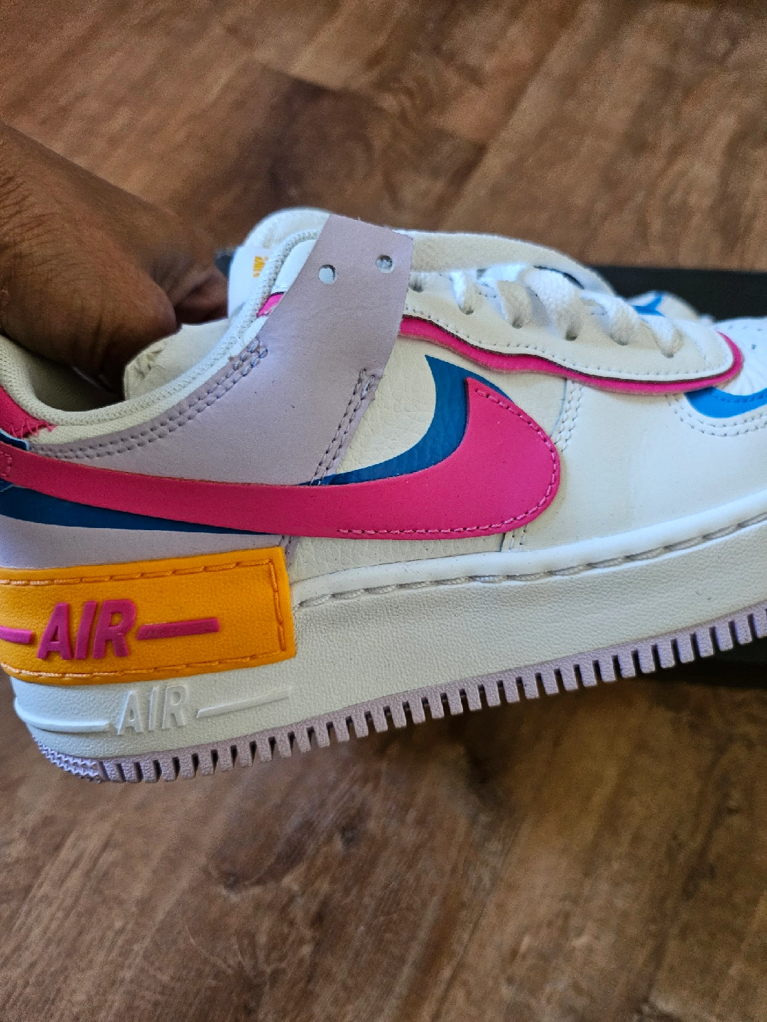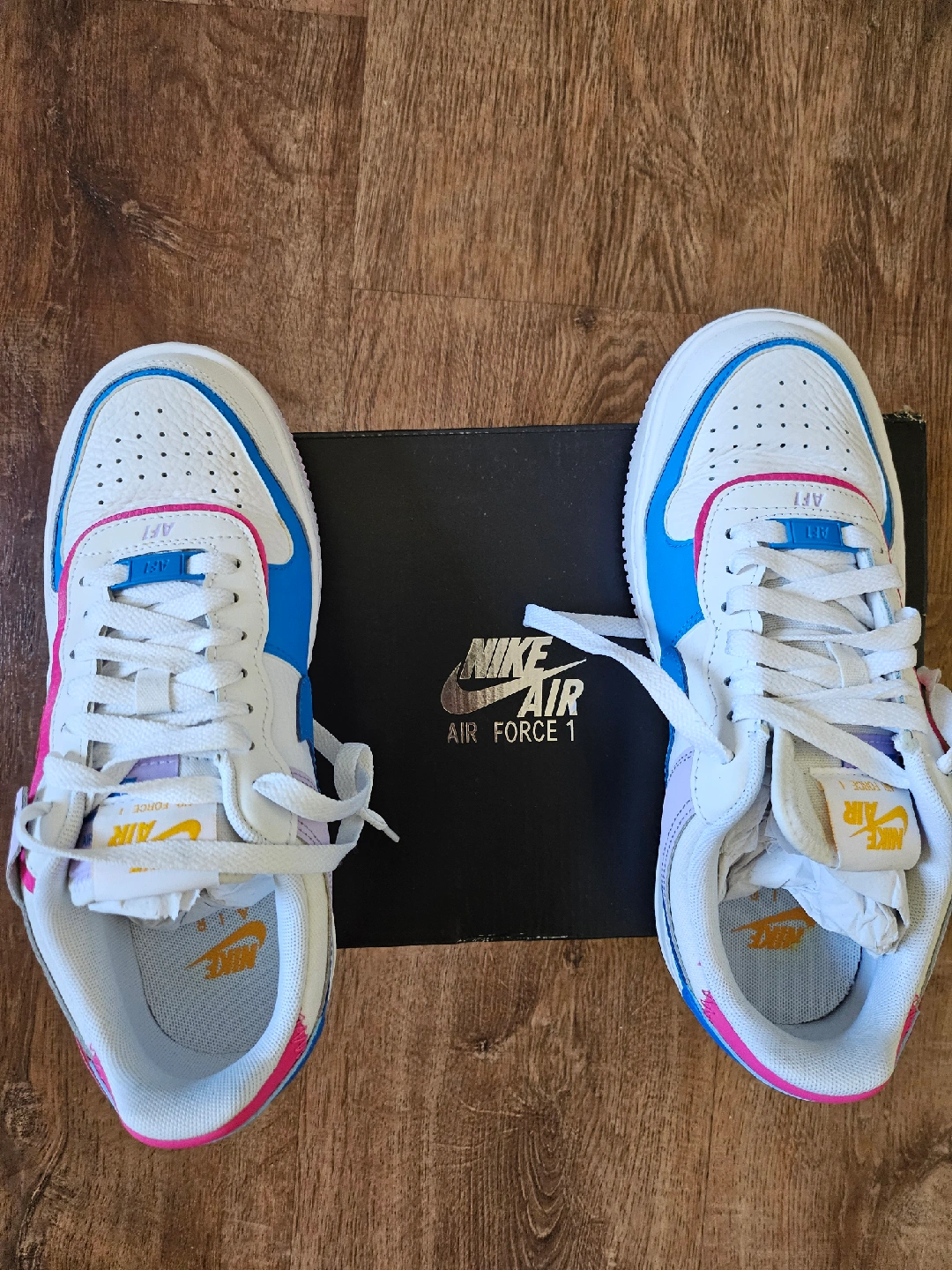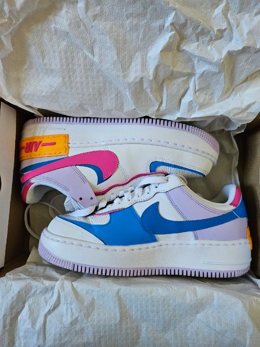 Selling a pair of Nike Air Force 1 Shadow sneakers in women's size 7! They come with the original box. The color is white/alchemy pink-photo blue. These are super stylish and comfortable!