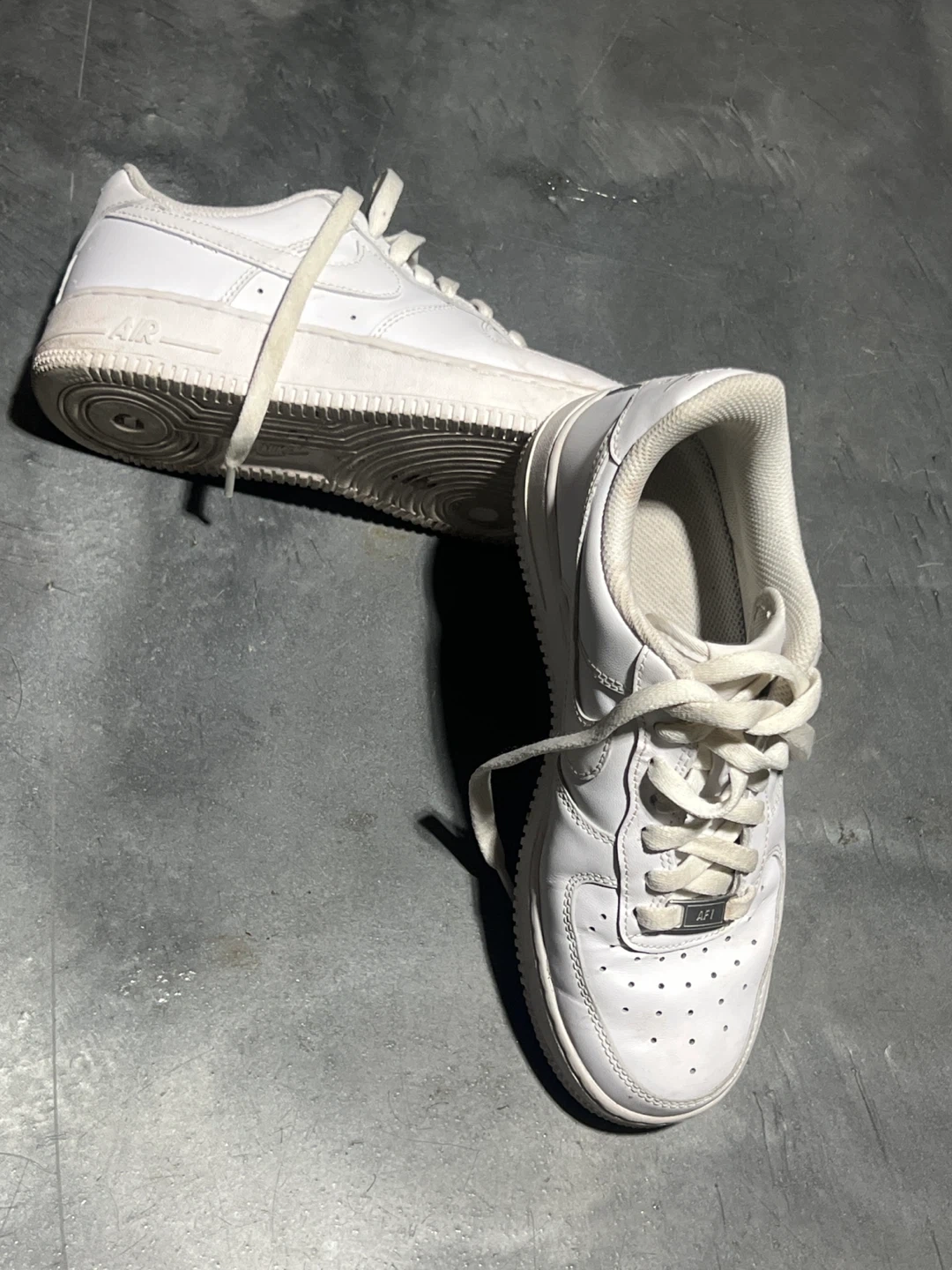 Selling a pair of classic Nike Air Force 1 sneakers in white. They show some signs of wear, as you can see in the photos, but still have lots of life left! These are super versatile and go with just about anything