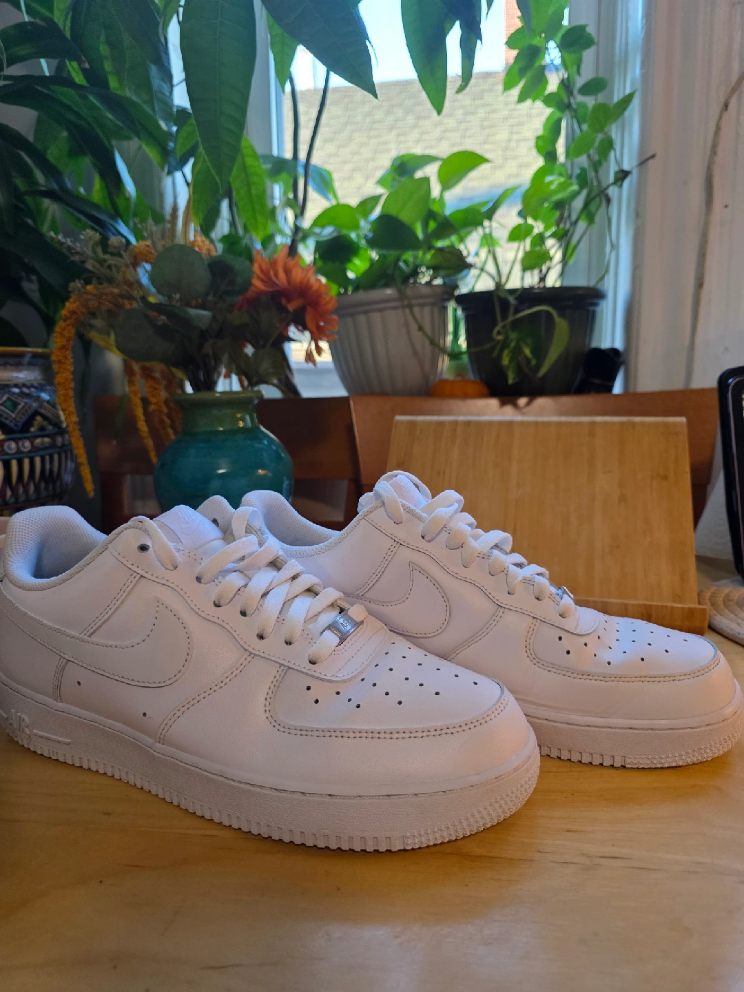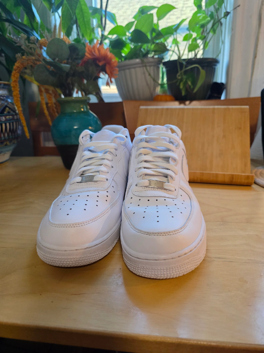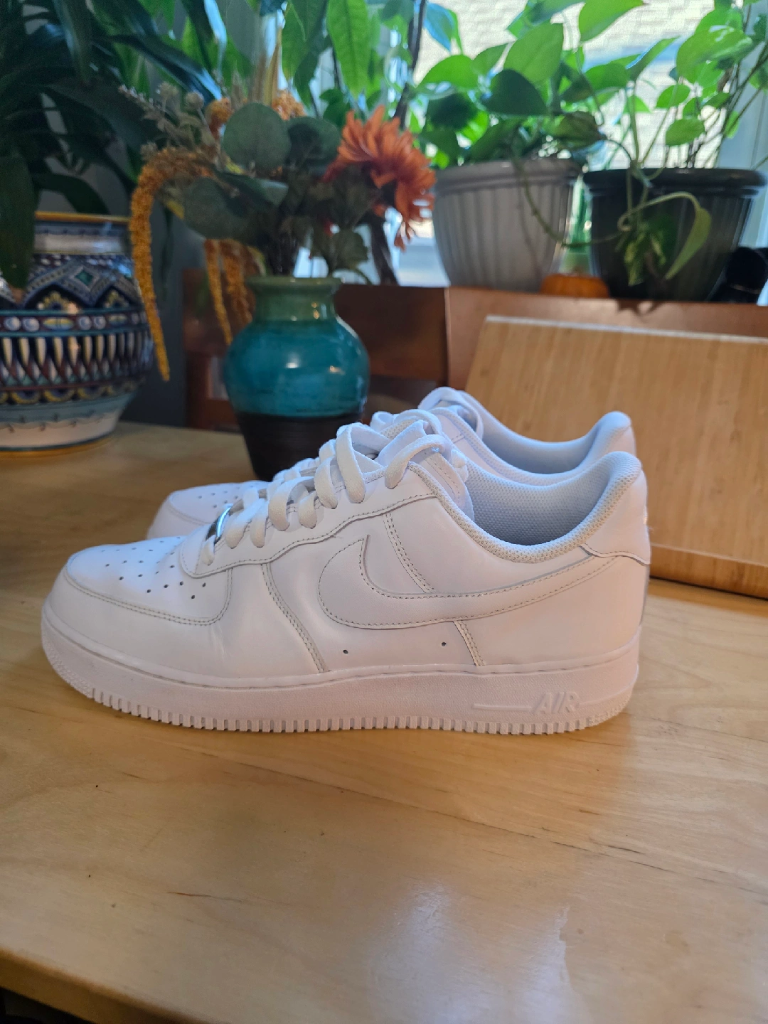 15Selling a pair of classic white Nike Air Force 1s. These are a timeless style and would be great for everyday wear. They're in good condition and ready for a new home!