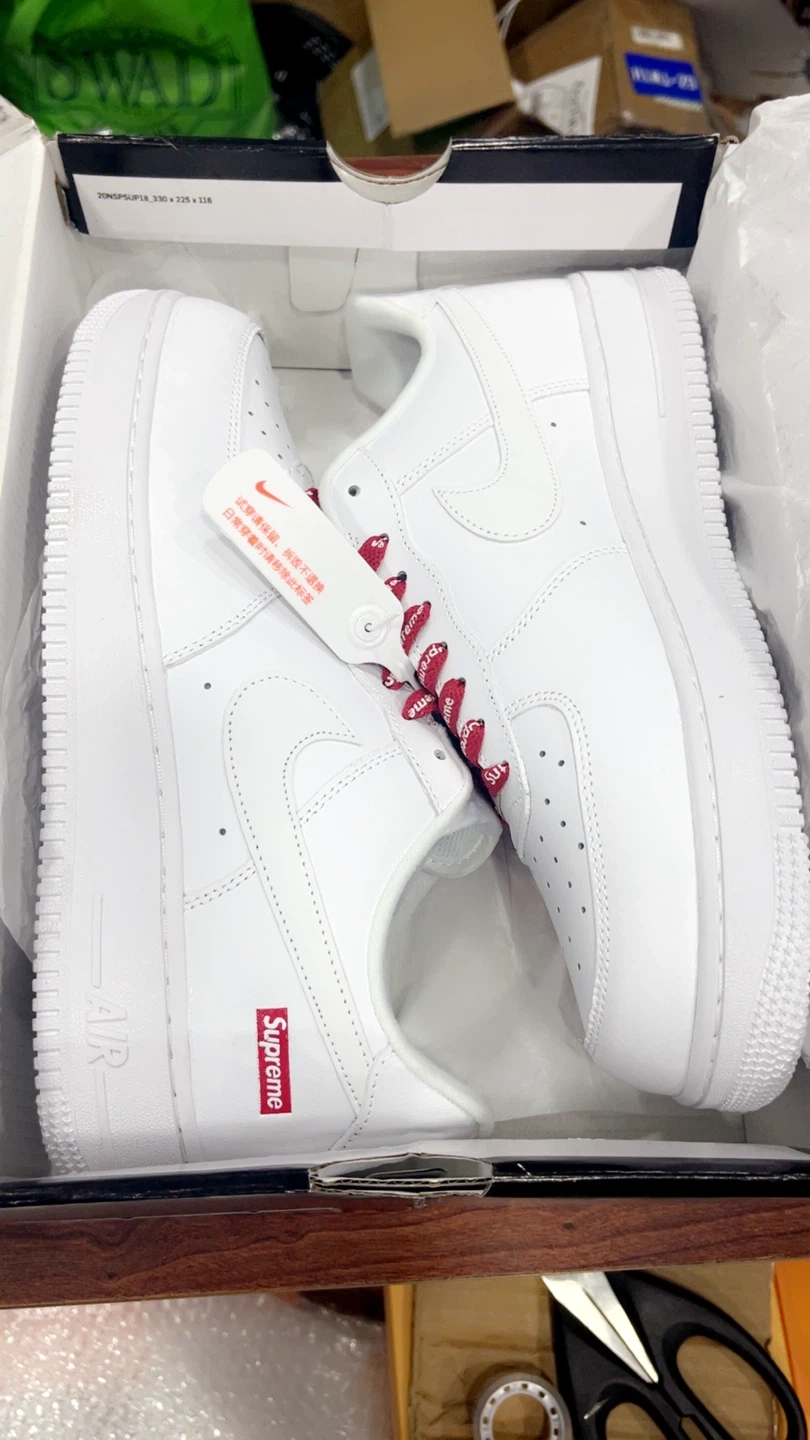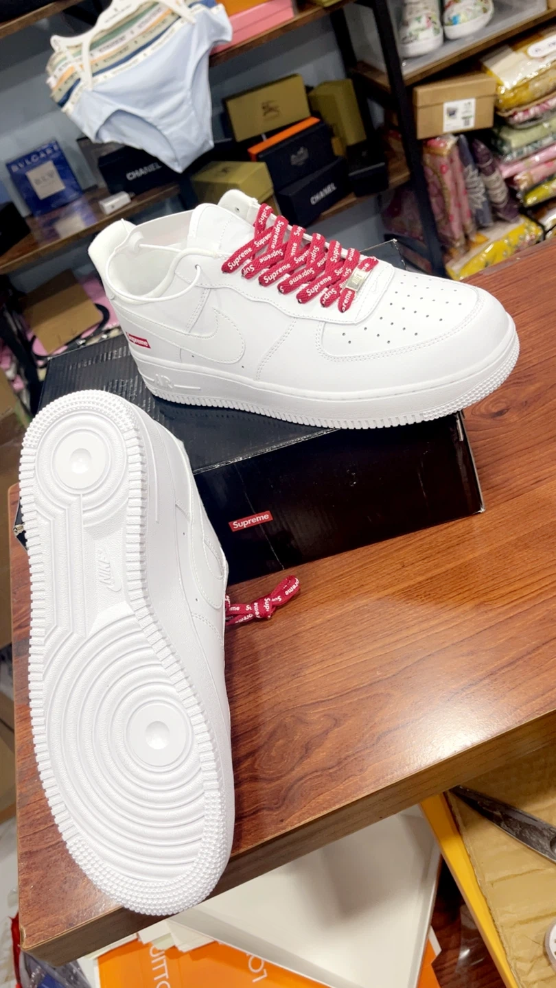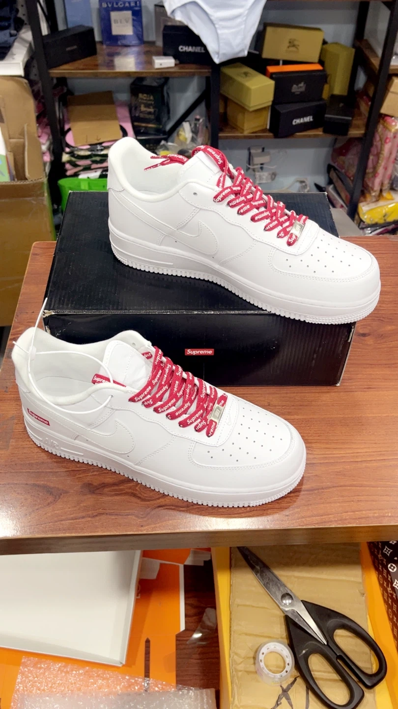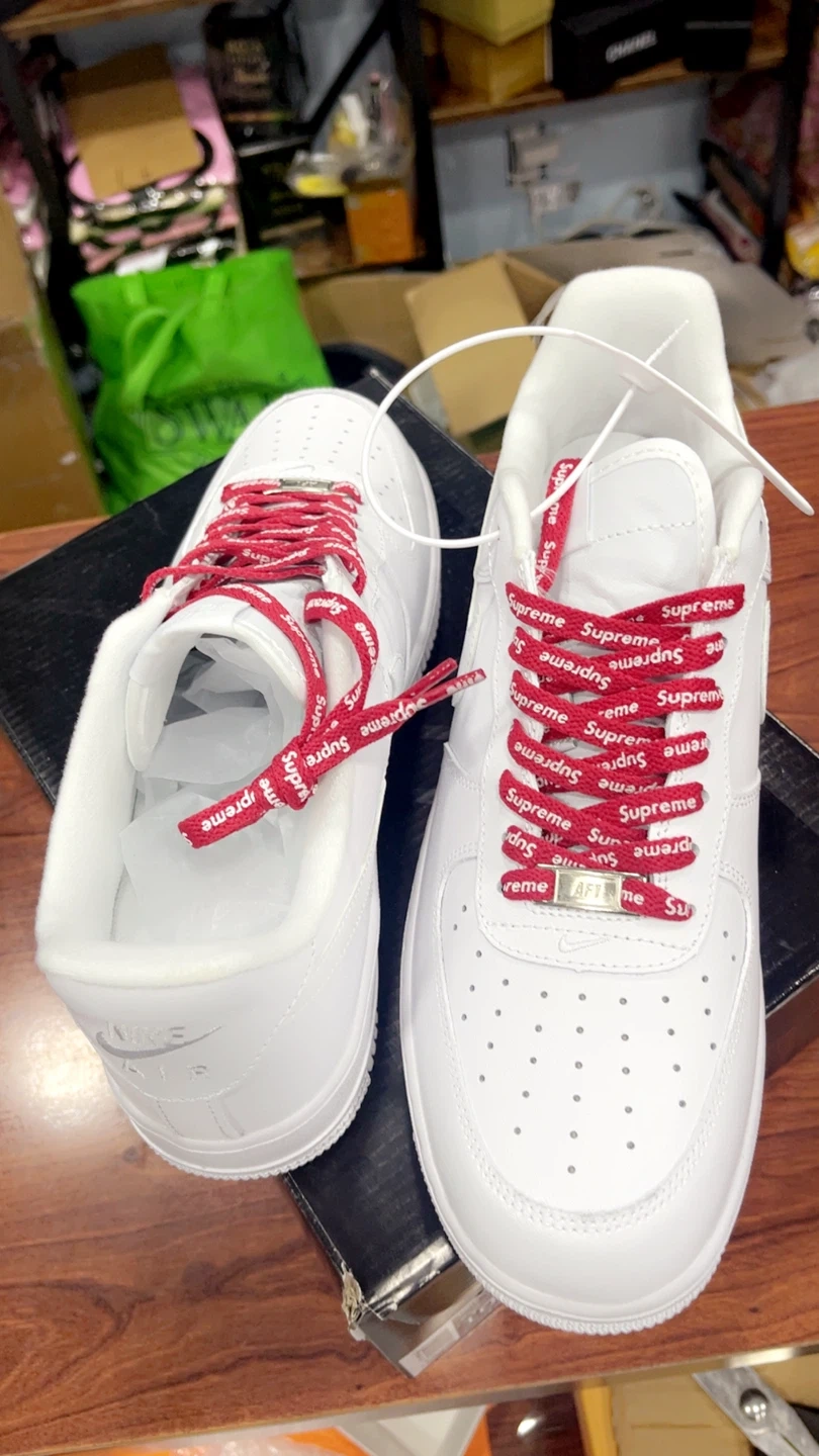 Nike Air Force 1 Low Supreme in white. These shoes come with the original box. They feature a clean white design with Supreme branding. The laces are red and have the Supreme logo printed on them.