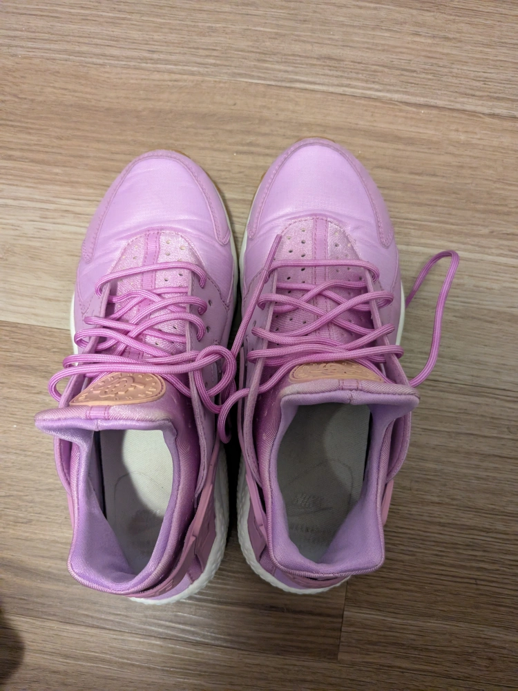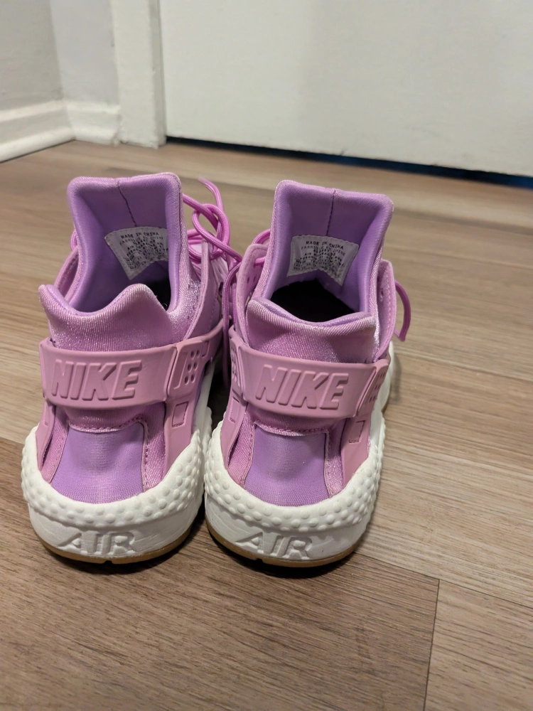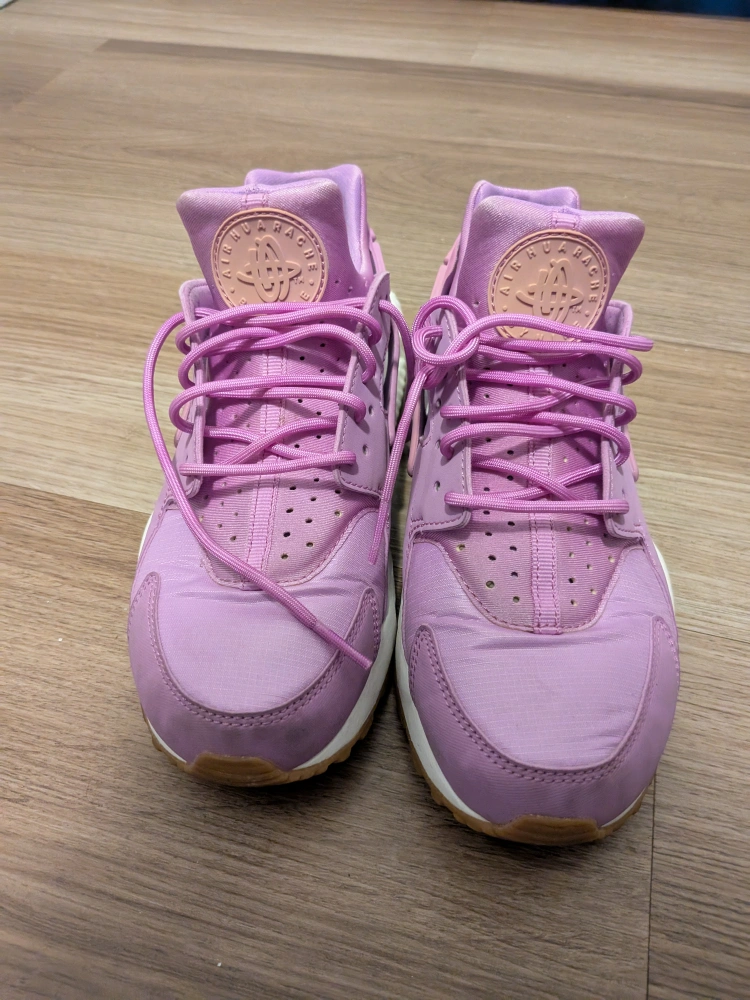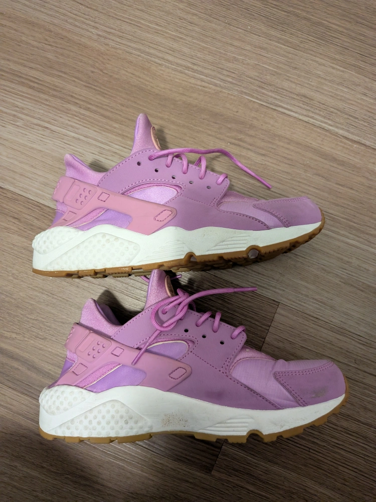 Selling a pair of Nike Air Huarache Run sneakers in a lovely lilac color. They are size 7 women's and have a leather upper with a rubber sole. These are in good condition and ready for a new home!
