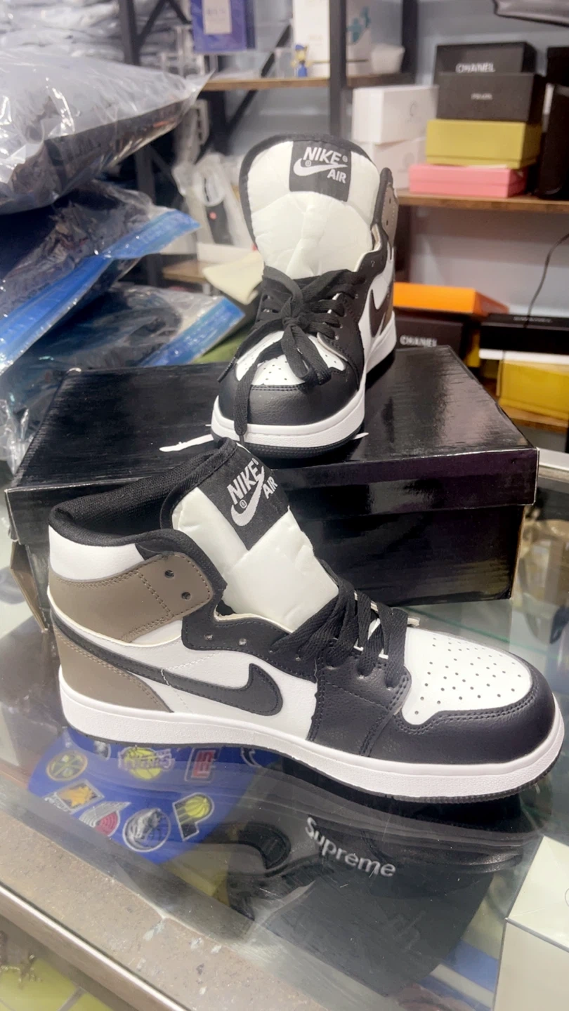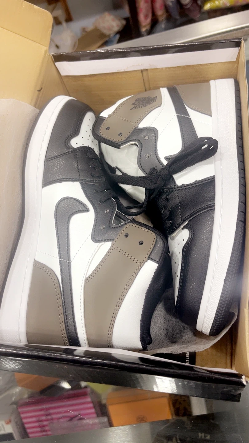 82Here are some stylish Nike Air Jordan 1 High sneakers in a cool black, white, and mocha colorway! and come with the original box. These high-tops are perfect for adding a touch of street style to any outfit in size 7 www.royalmantle.shop