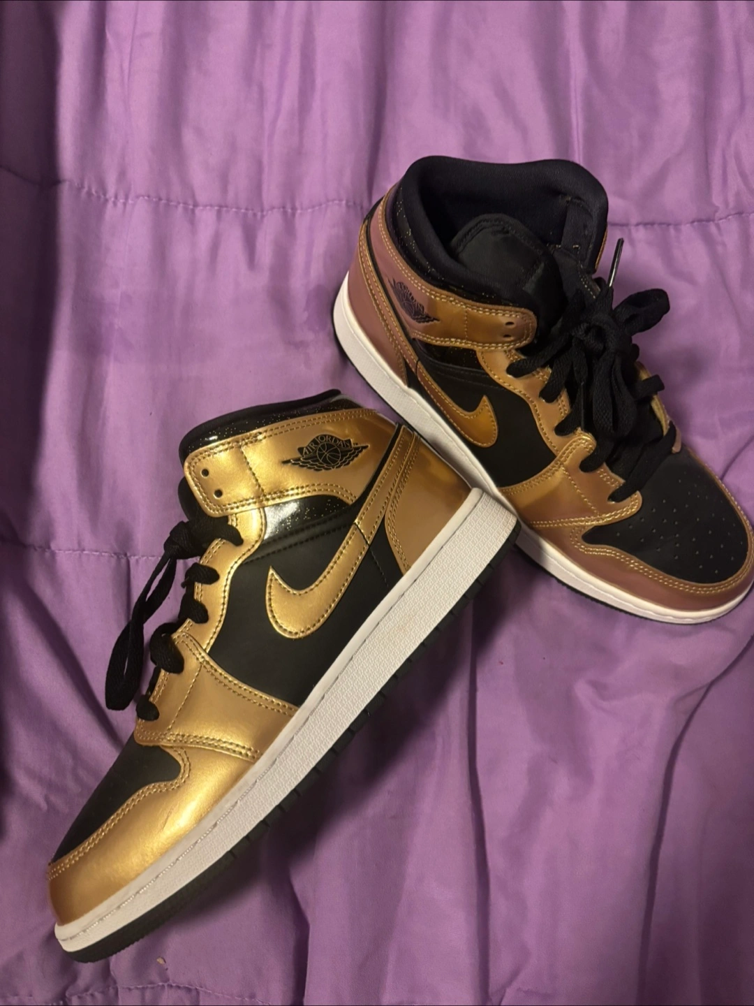 Selling a pair of Air Jordan 1 High sneakers in a striking gold and black colorway! These shoes are in great condition and ready for a new home. They feature the iconic Air Jordan design with a high-top silhouette. Perfect for adding a touch of style to any outfit!