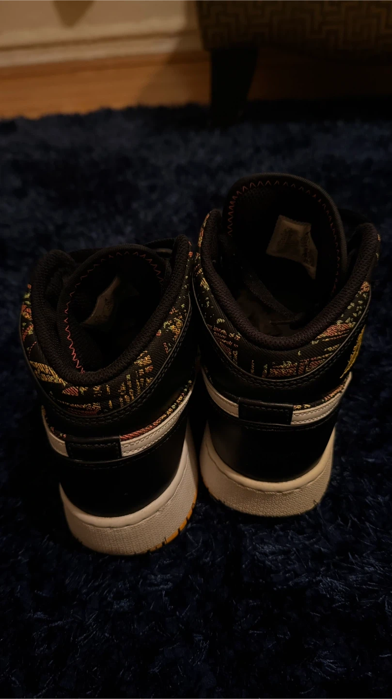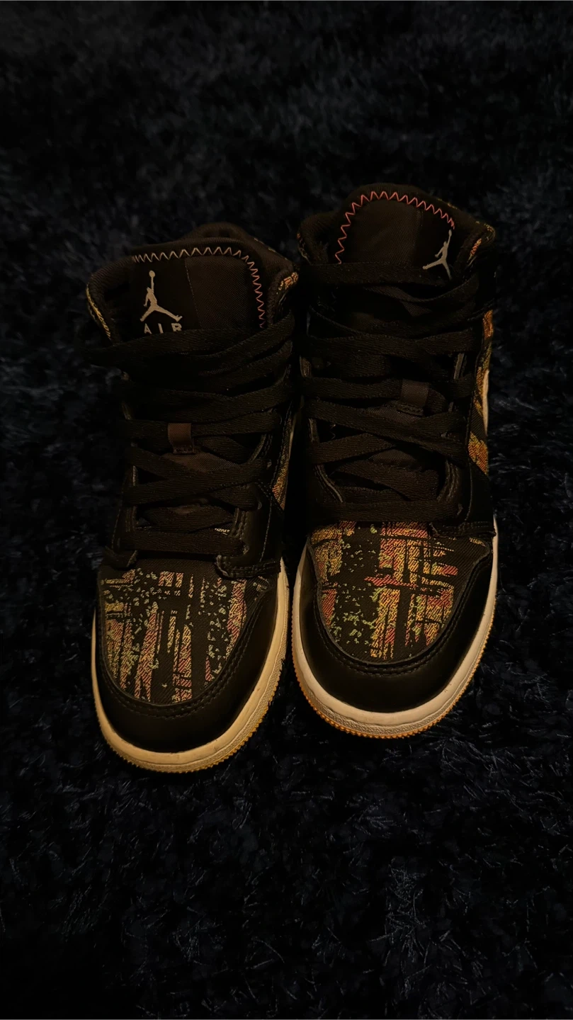 Selling a pair of Nike Air Jordan 1 High sneakers. They have a unique design with black and multicolored accents. Great for adding a stylish touch to any outfit!