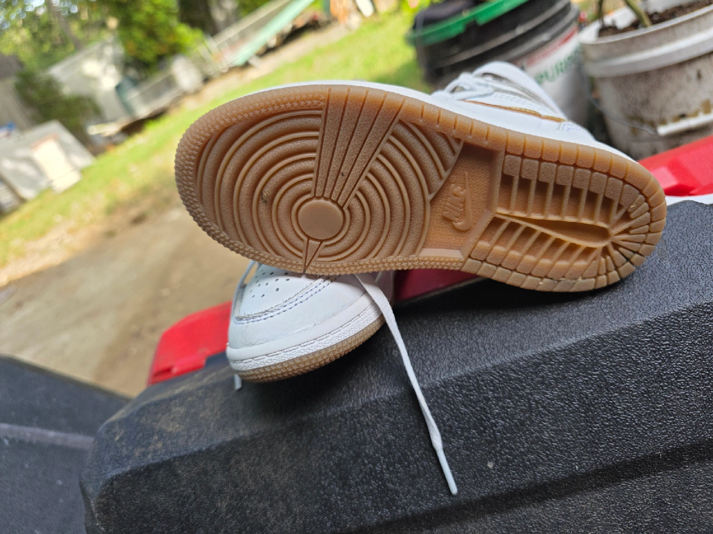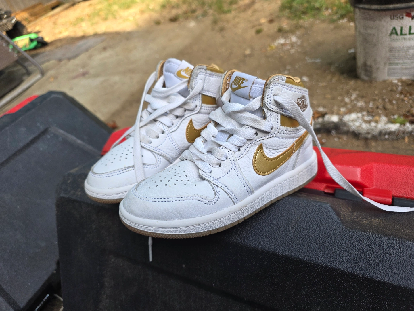 Selling a pair of Nike Air Jordan 1 High toddler shoes in white and gold. These are in good condition and ready for a new home. The soles have a nice grip for little ones learning to walk and run. Perfect for your stylish little one! size 11C. Vender un par de zapatos Nike Air Jordan 1 High para niños pequeños en blanco y dorado. Estos están en buenas condiciones y listos para un nuevo hogar. Las suelas tienen un buen agarre para los pequeños que aprenden a caminar y correr. ¡Perfecto para tu pequeño y elegante! talla 11C