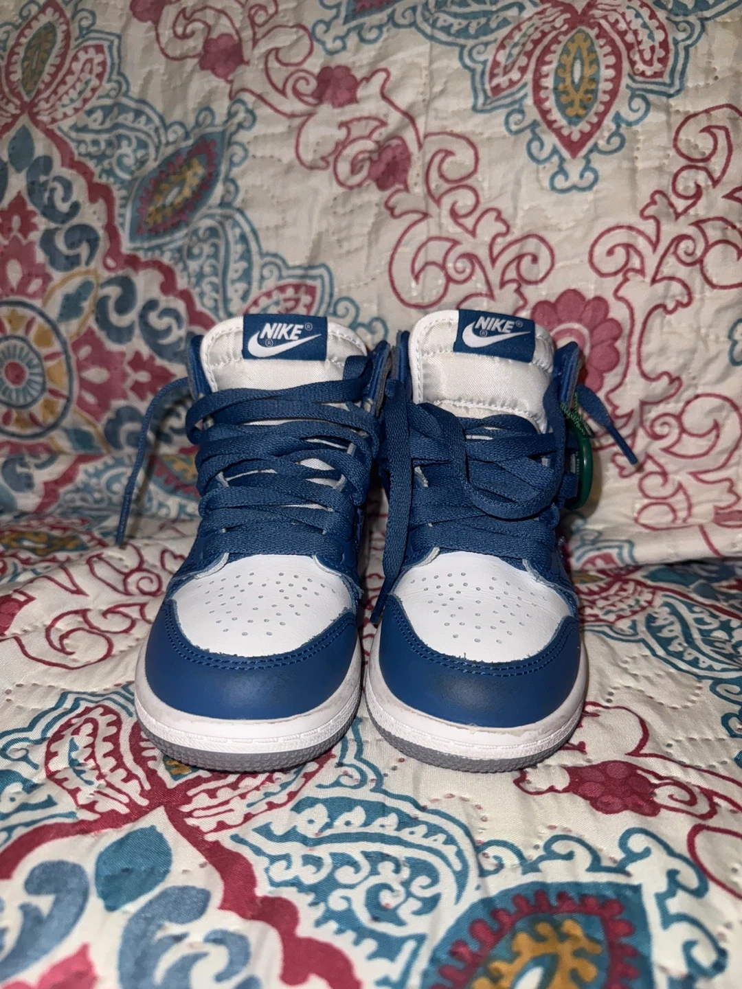 Here are some blue and white Nike Air Jordan 1 high-top sneakers. They're in great shape and ready for a new home! Size 11