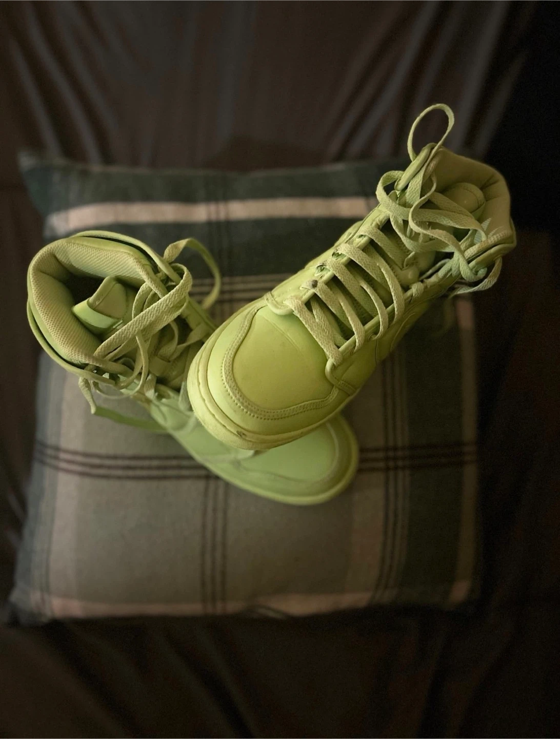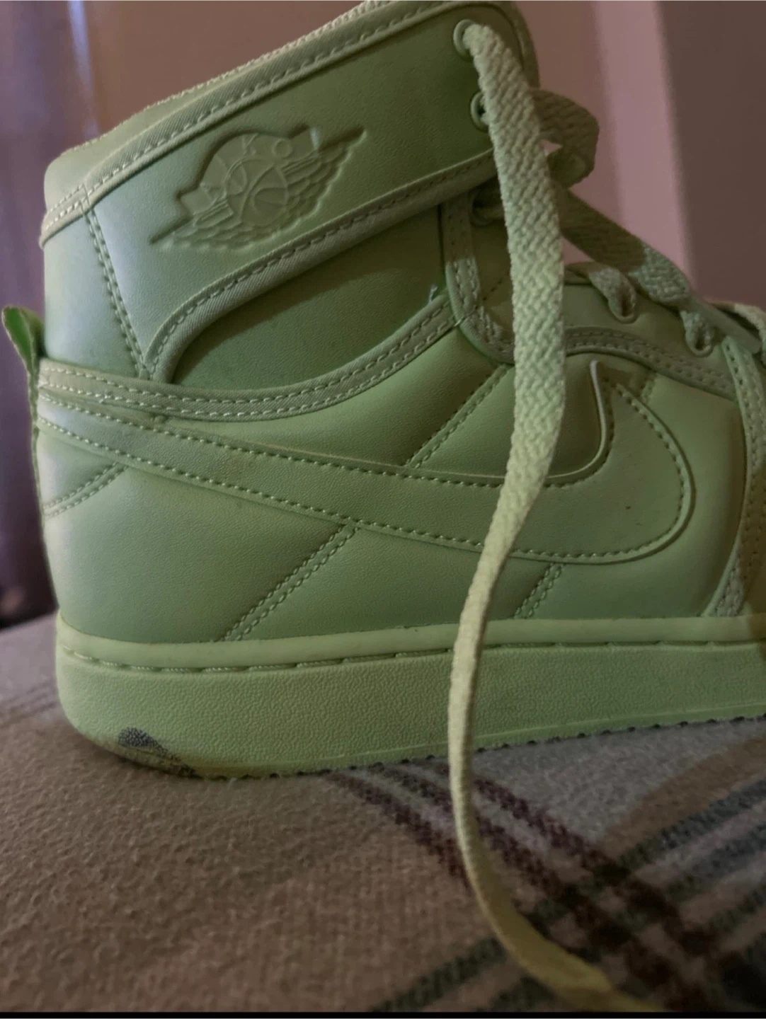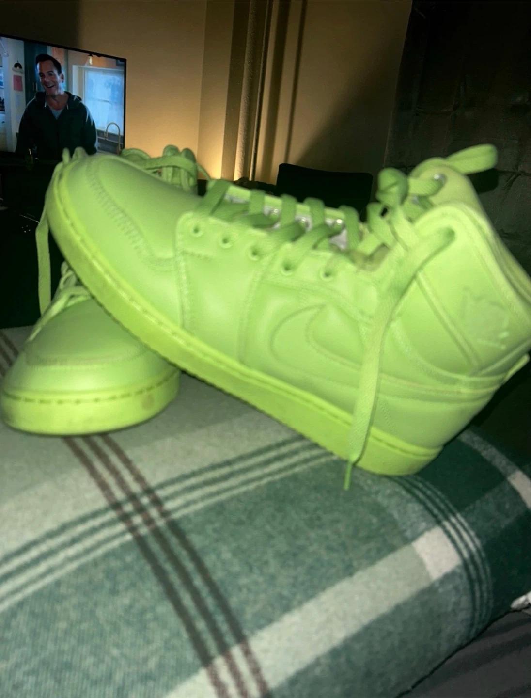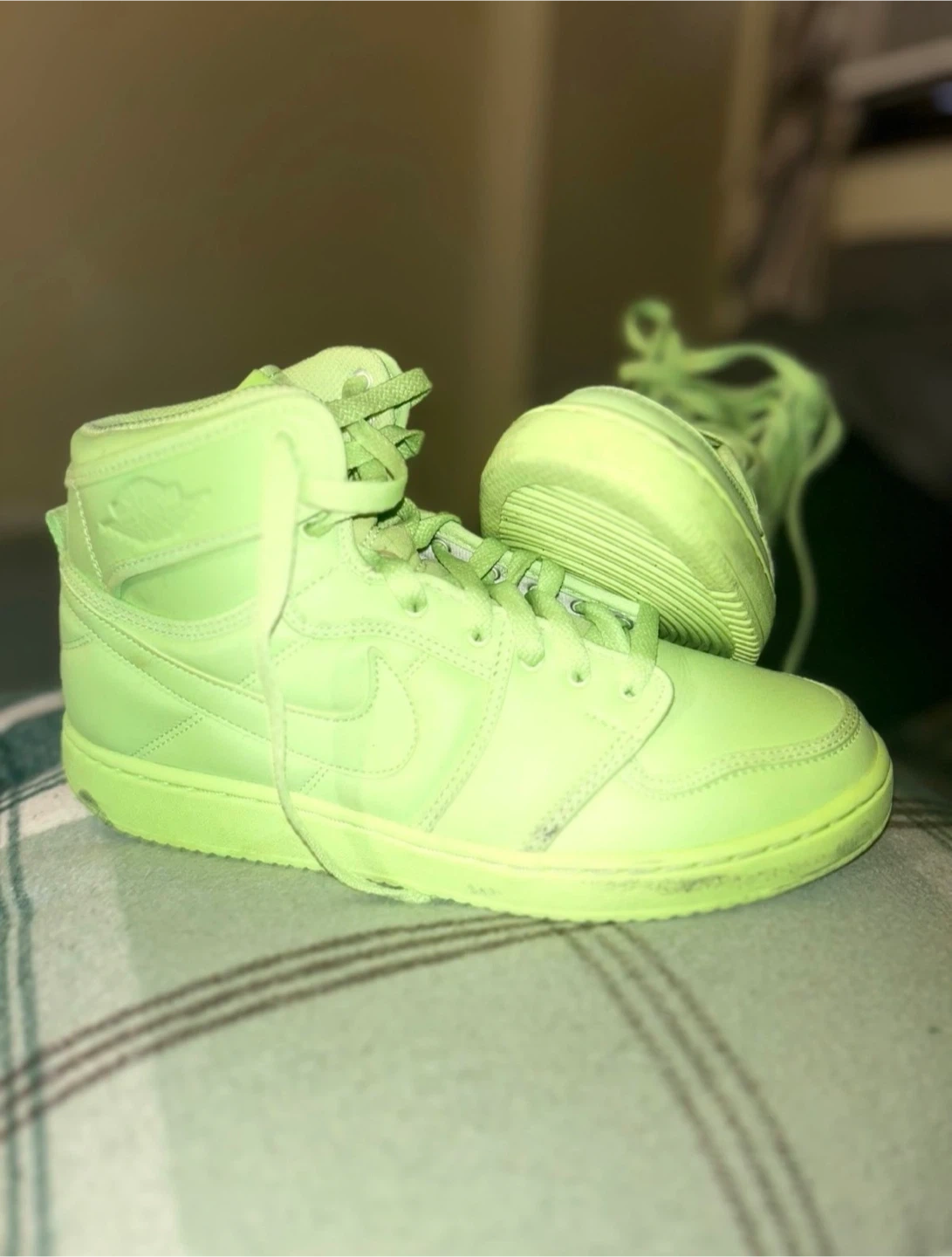 Selling a pair of Nike Air Jordan 1 High sneakers in a vivid green color. These shoes are in good condition and ready for a new home! They feature the classic Air Jordan 1 silhouette with a high-top design. Perfect for adding a pop of color to your wardrobe Billie Eilish Volt 2021 High Top Sneakers - Green