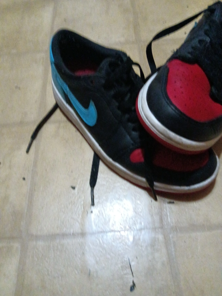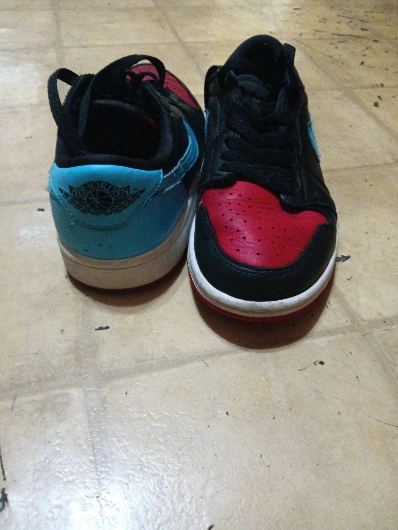Just in time for school gear shopping!Selling a pair of Nike Air Jordan 1 Low sneakers in black, red, and blue! They show some signs of wear, but still have plenty of life left. Great for casual wear or hitting the court , what u see is is just the picture in person they are much clearer and cleaner!!