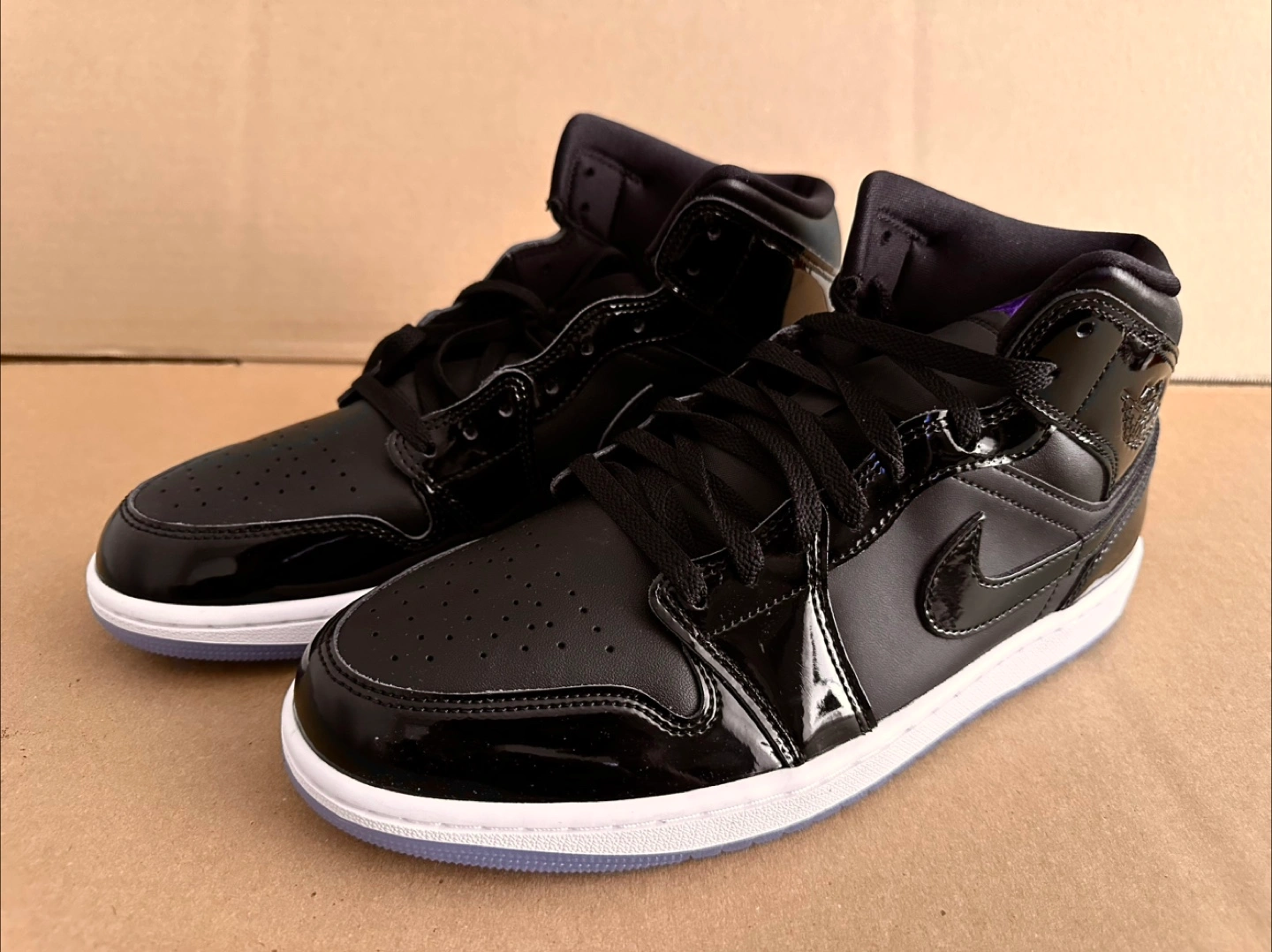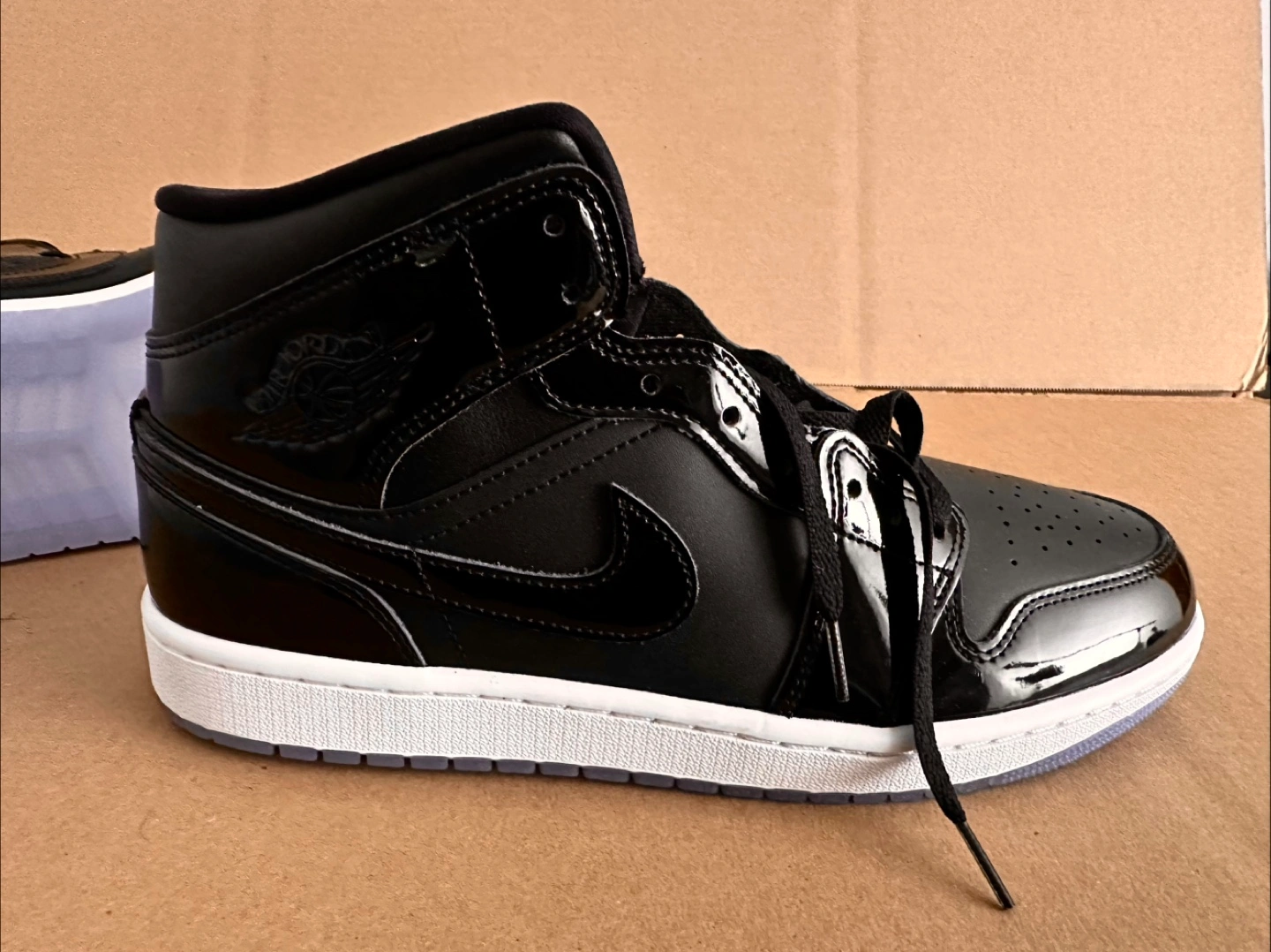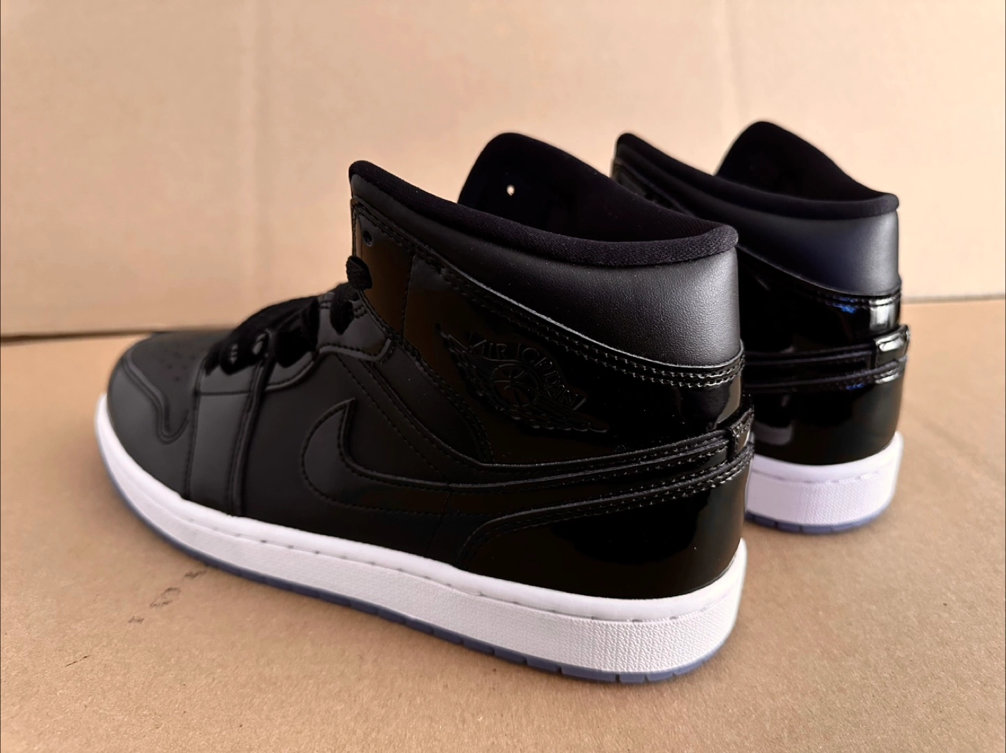 Here's a pair of Nike Air Jordan 1 Mid in black. They have a sleek look with a glossy finish and a clear sole. Great condition and ready for a new home. Brand new without box.