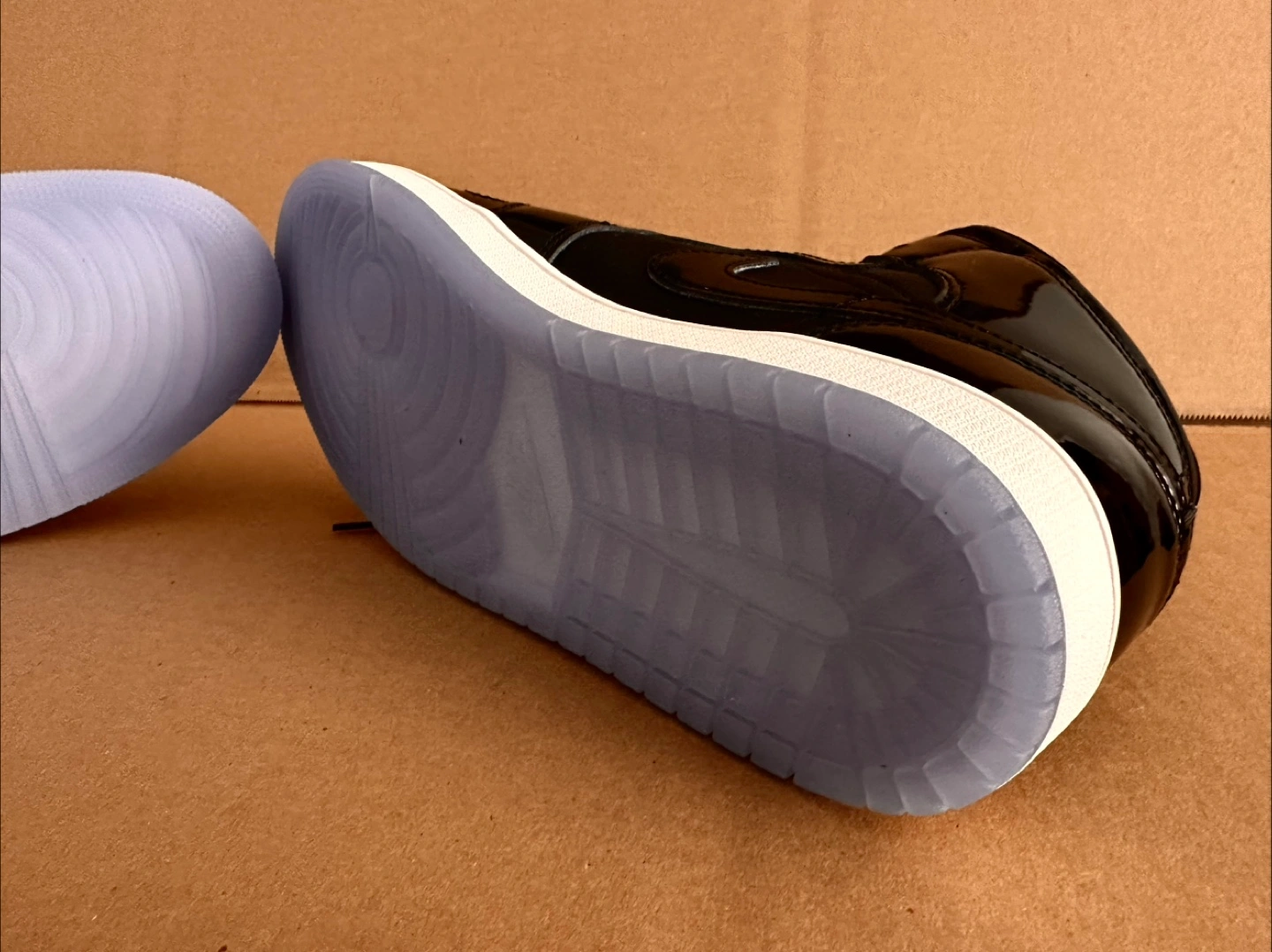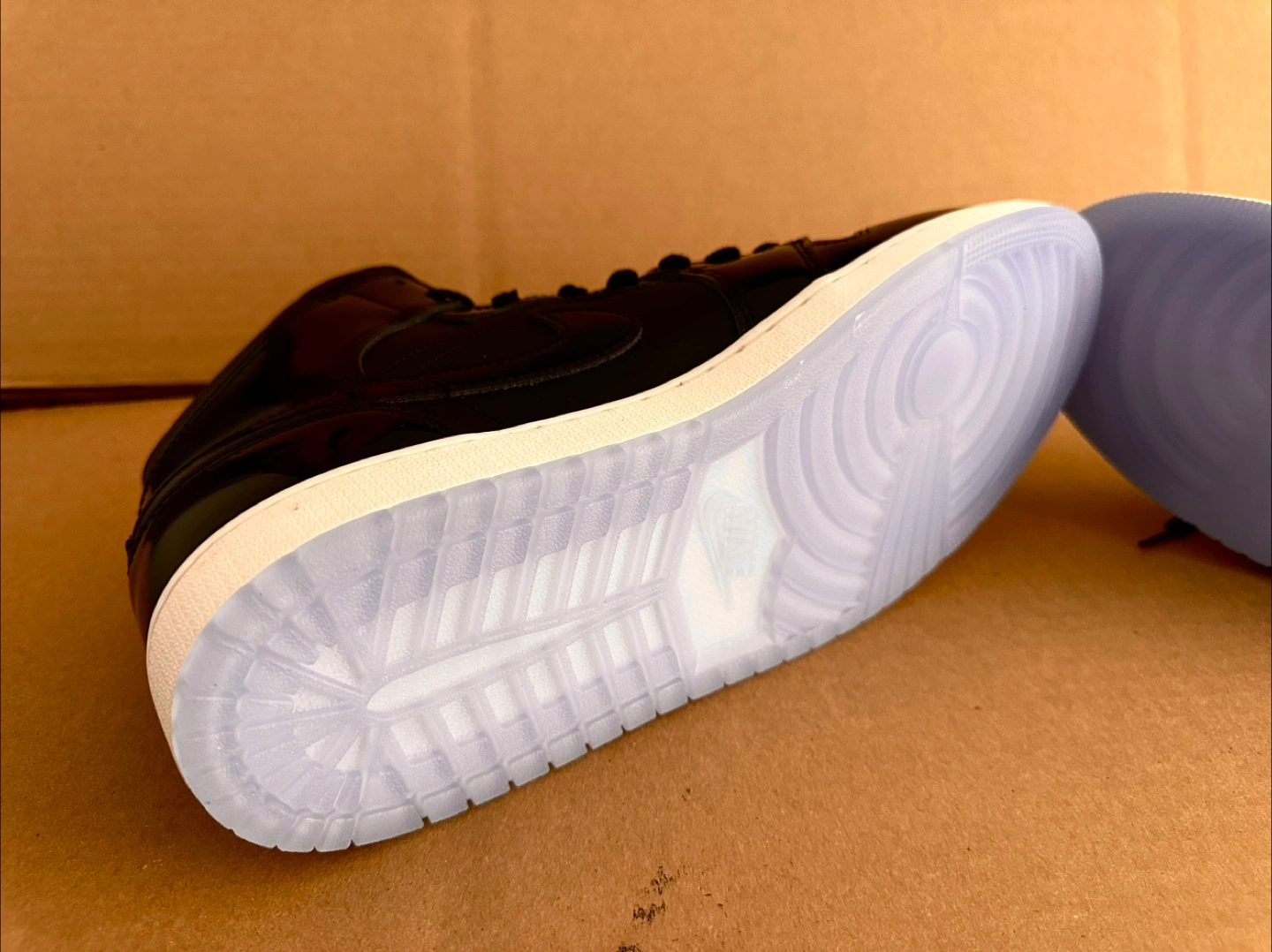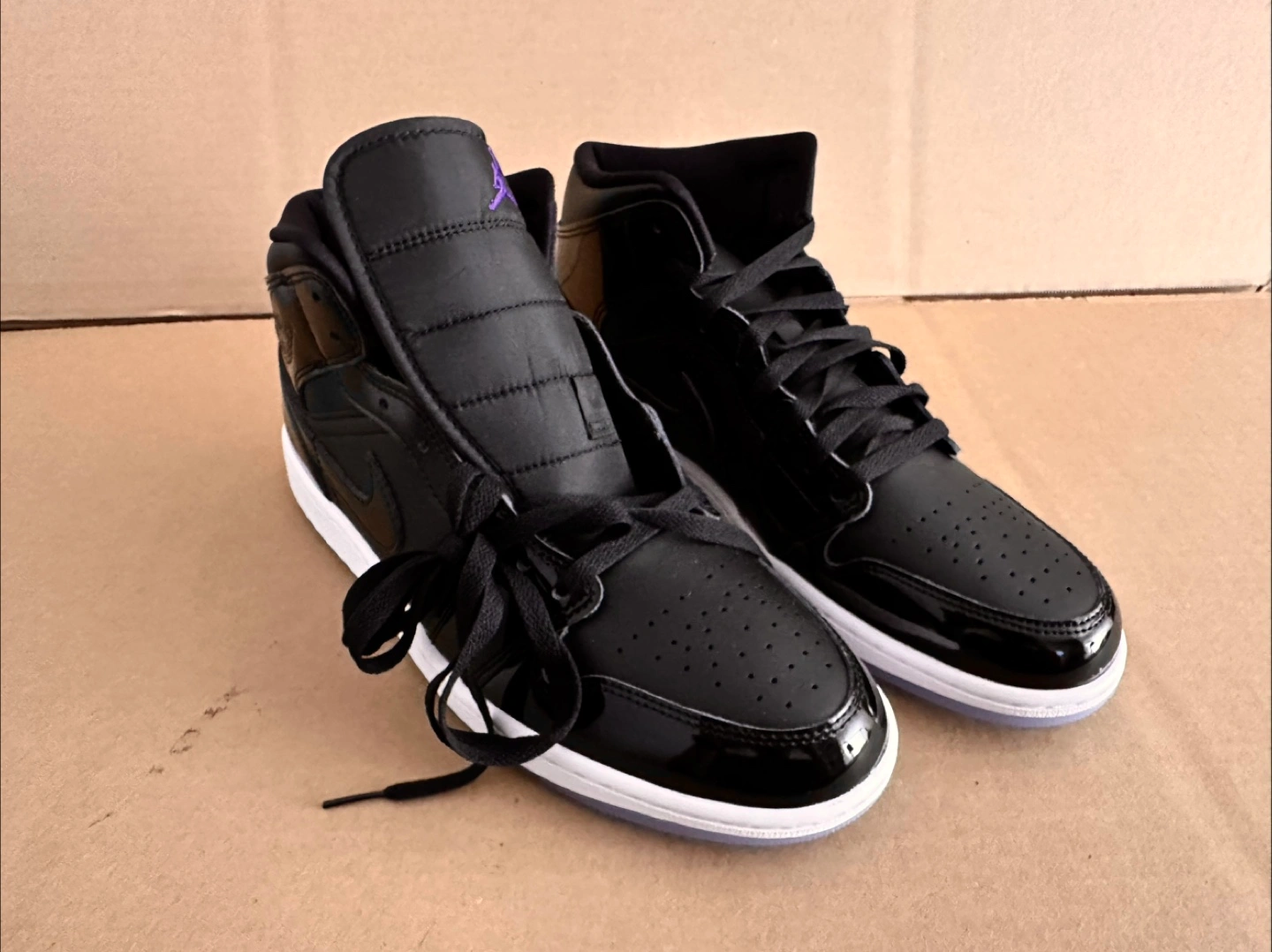 Here's a pair of Nike Air Jordan 1 Mid in black. They have a sleek look with a glossy finish and a clear sole. Great condition and ready for a new home. Brand new without box.
