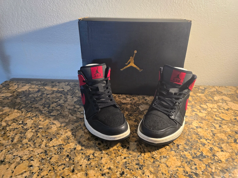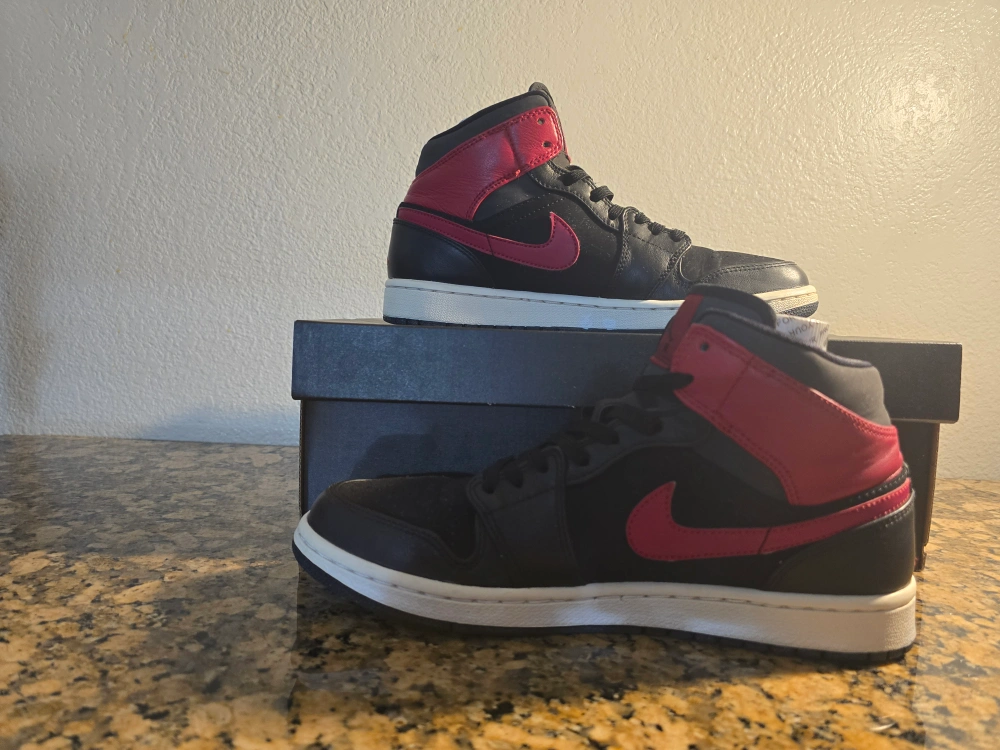 Selling a pair of PRE-OWNED Nike Air Jordan 1 Mid Bred Black Red These shoes are in great condition and ready for a new home!