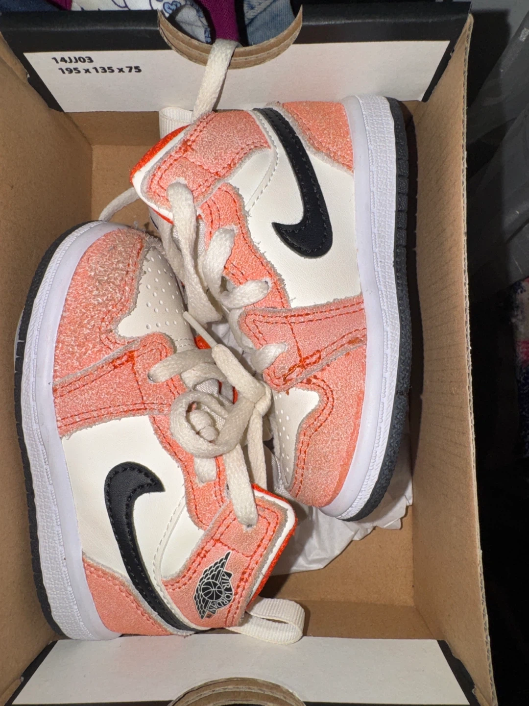 65Here are some cute toddler Nike Air Jordan 1 Mid SE shoes in a coral chalk color! They come with the original box. These are great for your little one!