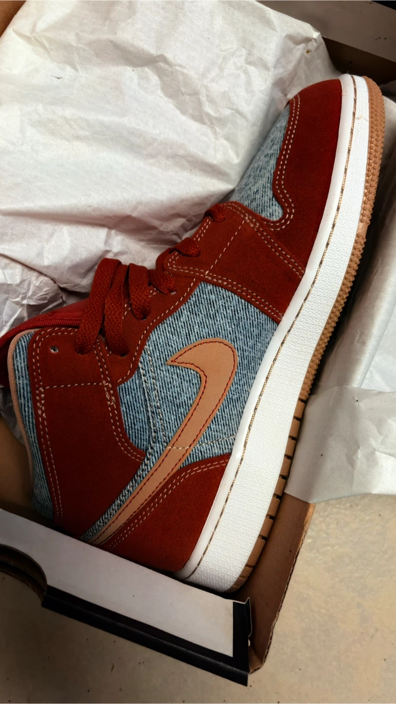 10Selling a pair of Nike Air Jordan 1 Mid SE shoes in a unique rust and denim colorway! These are in great condition and come with the original box. Perfect for adding a stylish touch to your wardrobe