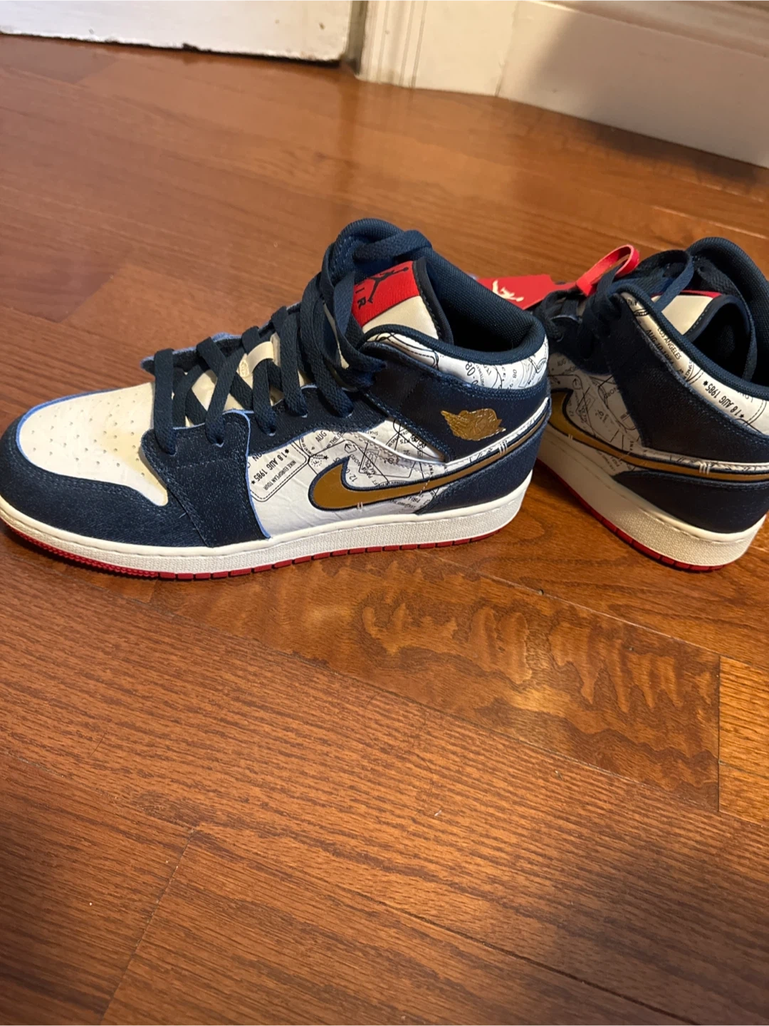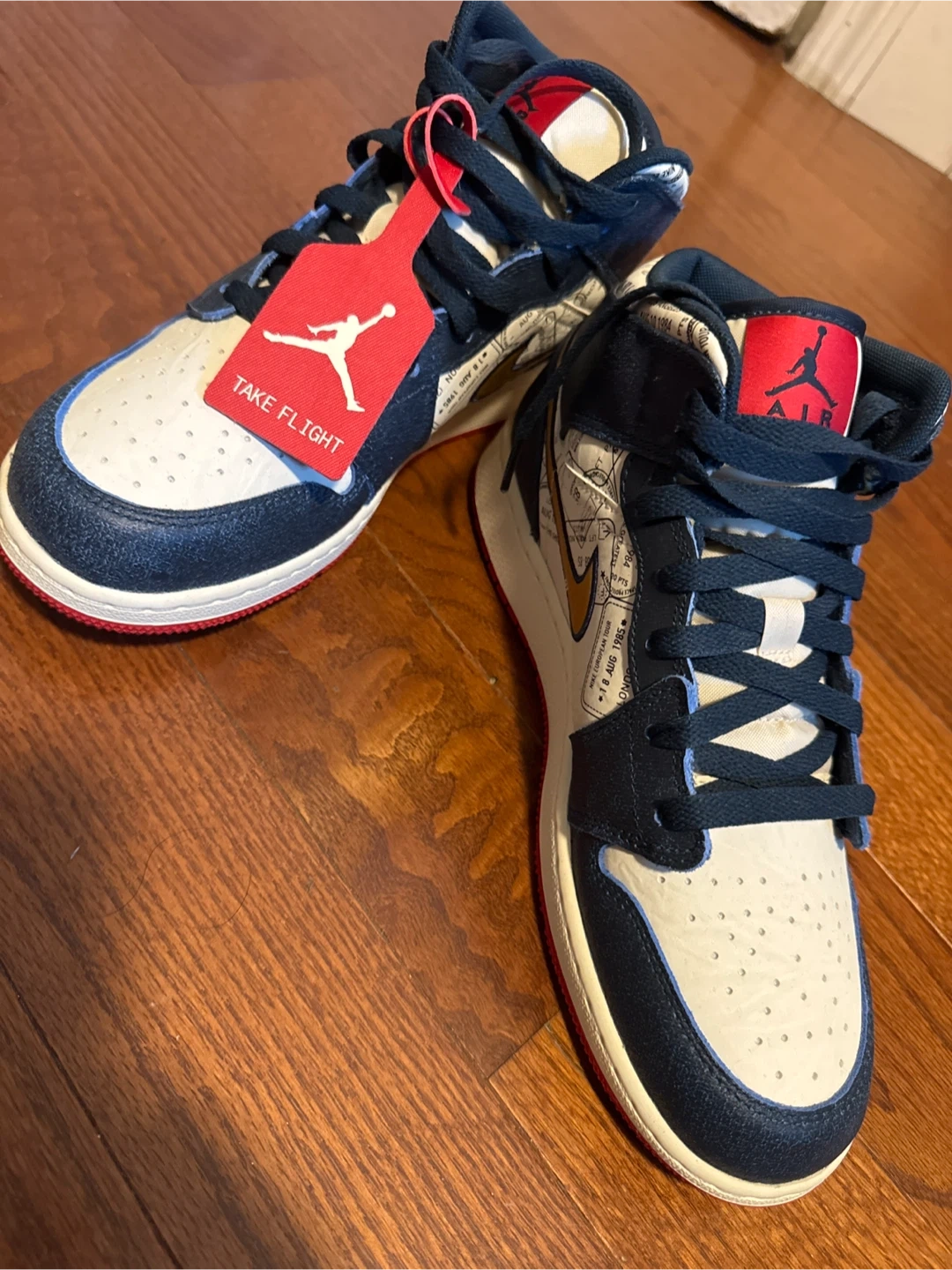 Here are a pair of Nike Air Jordan 1 Mid Take Flight sneakers. They feature a navy, white, and red color scheme with a unique design. Great for everyday wear or adding to your collection!