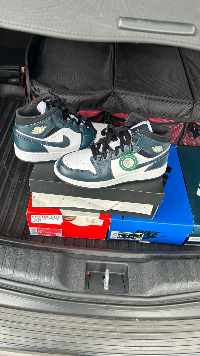 65Selling a pair of Nike Air Jordan 1 Mid sneakers in teal and white. They are size 6Y and come with the original box.